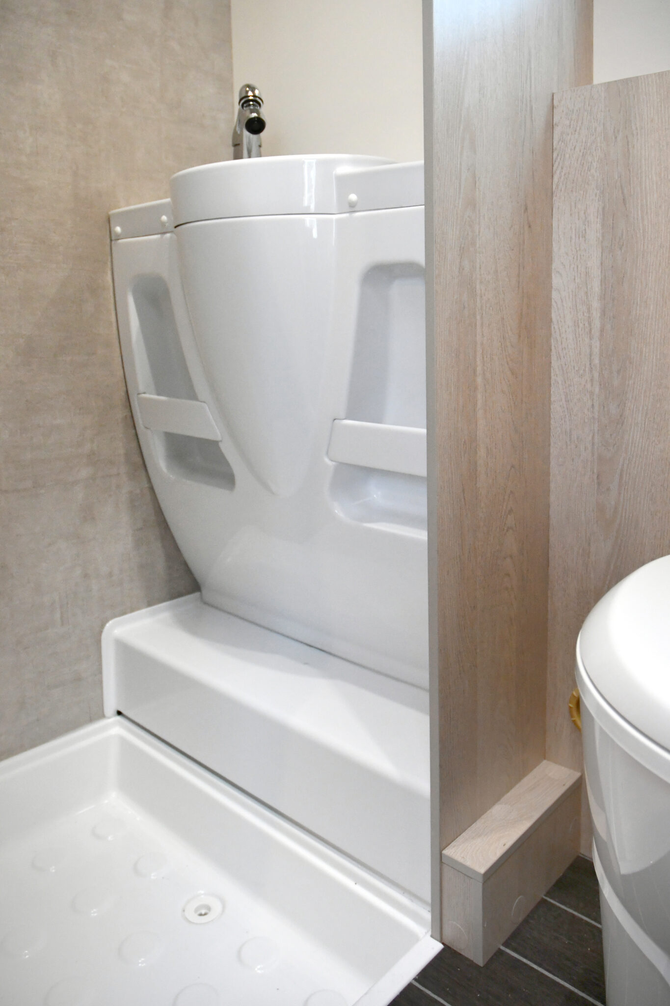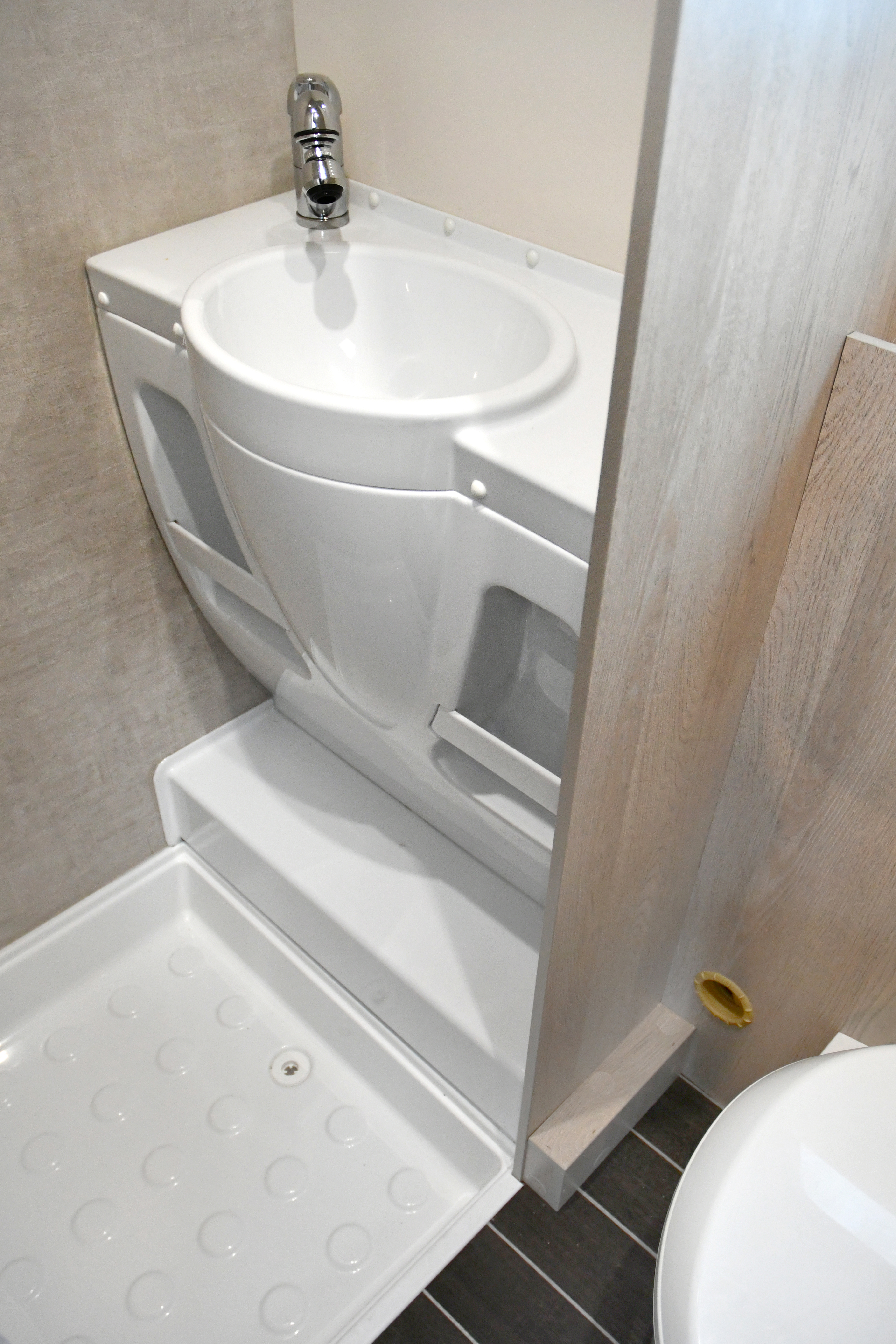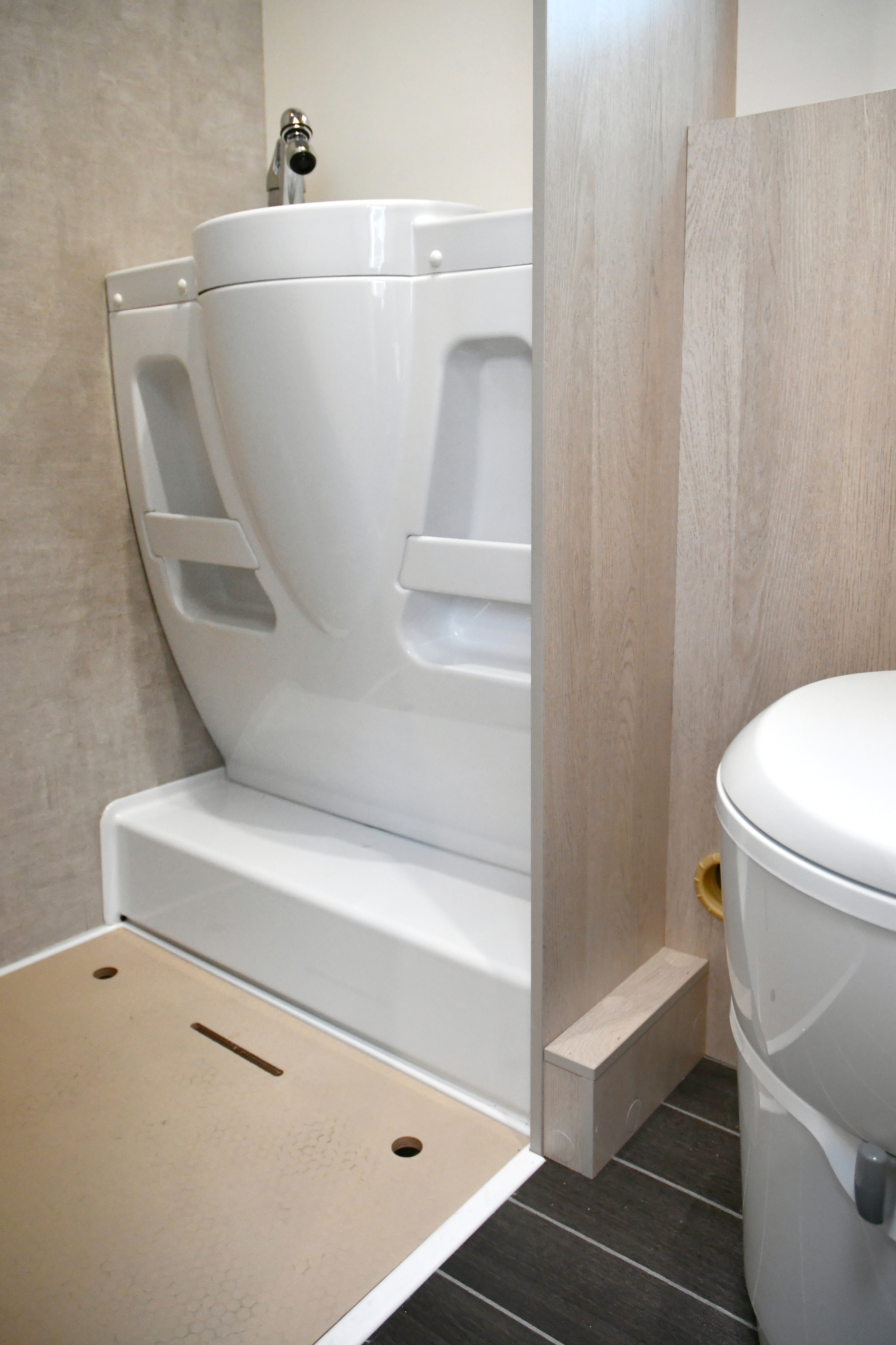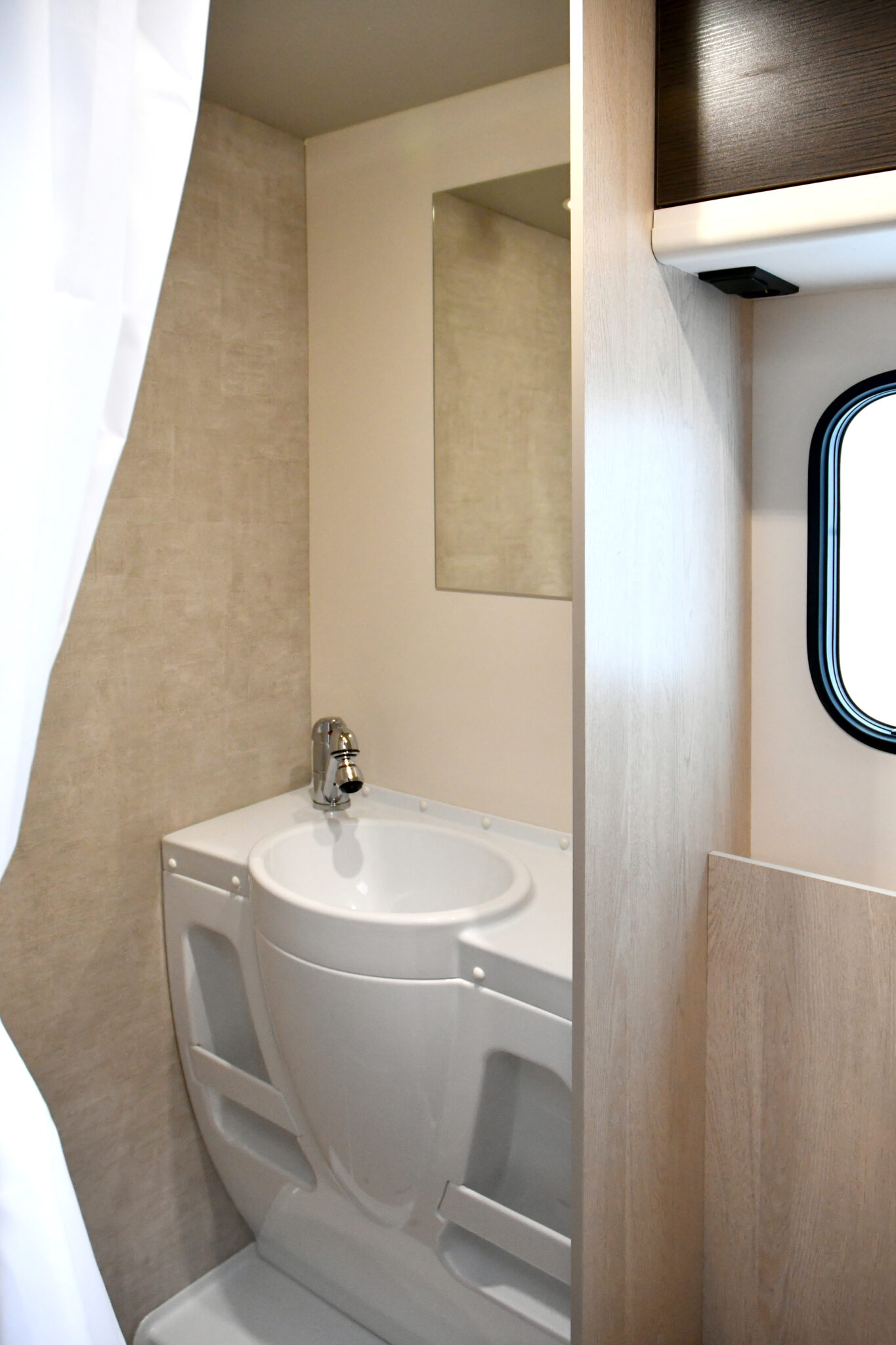 Łazienka oferuje wysoki poziom komfortu dzięki oddzielnemu prysznicowi, co jest rzadkością w kamperach tej klasy wielkości.