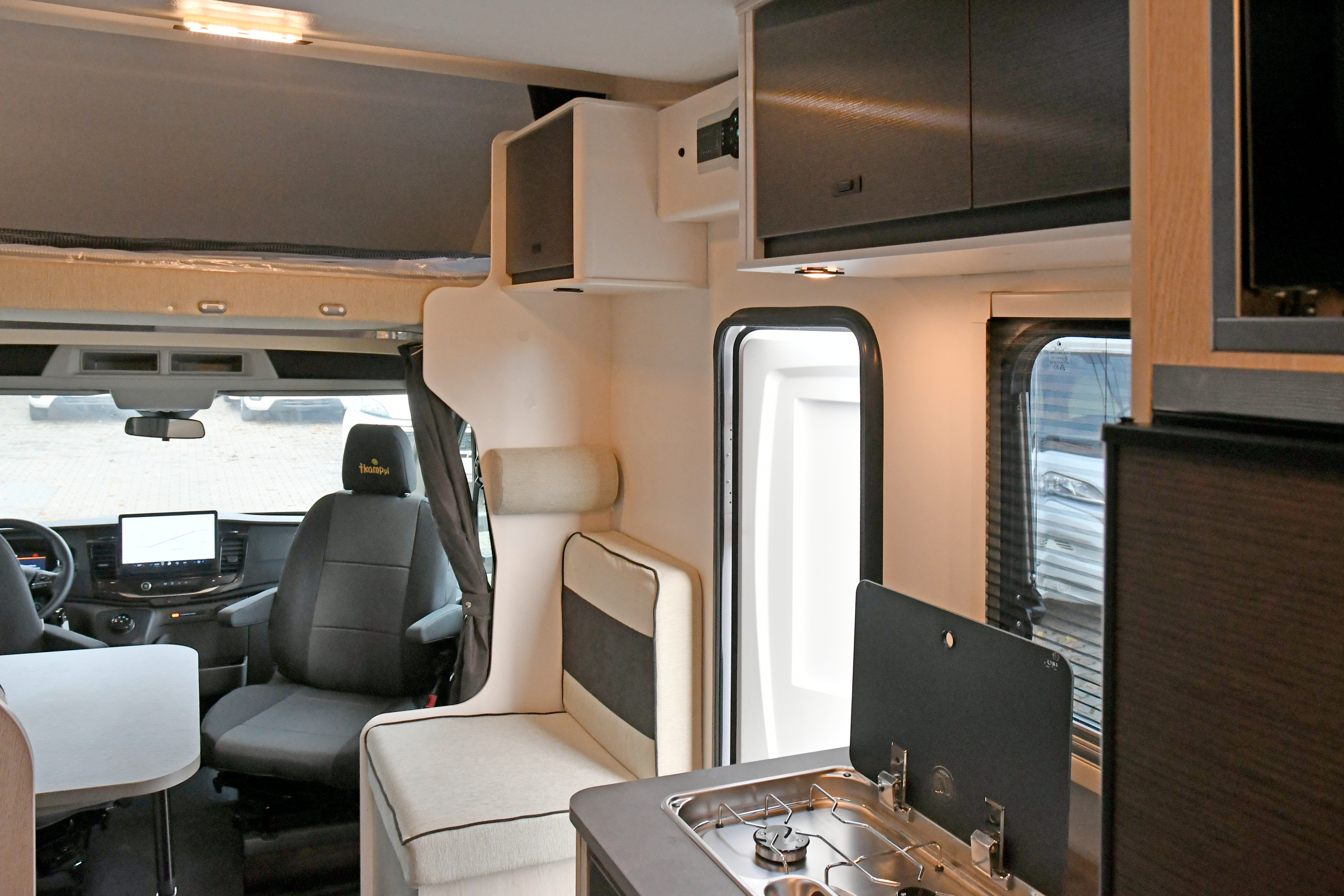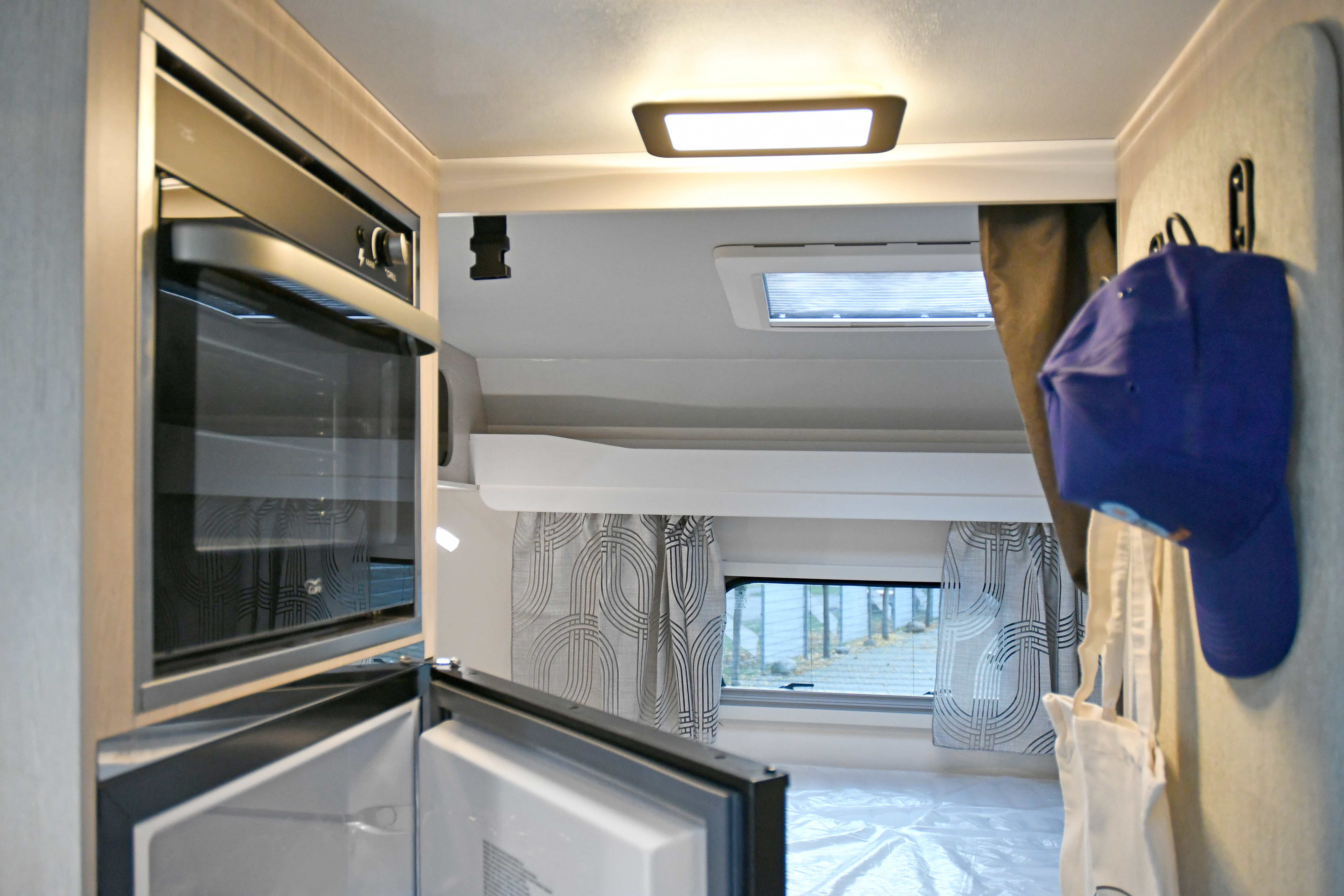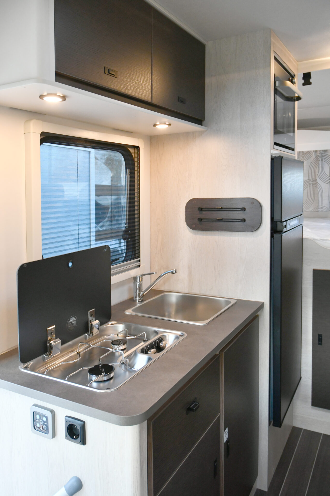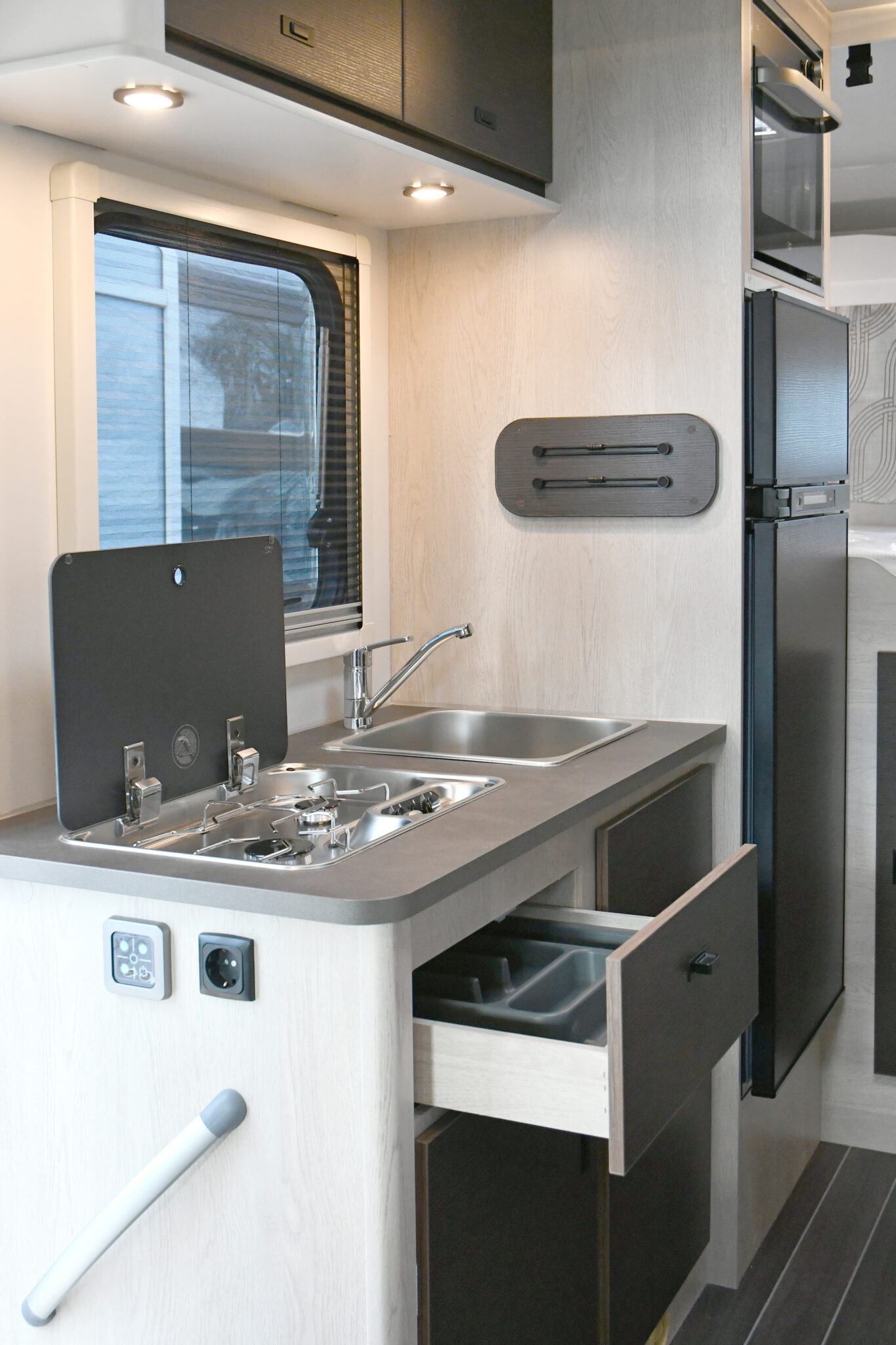 Aneks kuchenny został wyposażony w lodówkę, zlewozmywak oraz dwupalnikową kuchenkę gazową, a także praktyczny blat roboczy, który ułatwia przygotowywanie posiłków w podróży. Do dyspozycji użytkowników jest również szafa z drążkiem na wieszaki, dedykowane miejsce na telewizor oraz liczne półki i schowki, pozwalające na wygodne przechowywanie bagażu i akcesoriów.