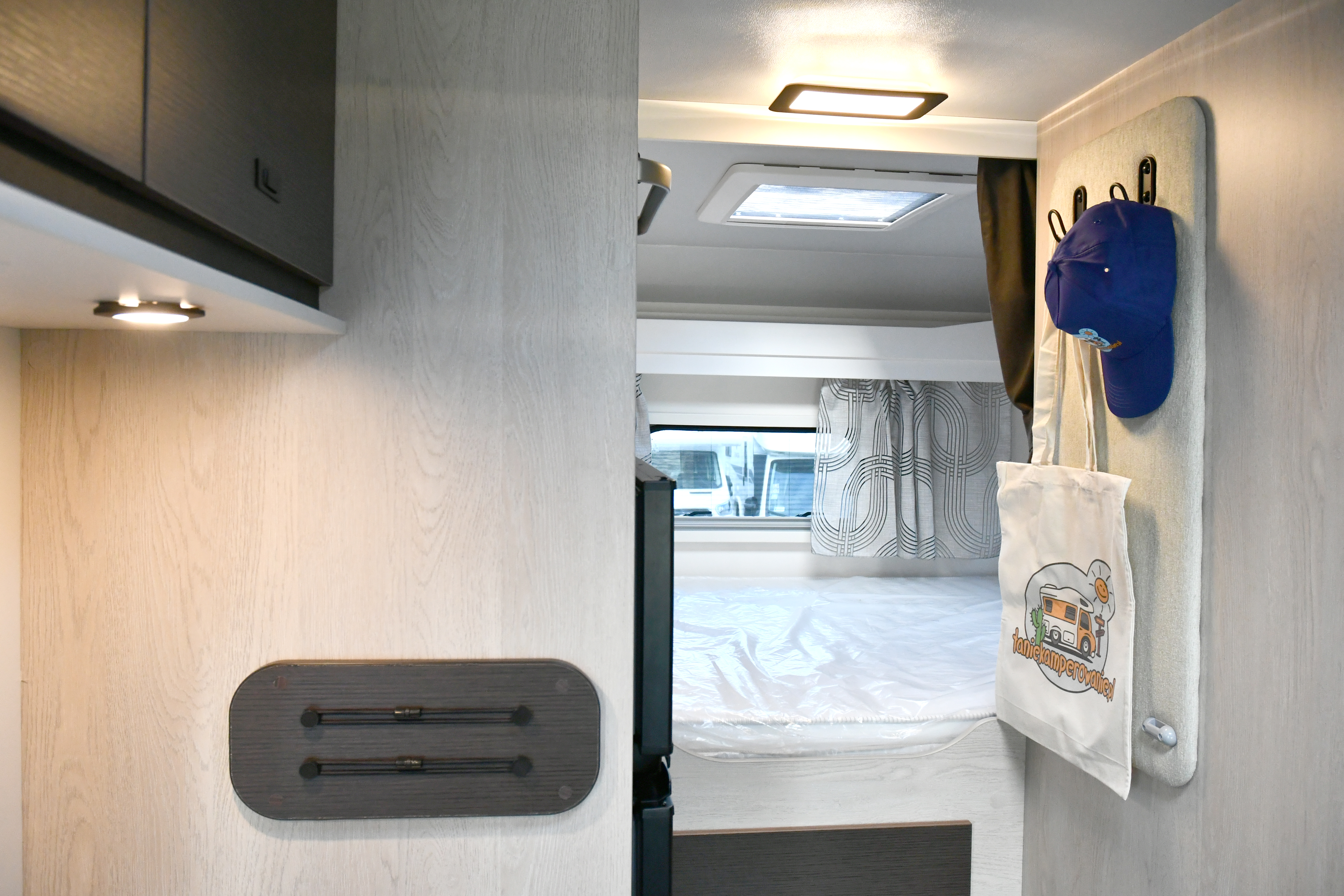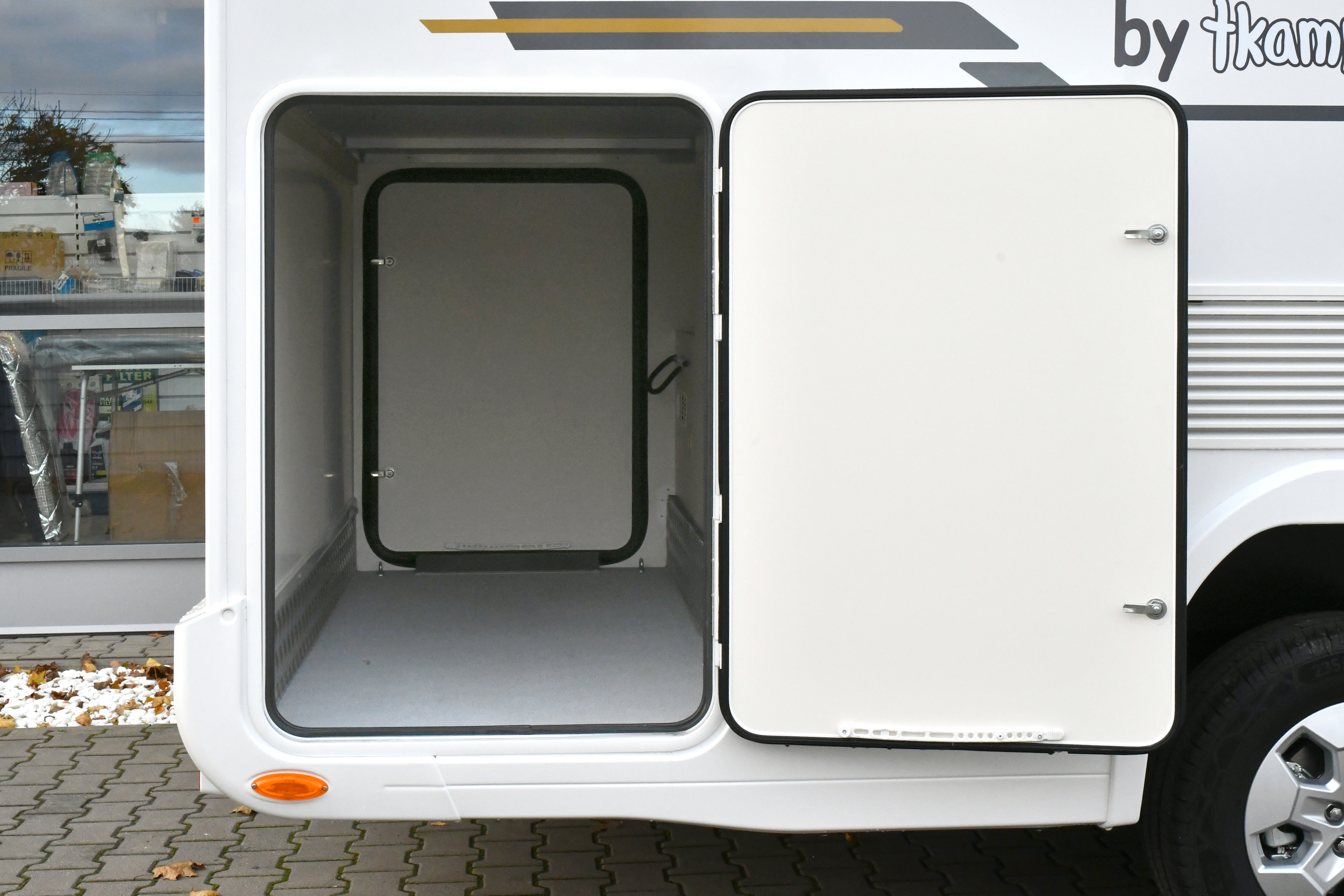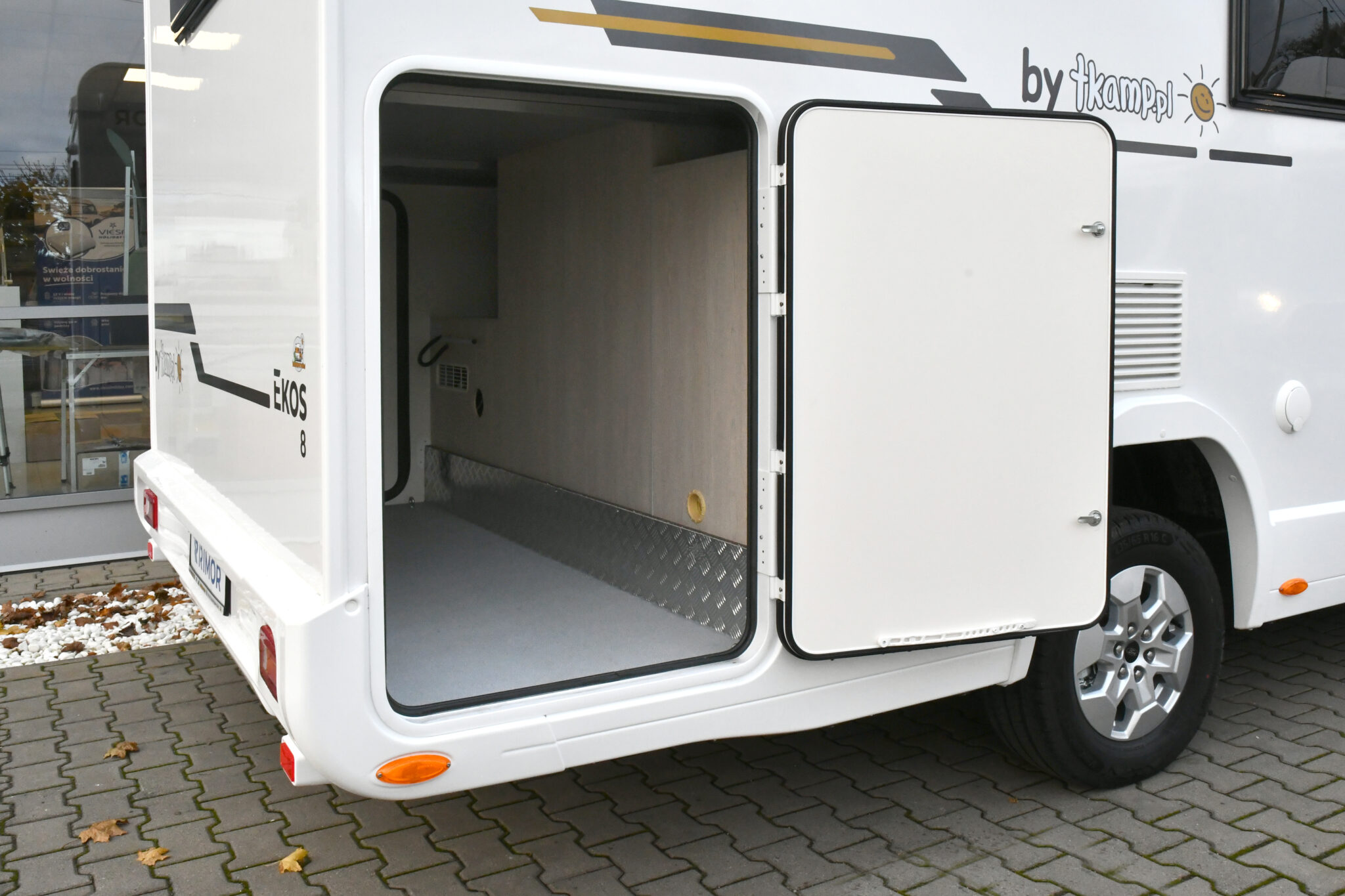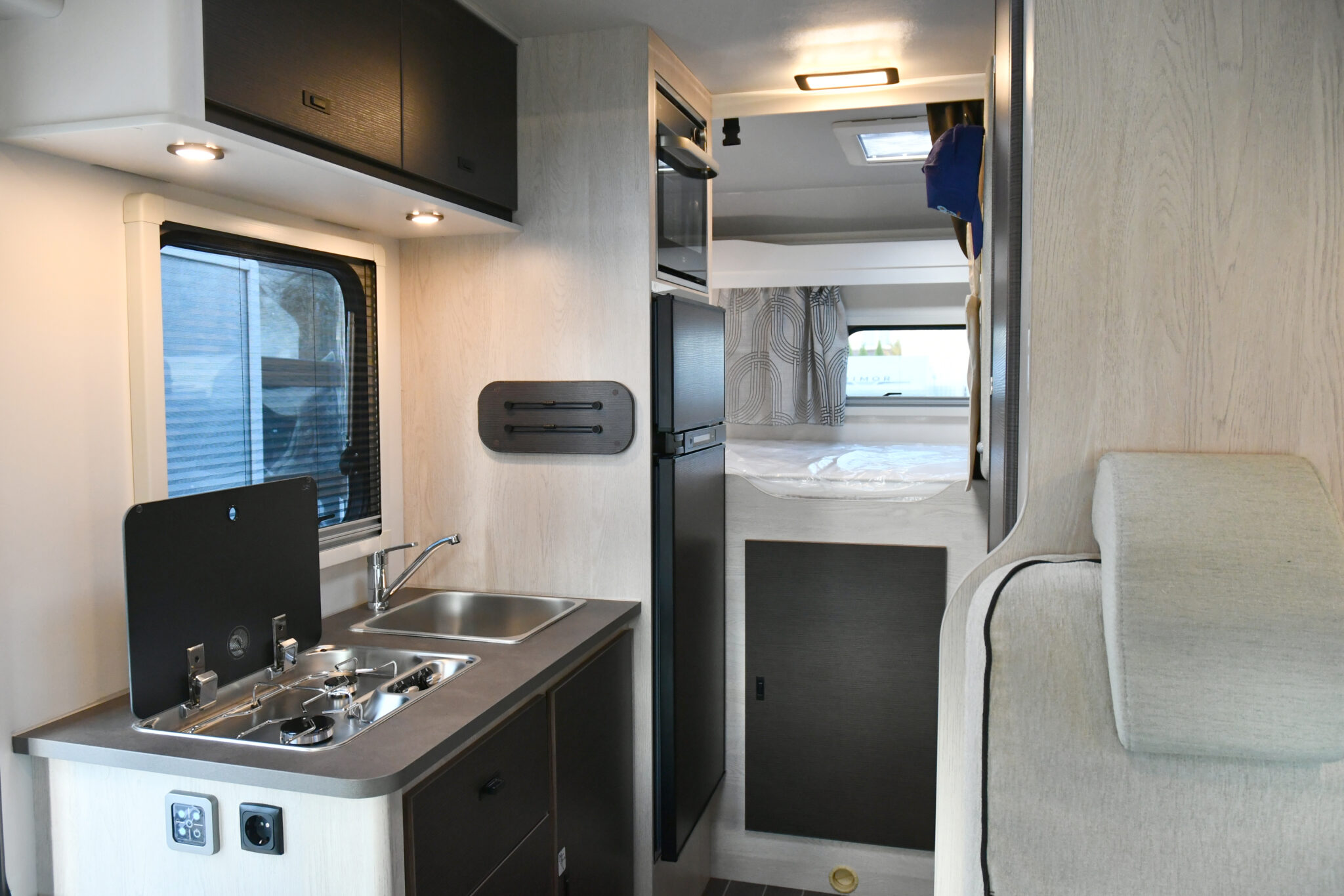 Aneks kuchenny został wyposażony w lodówkę, zlewozmywak oraz dwupalnikową kuchenkę gazową, a także praktyczny blat roboczy, który ułatwia przygotowywanie posiłków w podróży. Do dyspozycji użytkowników jest również szafa z drążkiem na wieszaki, dedykowane miejsce na telewizor oraz liczne półki i schowki, pozwalające na wygodne przechowywanie bagażu i akcesoriów.