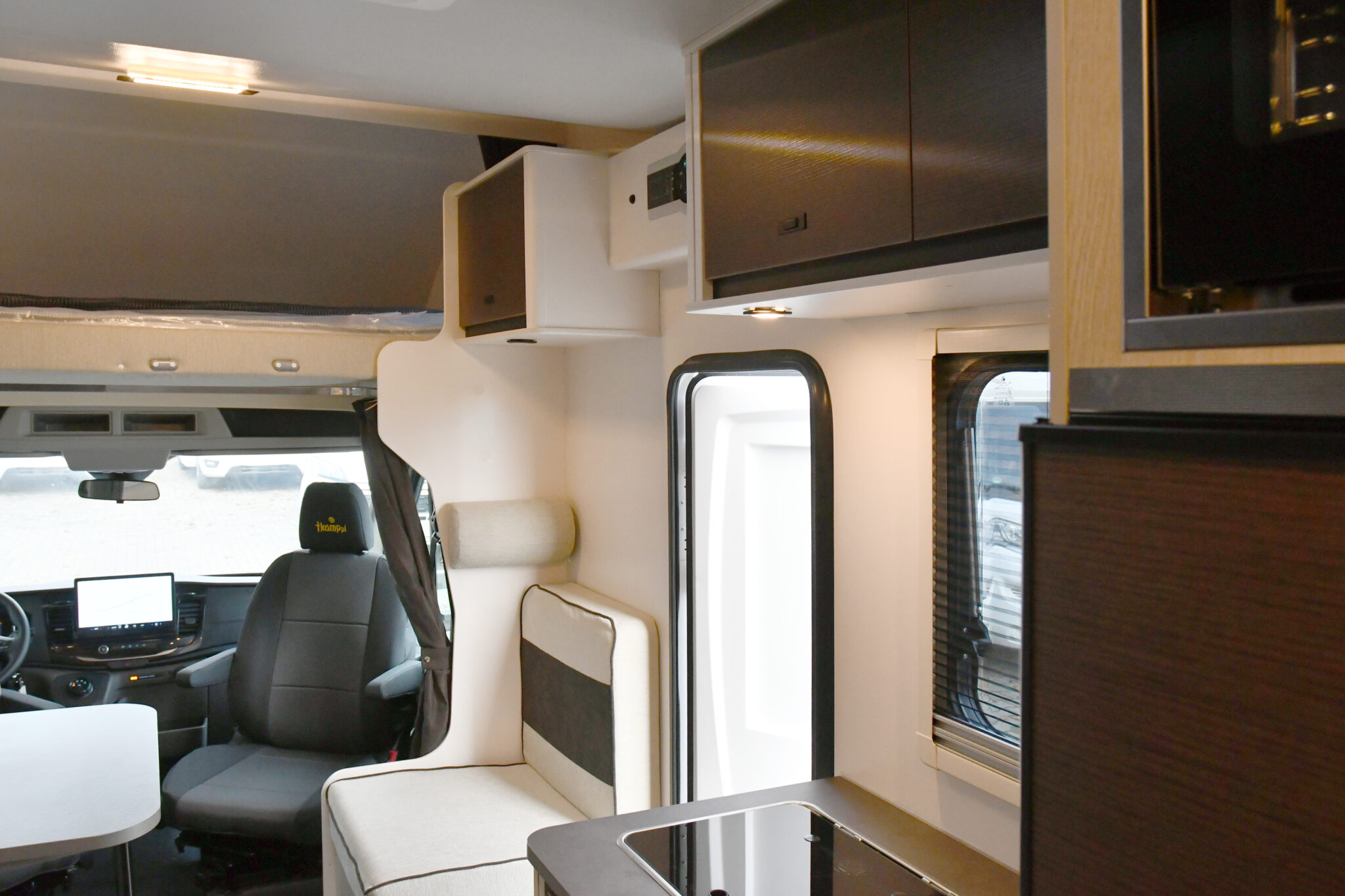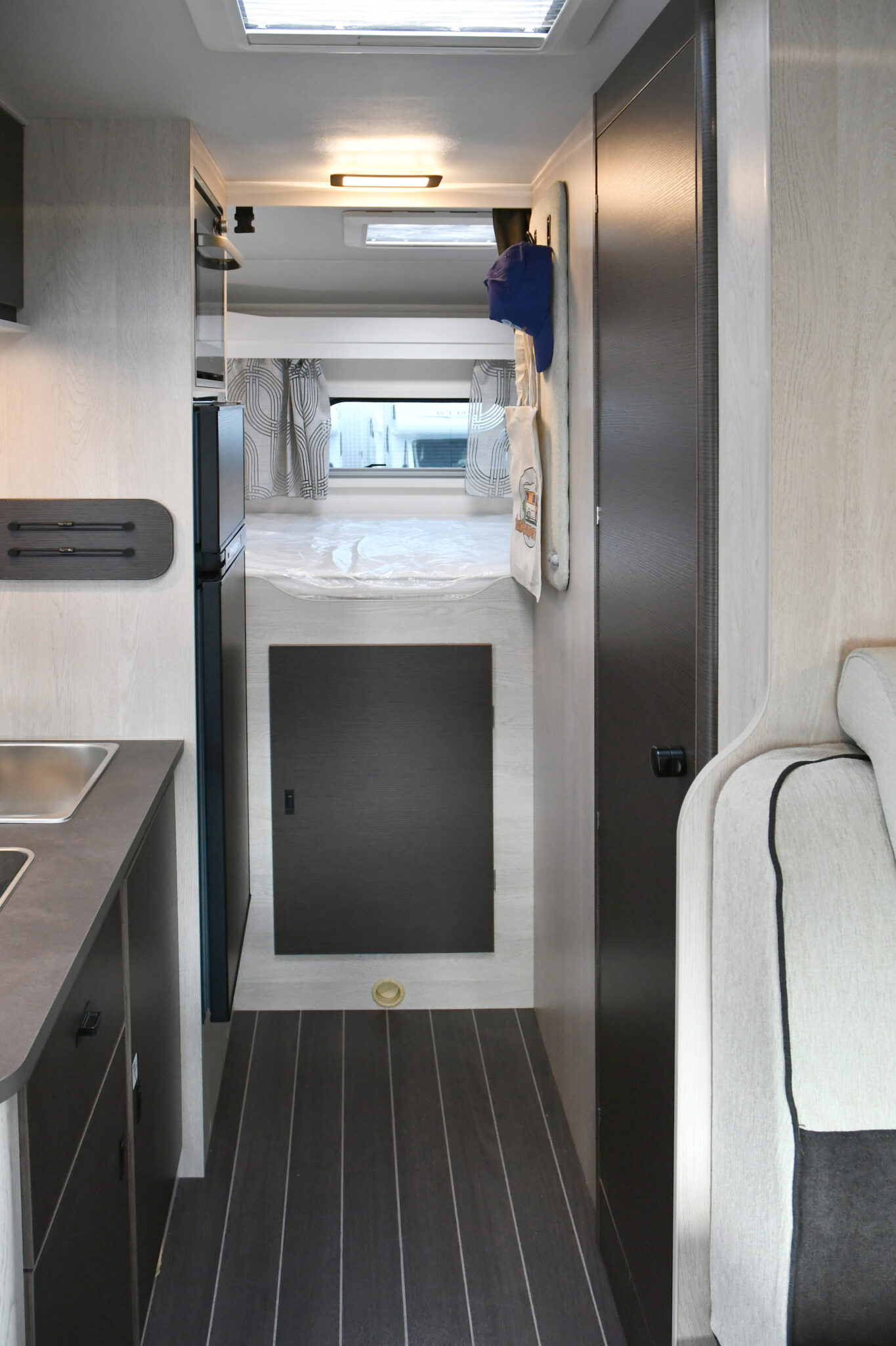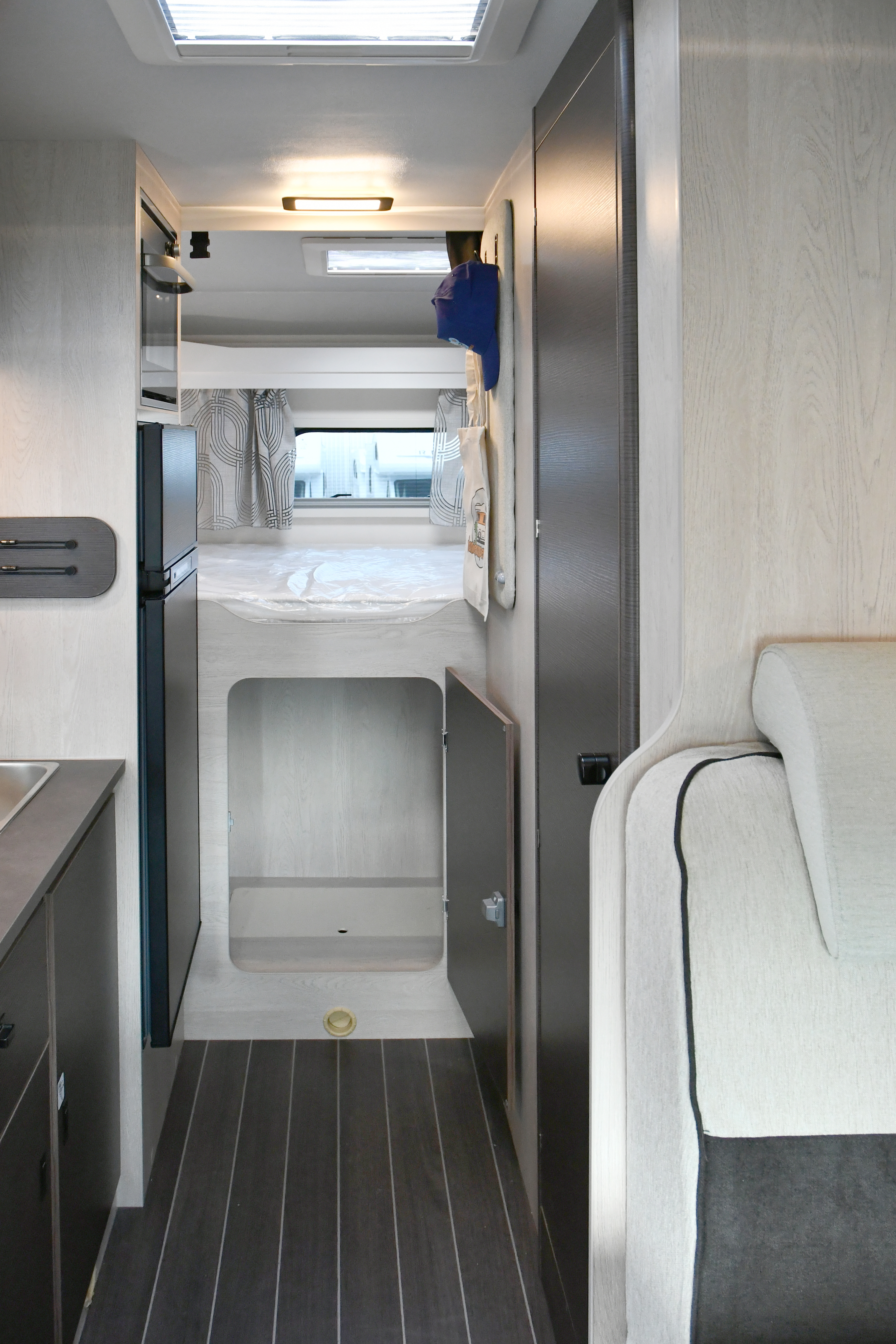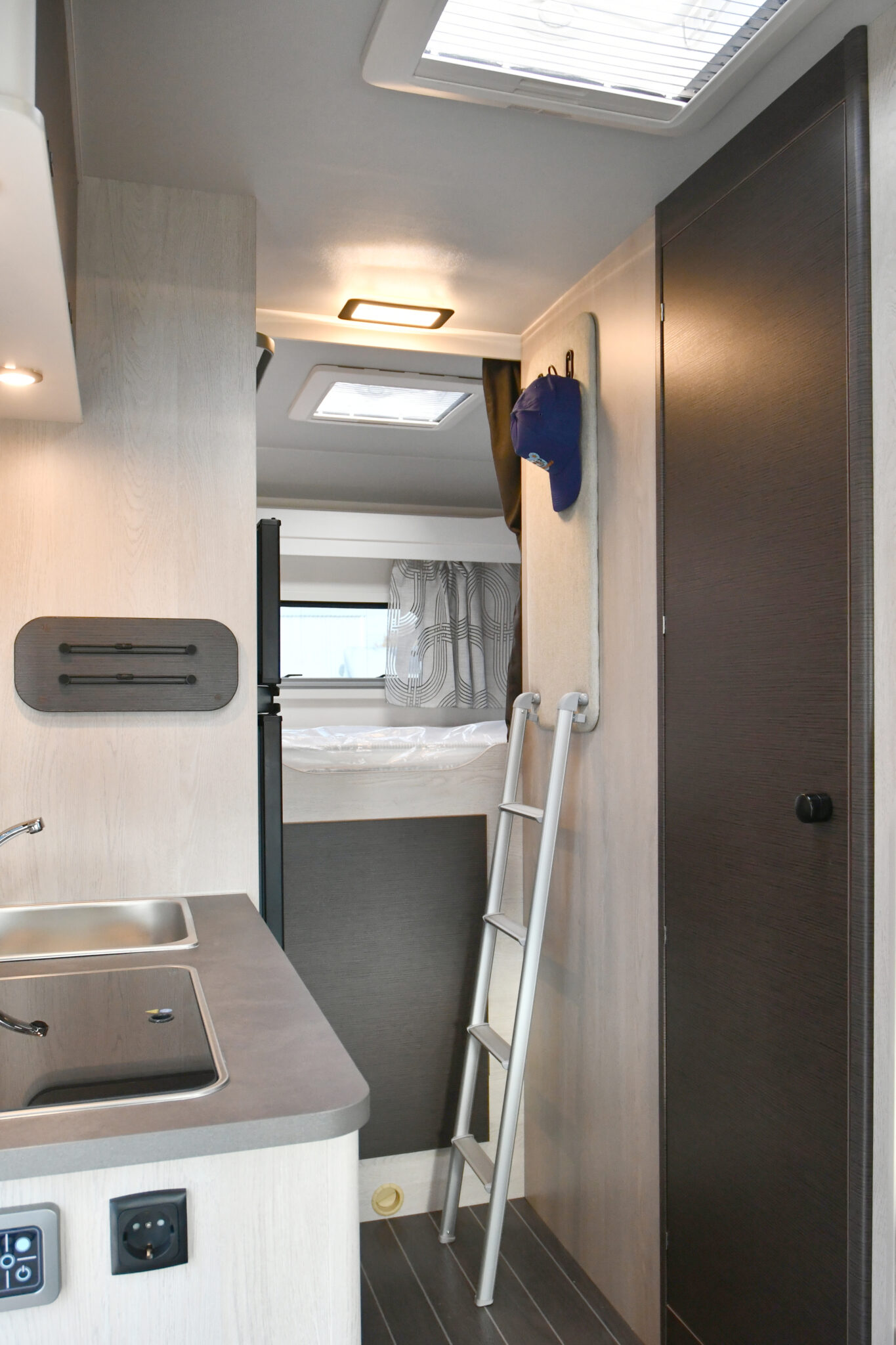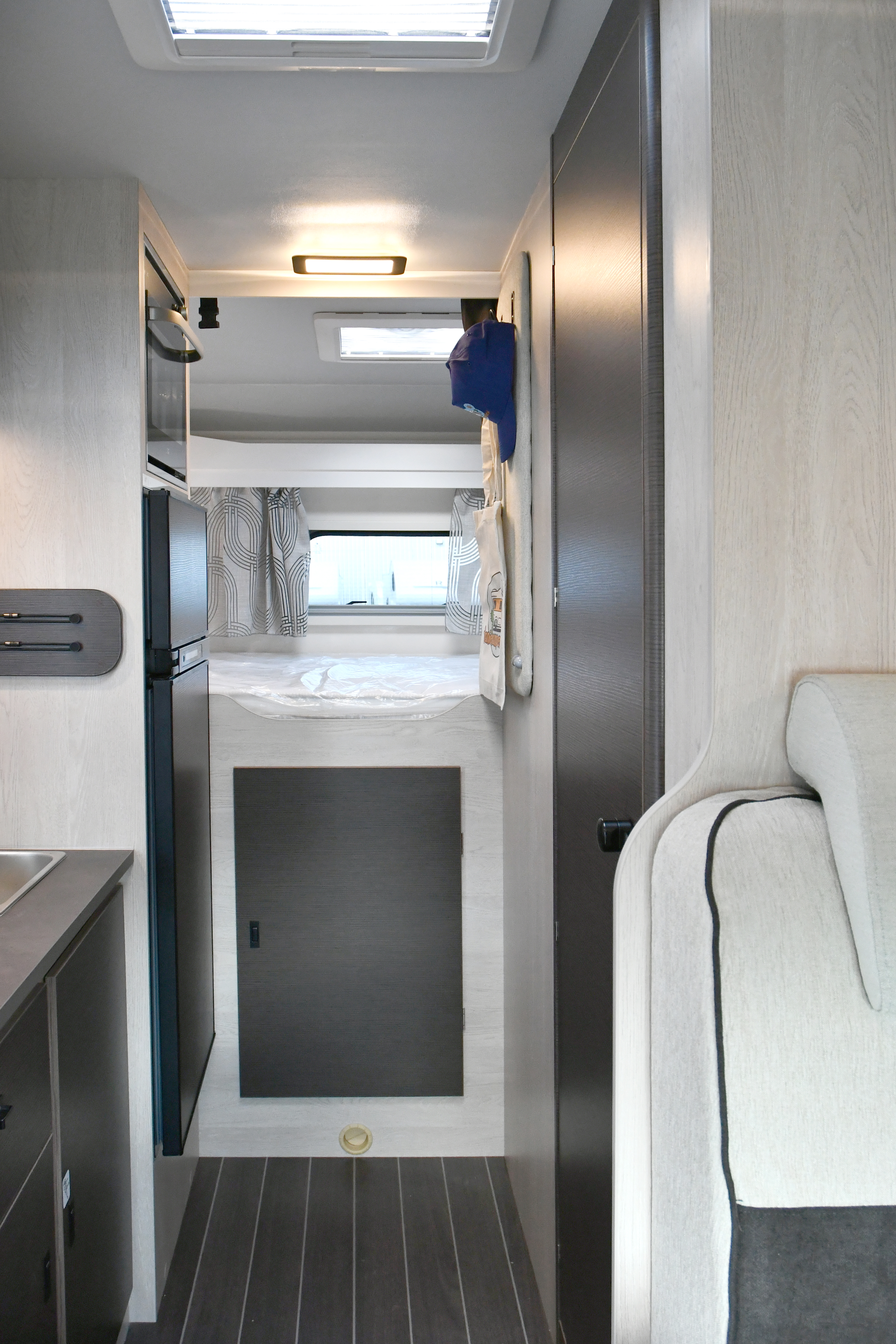 Aneks kuchenny został wyposażony w lodówkę, zlewozmywak oraz dwupalnikową kuchenkę gazową, a także praktyczny blat roboczy, który ułatwia przygotowywanie posiłków w podróży. Do dyspozycji użytkowników jest również szafa z drążkiem na wieszaki, dedykowane miejsce na telewizor oraz liczne półki i schowki, pozwalające na wygodne przechowywanie bagażu i akcesoriów.
