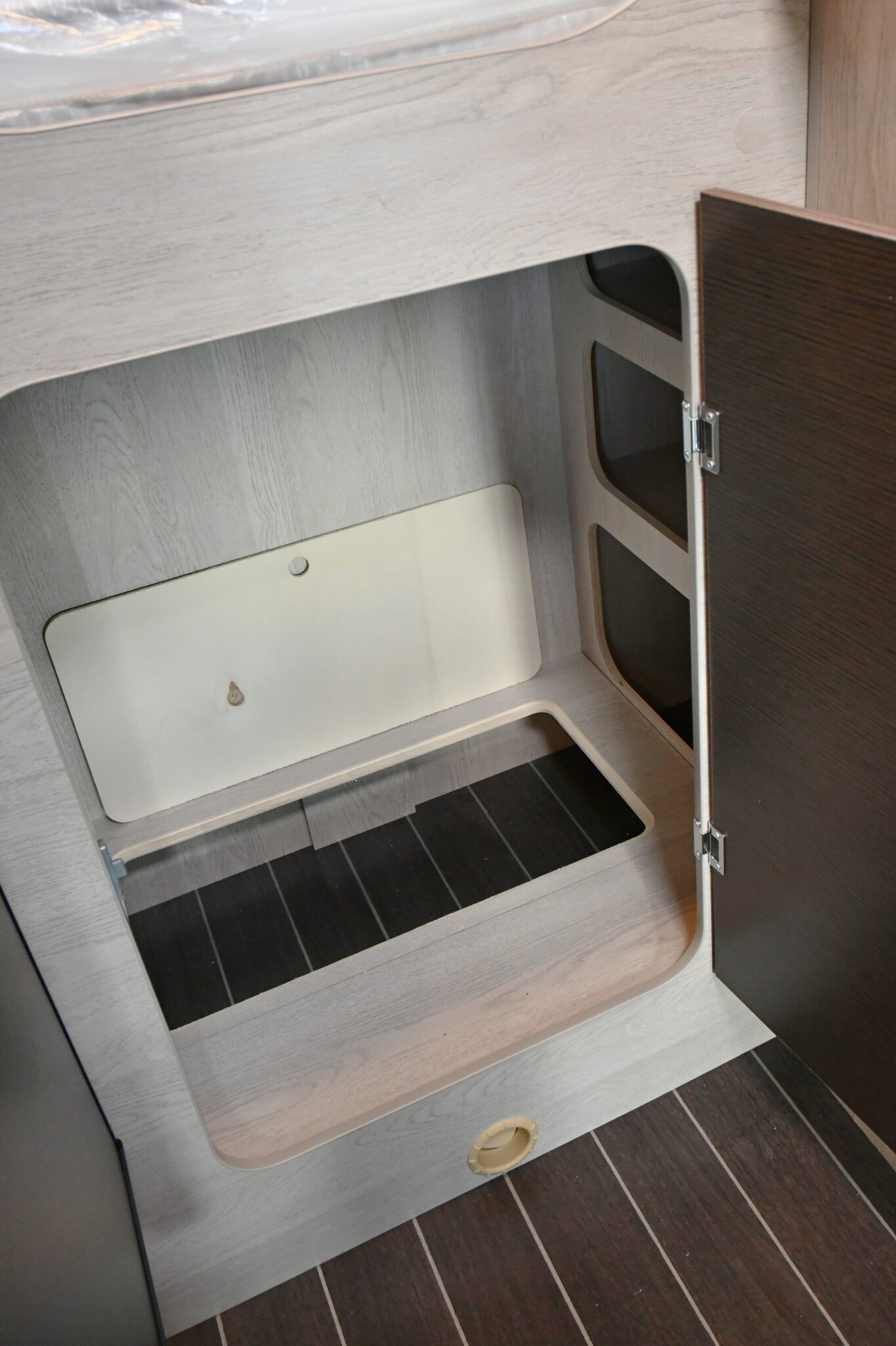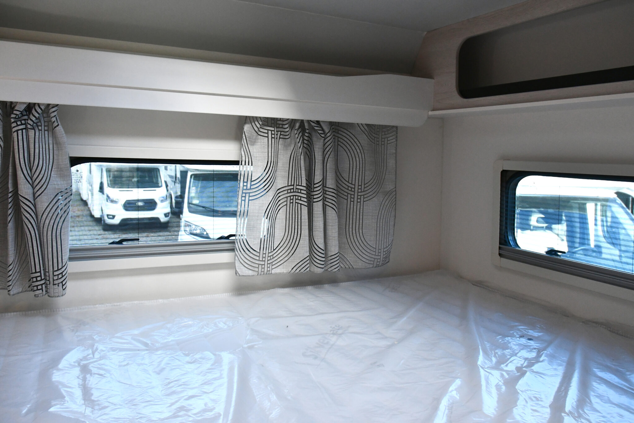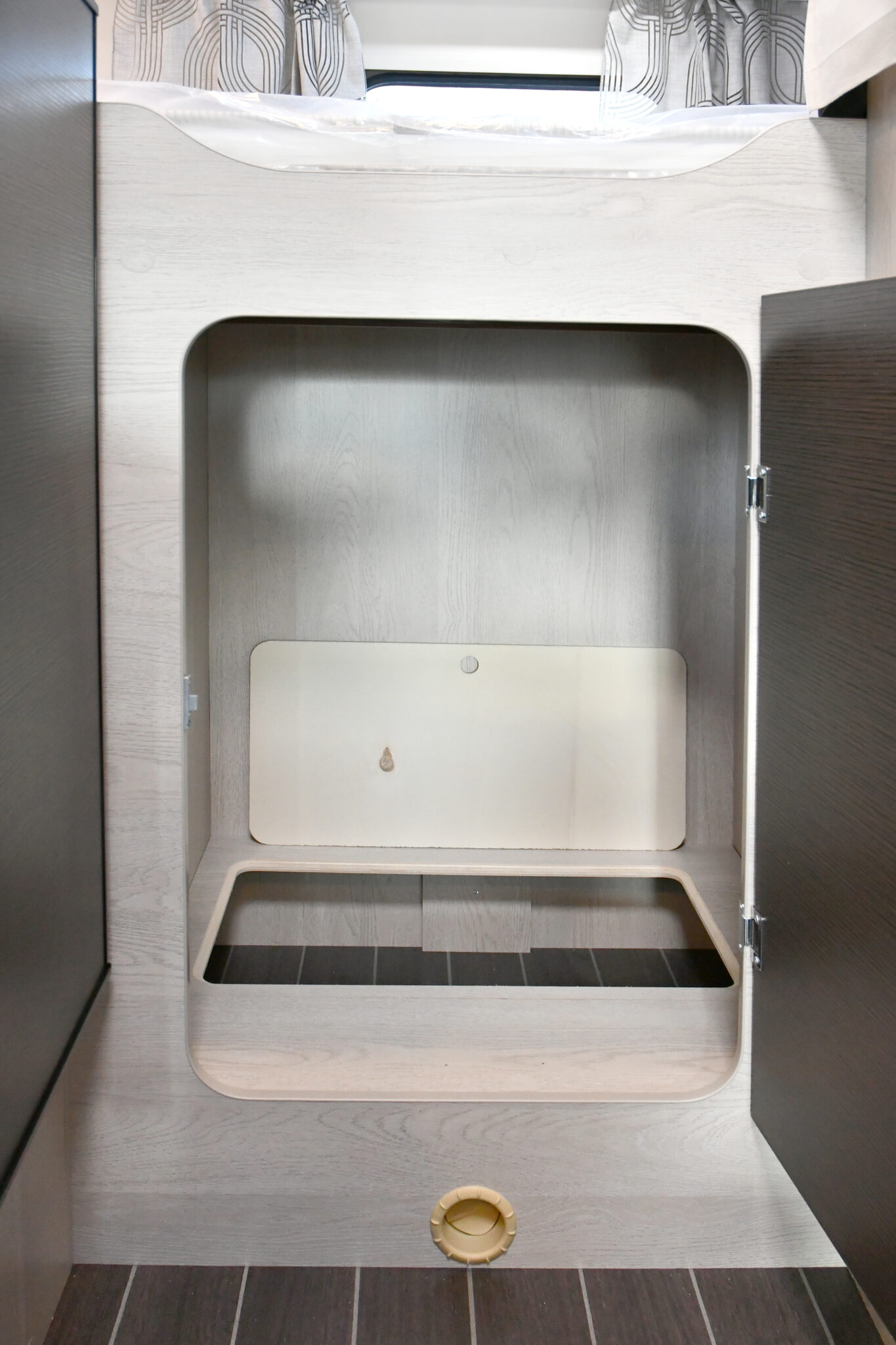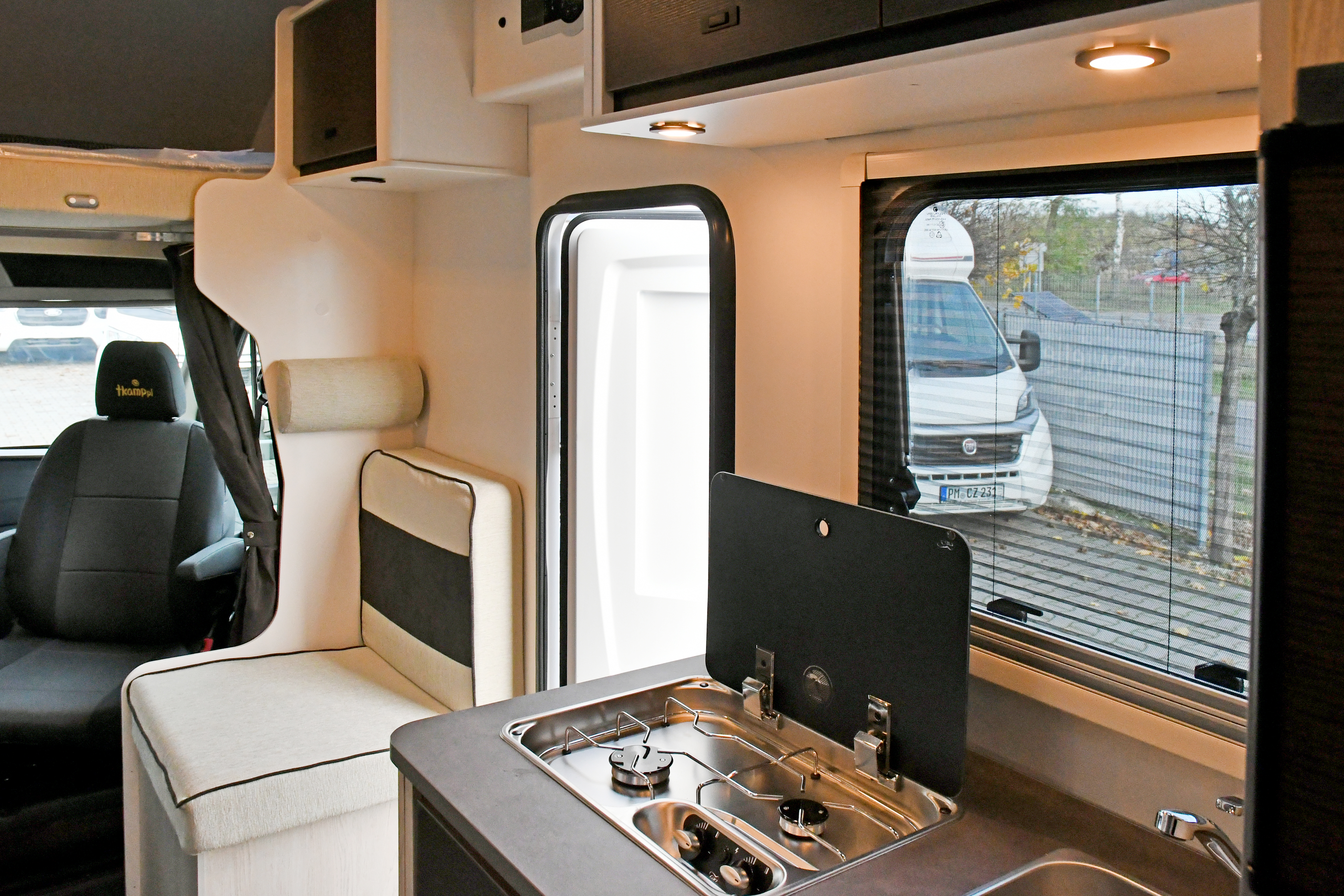 Aneks kuchenny został wyposażony w lodówkę, zlewozmywak oraz dwupalnikową kuchenkę gazową, a także praktyczny blat roboczy, który ułatwia przygotowywanie posiłków w podróży. Do dyspozycji użytkowników jest również szafa z drążkiem na wieszaki, dedykowane miejsce na telewizor oraz liczne półki i schowki, pozwalające na wygodne przechowywanie bagażu i akcesoriów.