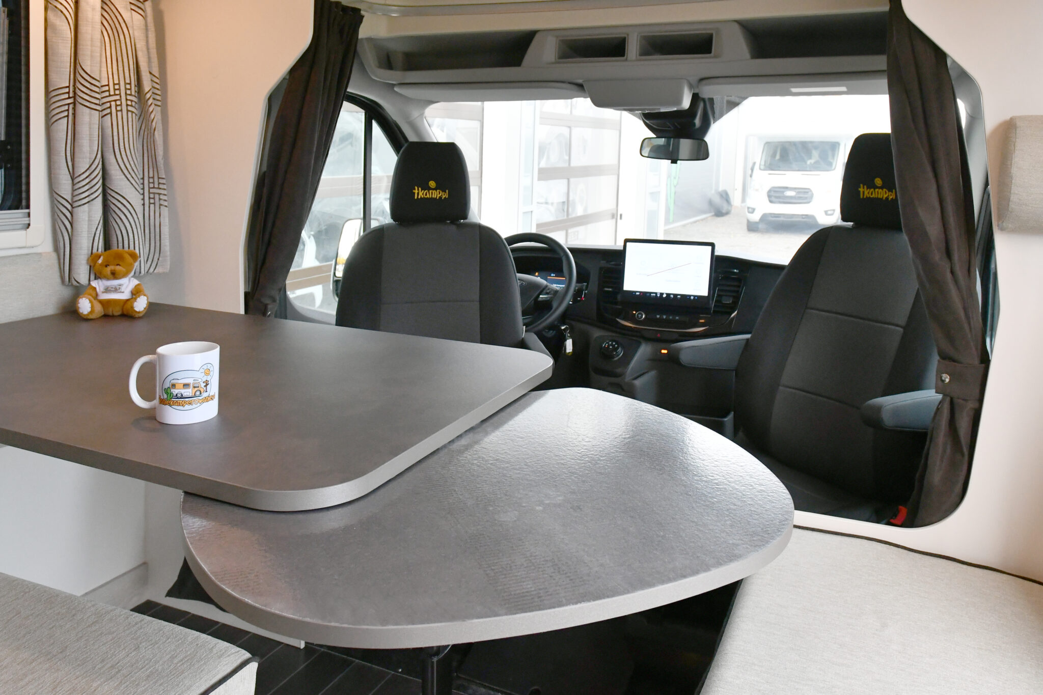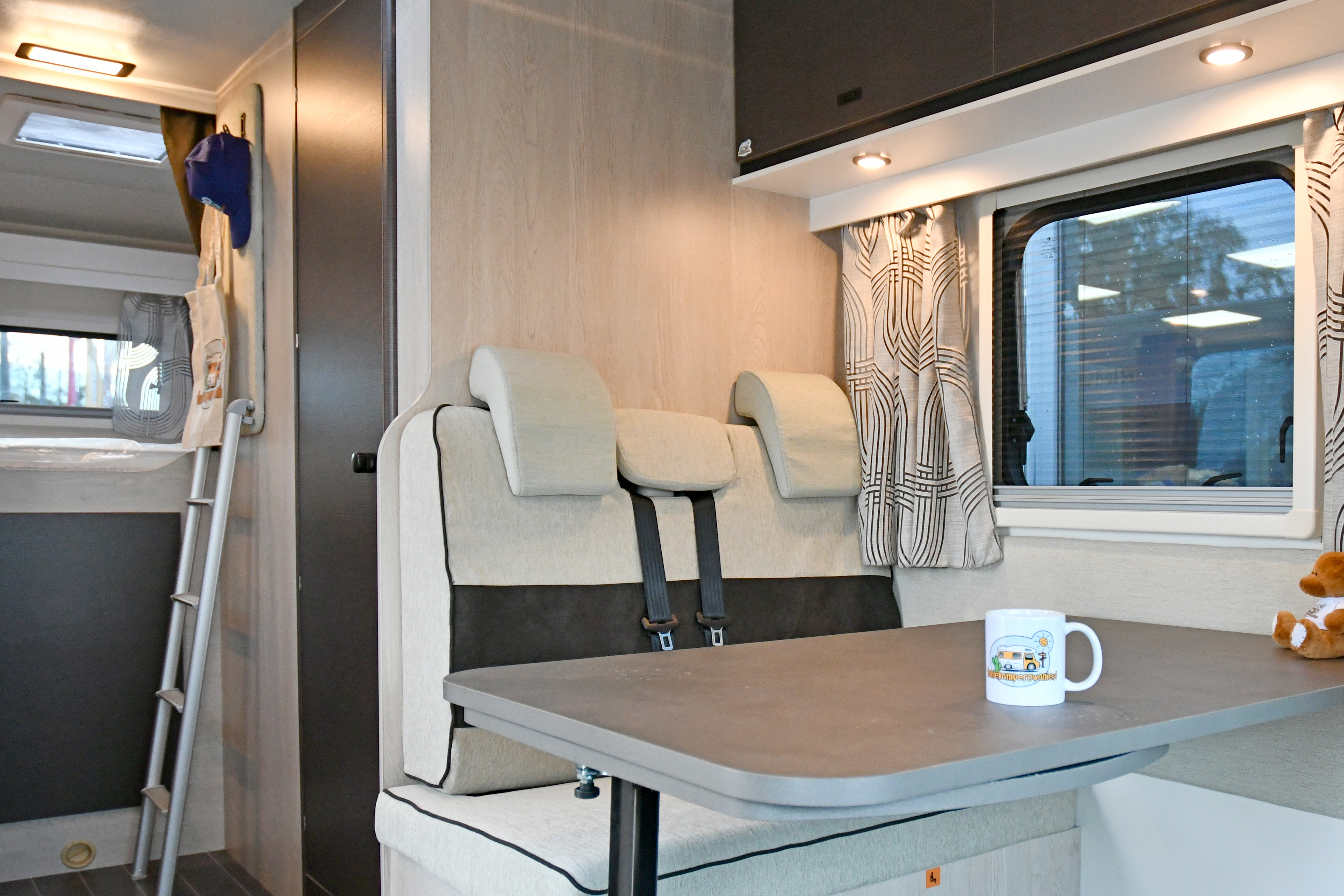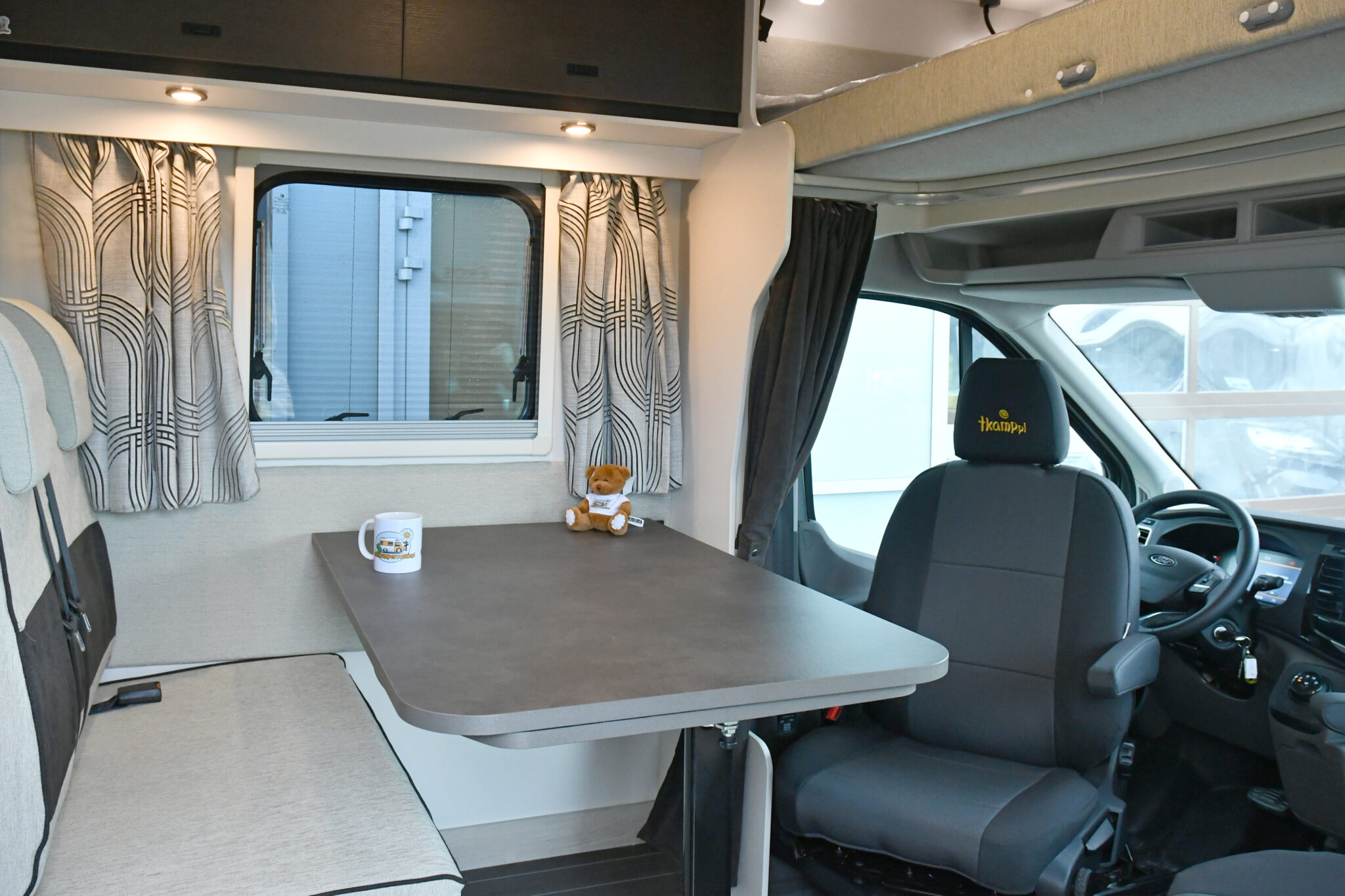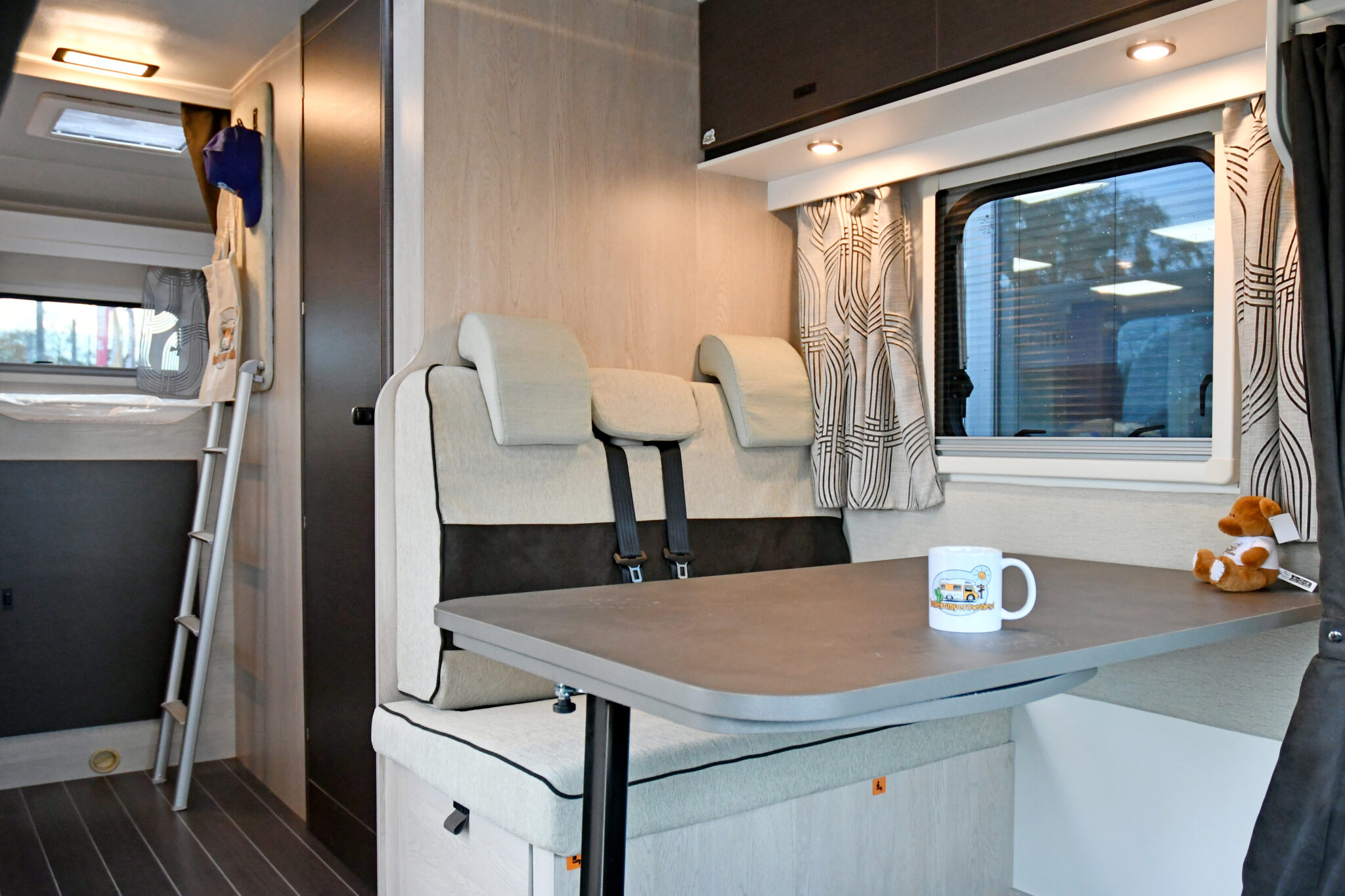 Pomimo swoich kompaktowych rozmiarów, kamper w wersji z opcjonalnym łóżkiem w salonie może komfortowo pomieścić nawet sześcioosobową załogę. Wnętrze wyróżnia się przemyślanym układem oraz funkcjonalnością. Centralnym punktem salonu jest obszerny stół, przy którym znajdują się dwie dwuosobowe kanapy, zapewniające wygodne miejsce do wspólnych posiłków i wypoczynku.