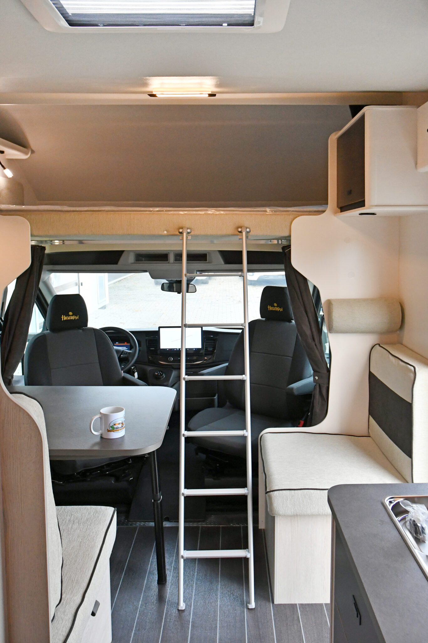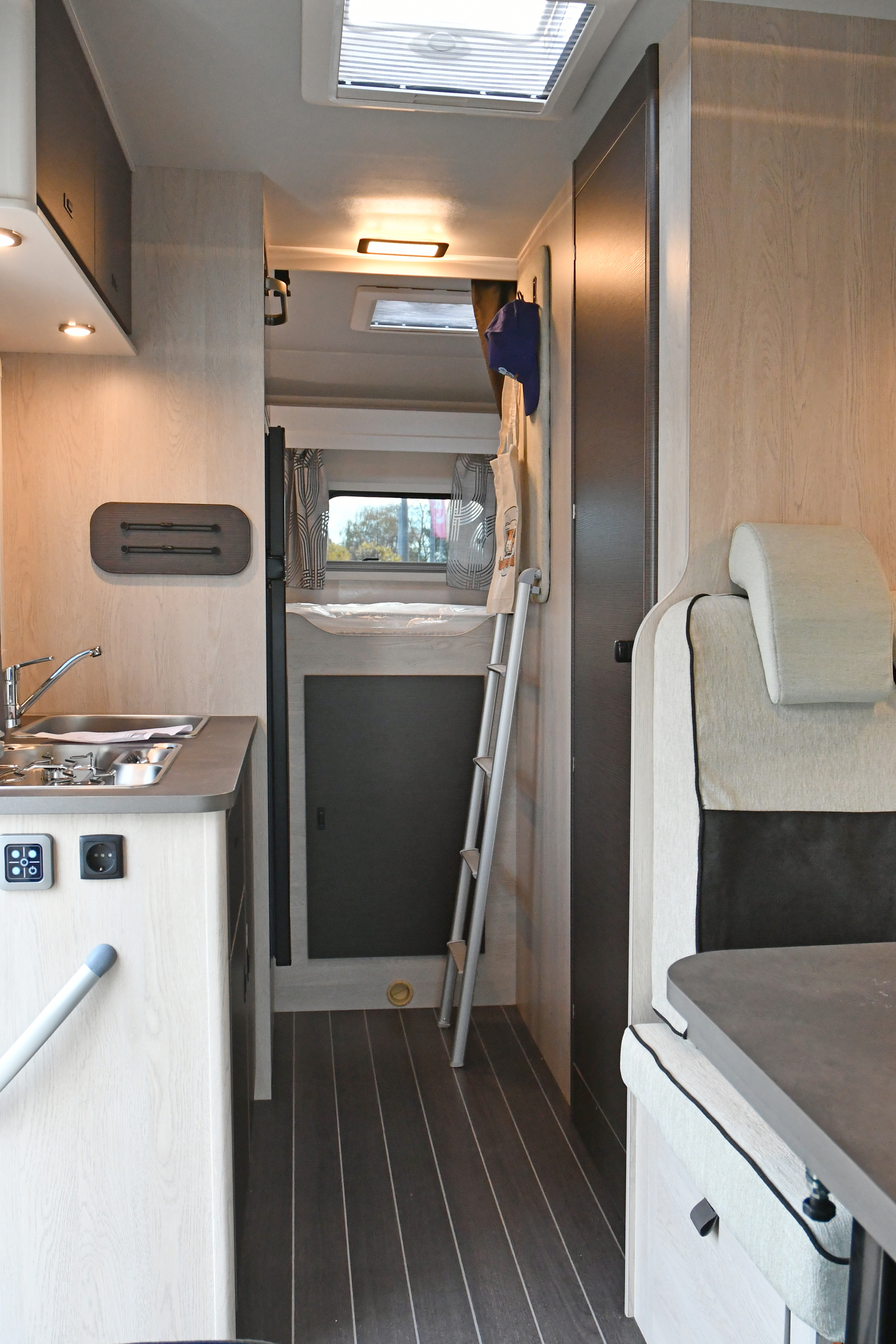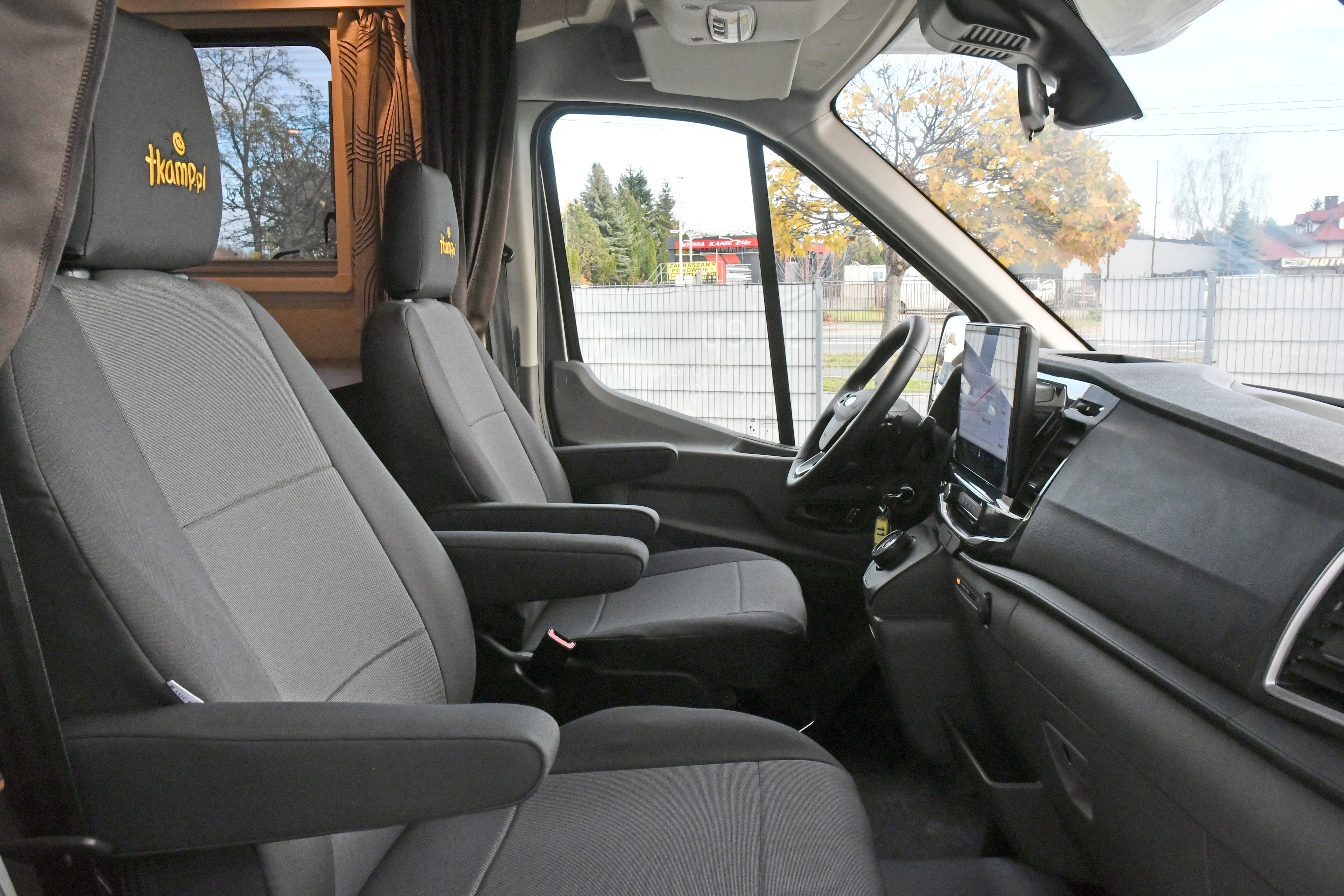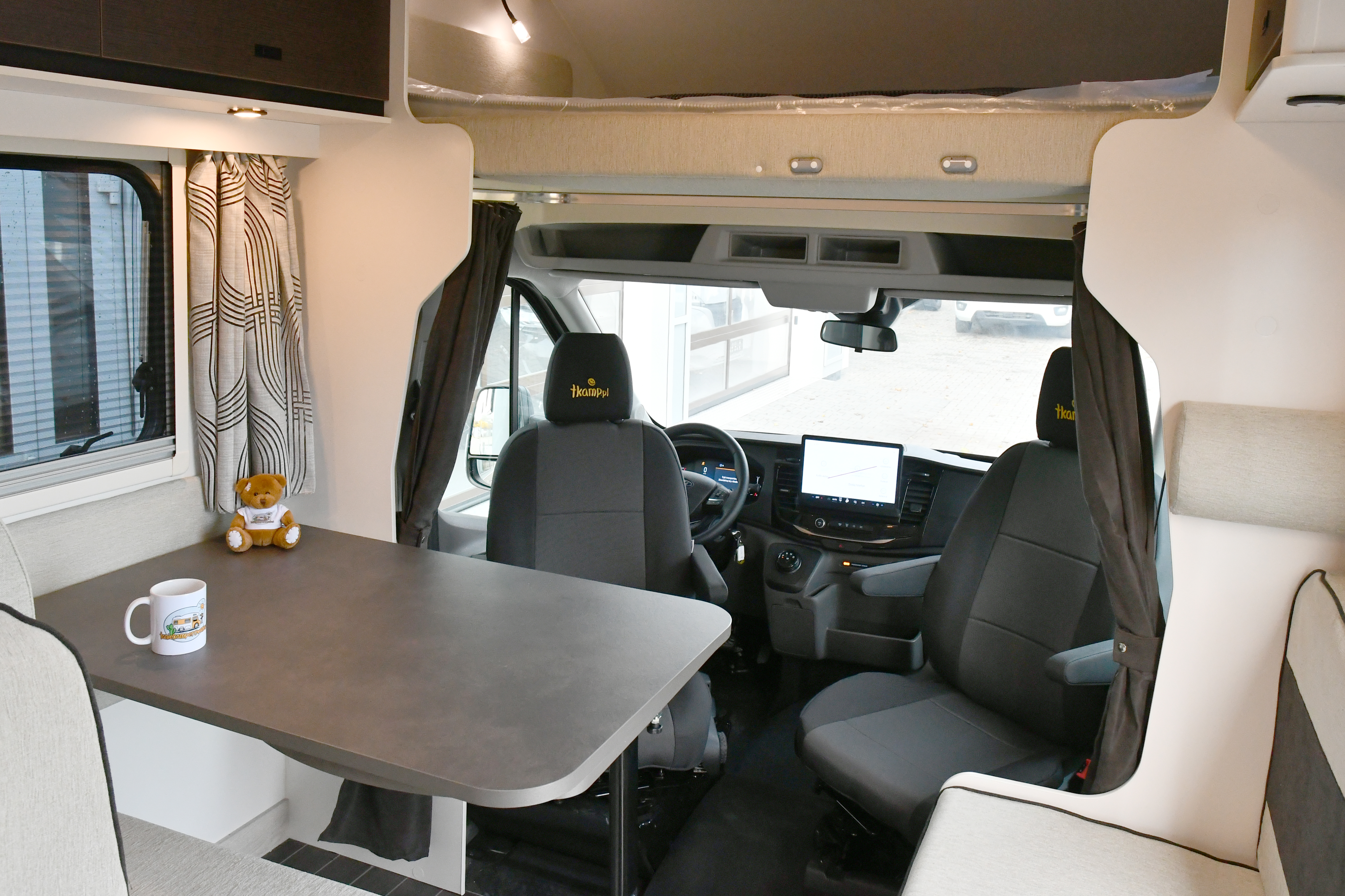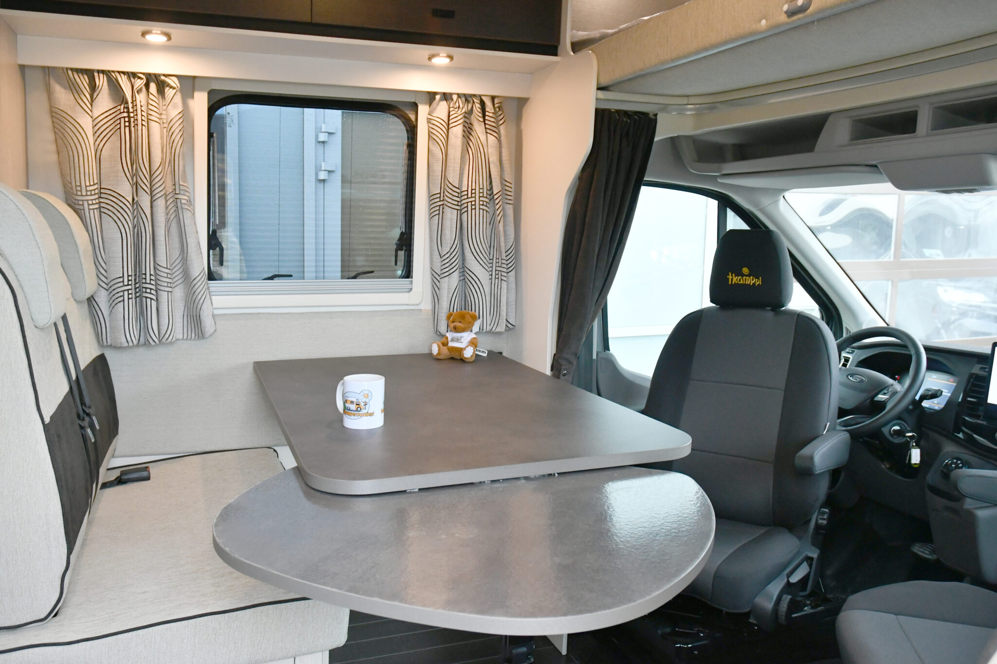 Pomimo swoich kompaktowych rozmiarów, kamper w wersji z opcjonalnym łóżkiem w salonie może komfortowo pomieścić nawet sześcioosobową załogę. Wnętrze wyróżnia się przemyślanym układem oraz funkcjonalnością. Centralnym punktem salonu jest obszerny stół, przy którym znajdują się dwie dwuosobowe kanapy, zapewniające wygodne miejsce do wspólnych posiłków i wypoczynku.