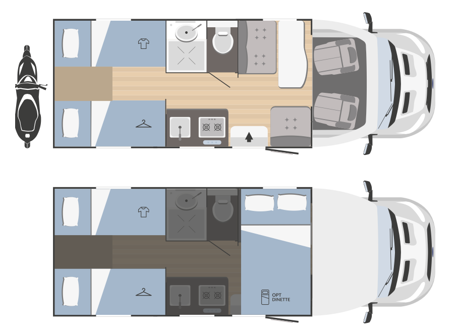 Kamper jest zwinny i szybki. Model ten jest często wybierany przez osoby preferujące aktywny wypoczynek. Ze względu na łóżko francuskie do którego nie musimy się wspinać po drabince lubią go też seniorzy. Zabudowa powstała na bazie Forda Transita z sinikiem o pojemności 2,0 litrów. Zatem niska akcyza i jeśli zamiast manualnej skrzyni biegów bardziej preferujemy automat. Nie ma problemu.