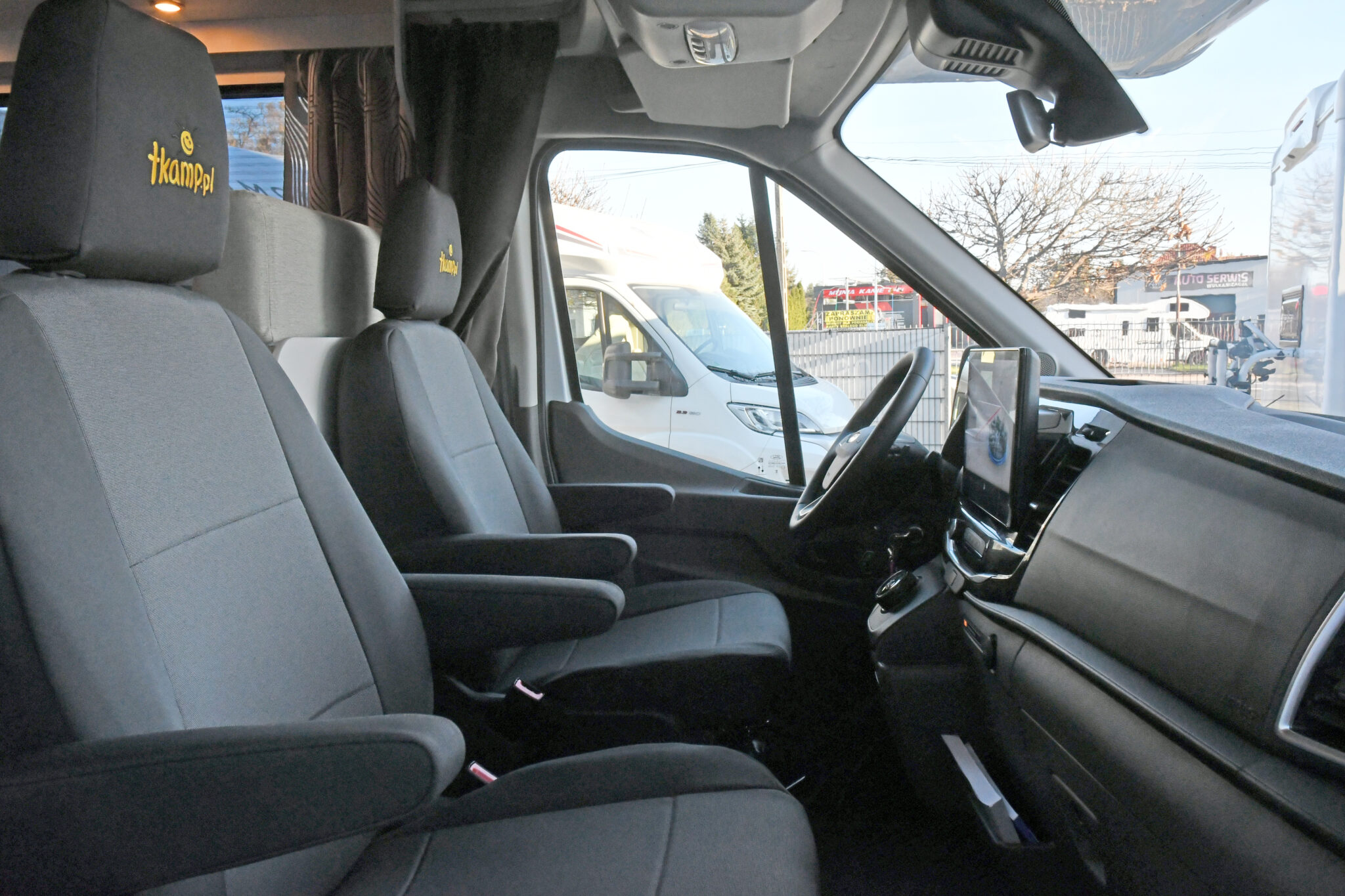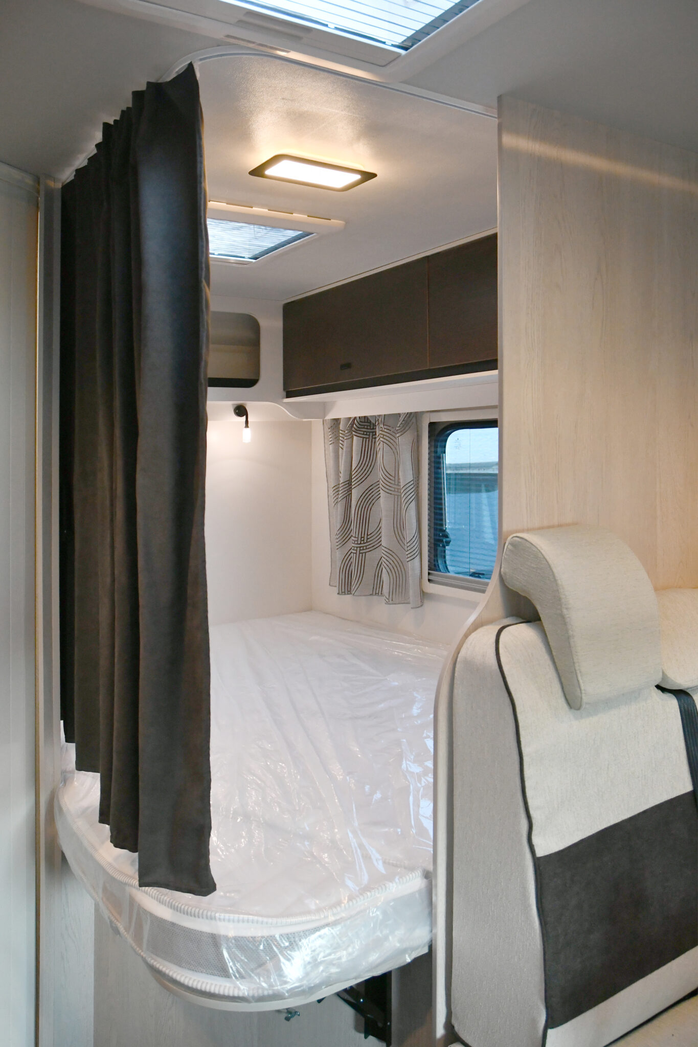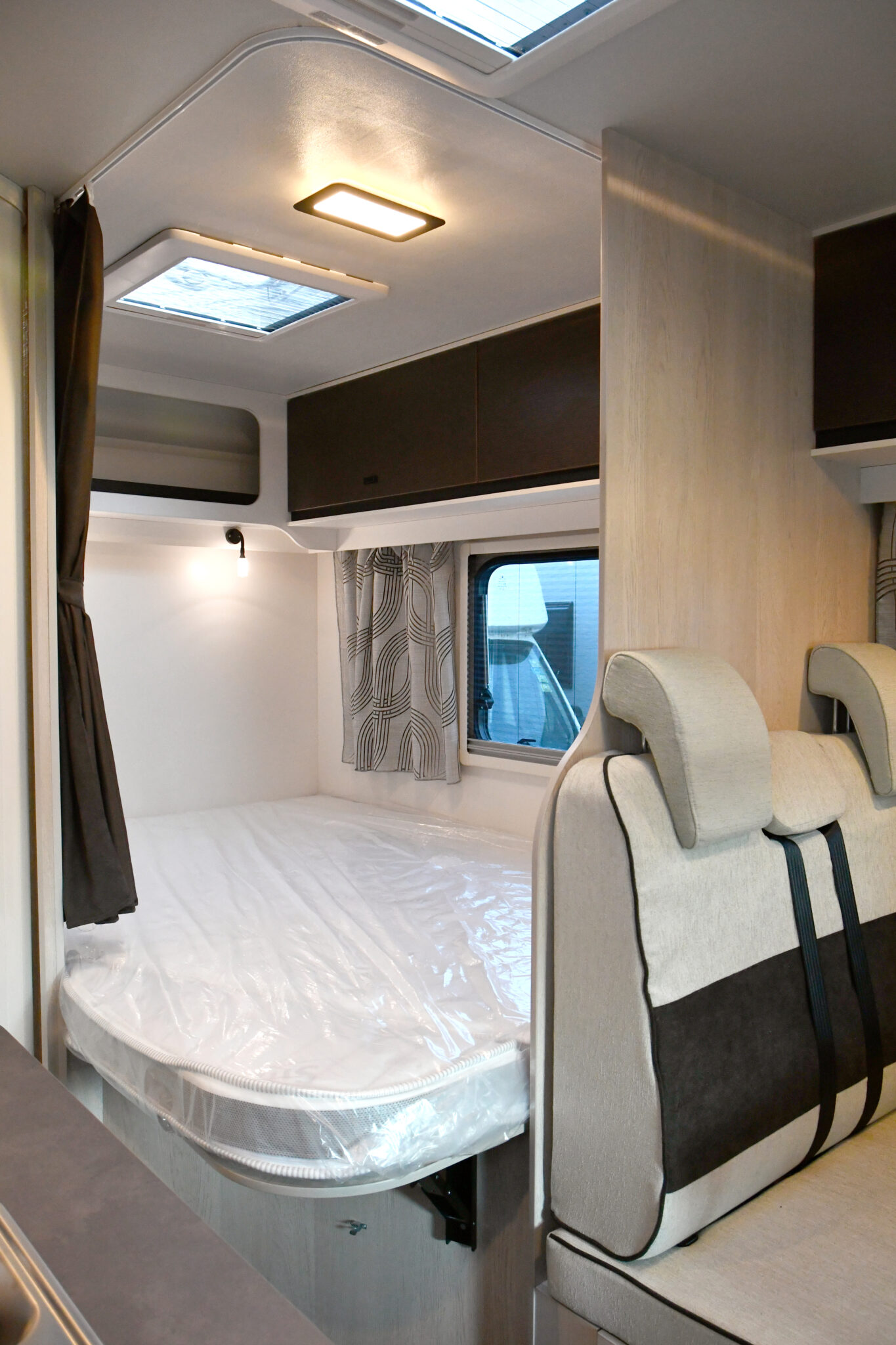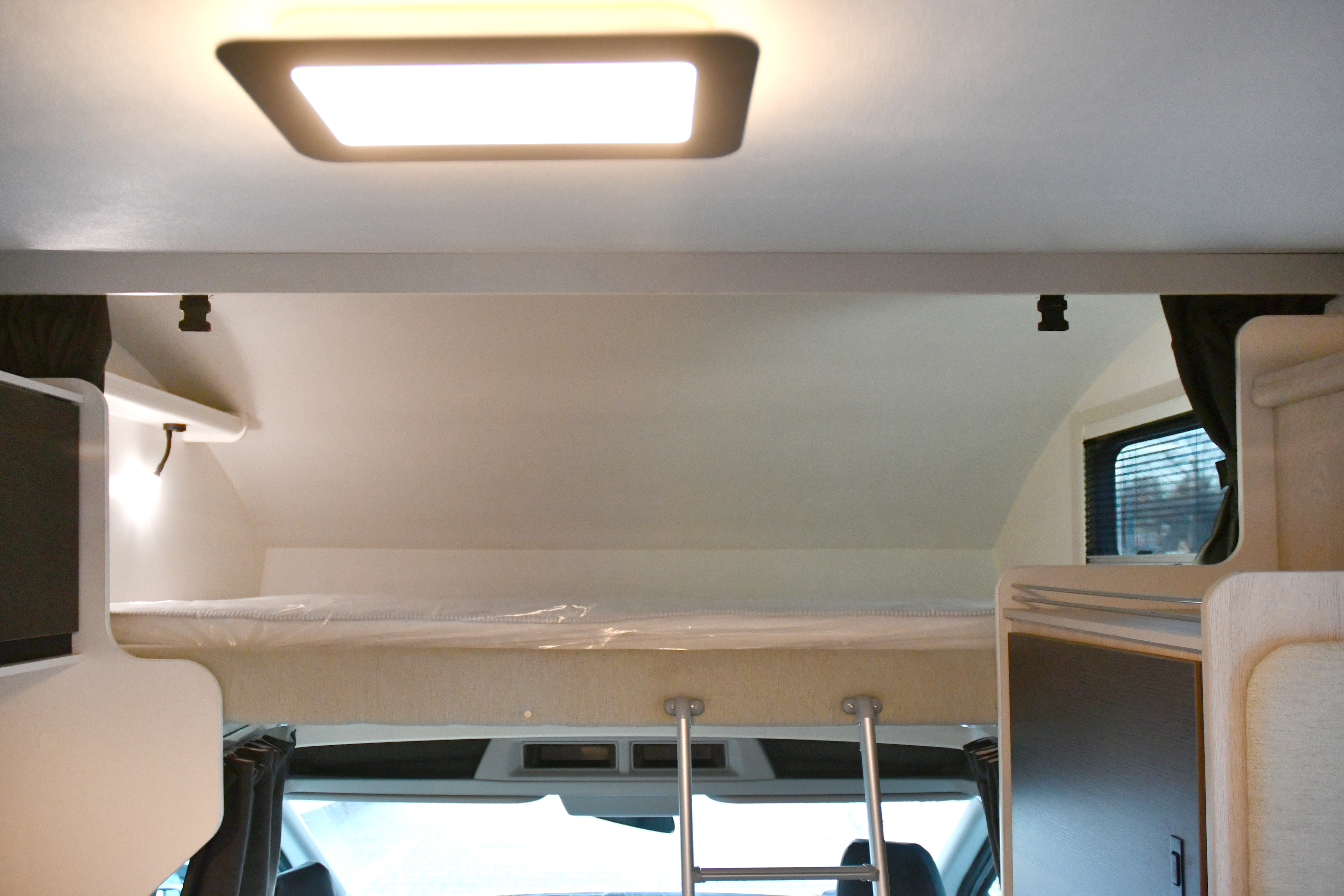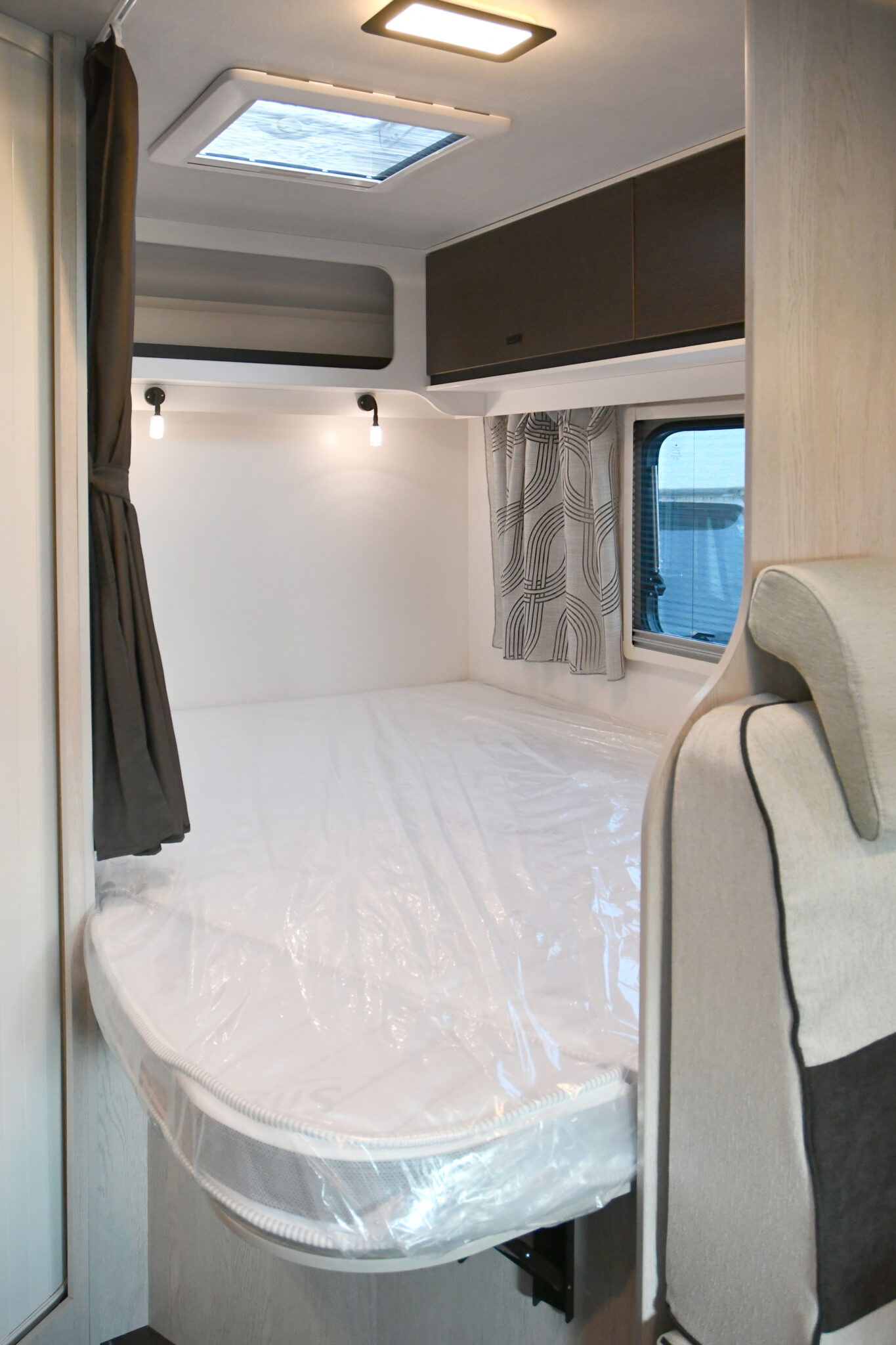 W tylnej, lewej części zabudowy znajduje się wygodne łóżko francuskie, które zapewnia łatwy dostęp do strefy sypialnej – bez konieczności korzystania z drabinki. To rozwiązanie szczególnie docenią osoby ceniące wygodę oraz seniorzy. Dodatkowo nad kabiną kierowcy umieszczono przestronną alkowę, oferującą komfortowe miejsce do spania dla kolejnych dwóch osób.