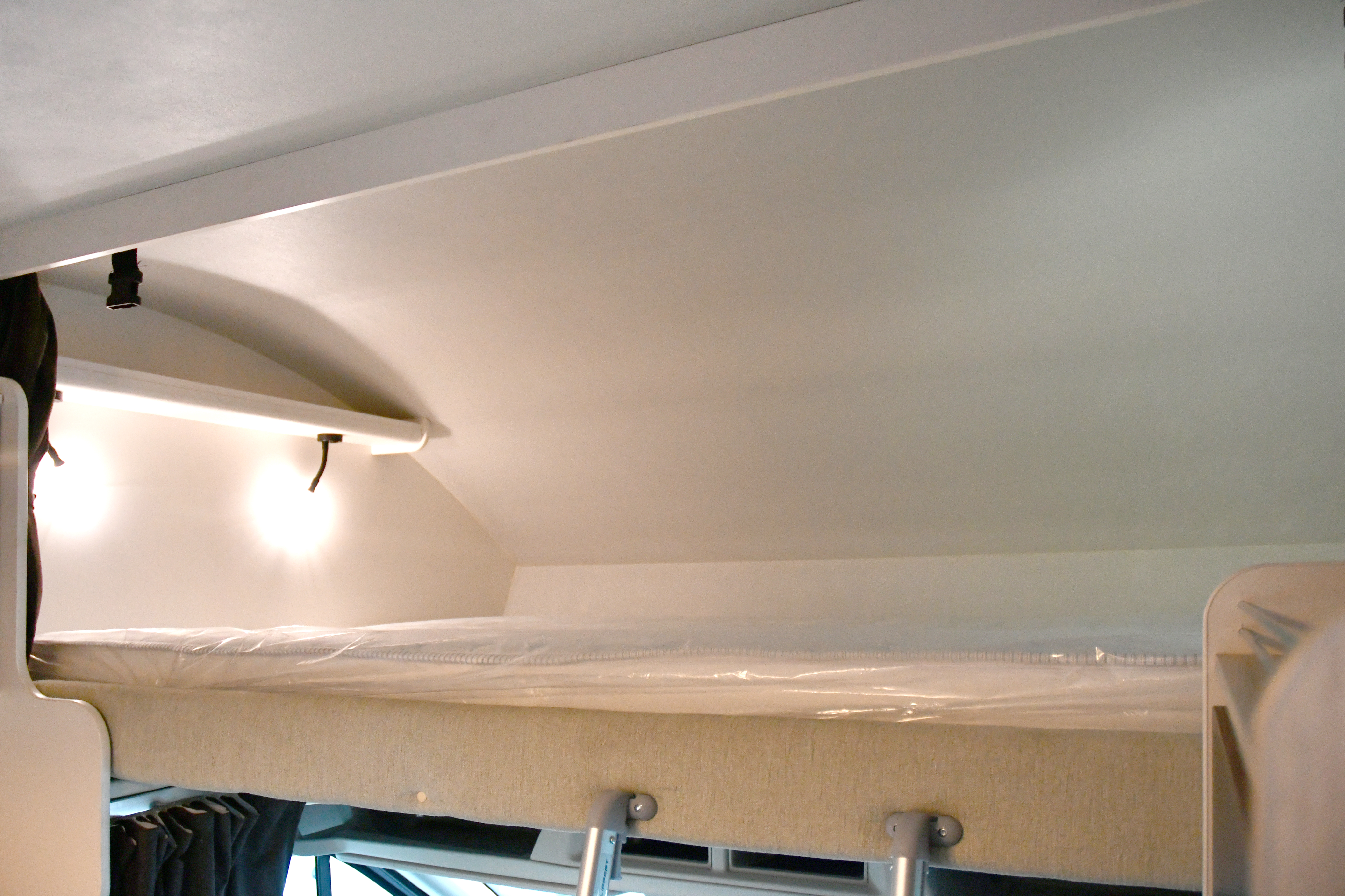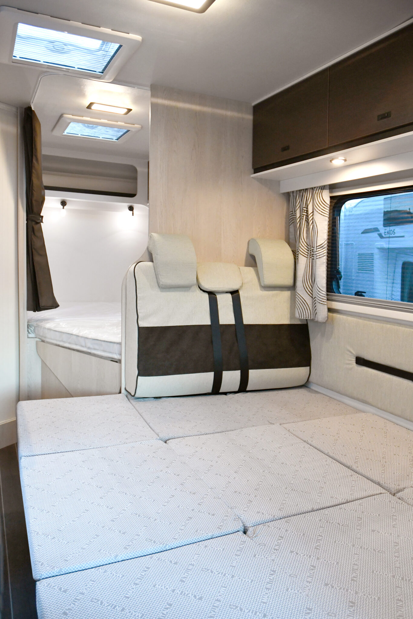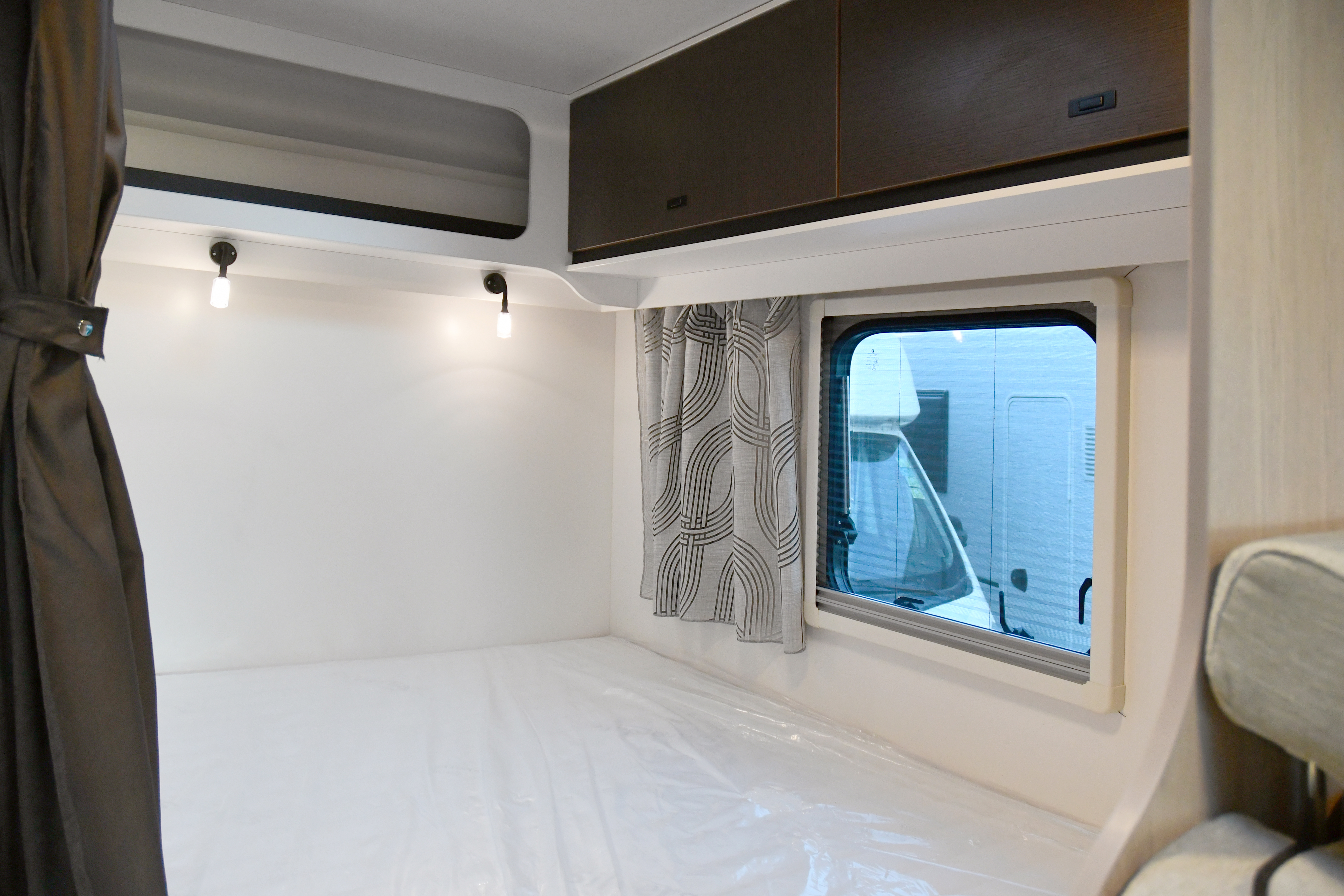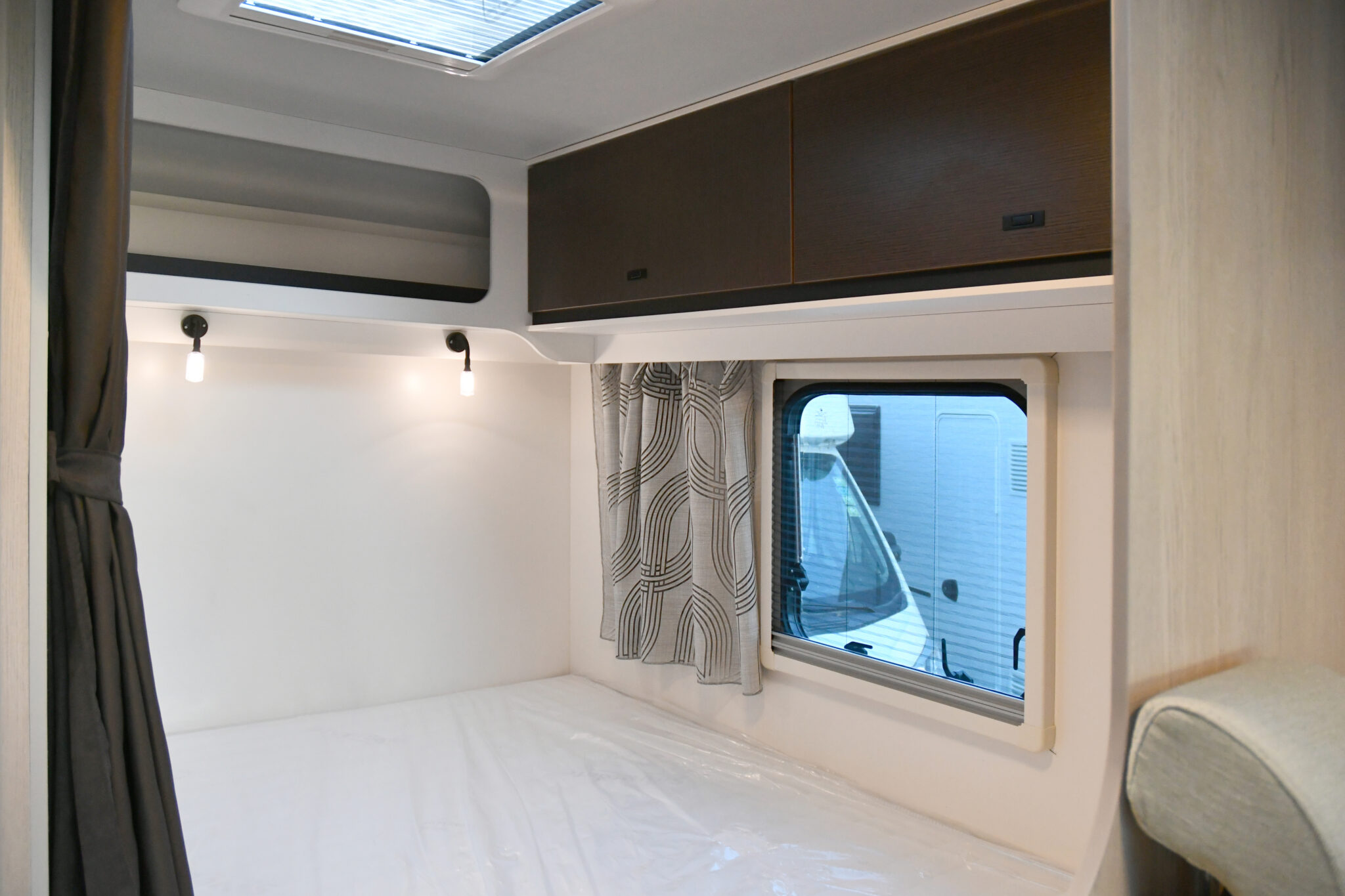 W tylnej, lewej części zabudowy znajduje się wygodne łóżko francuskie, które zapewnia łatwy dostęp do strefy sypialnej – bez konieczności korzystania z drabinki. To rozwiązanie szczególnie docenią osoby ceniące wygodę oraz seniorzy. Dodatkowo nad kabiną kierowcy umieszczono przestronną alkowę, oferującą komfortowe miejsce do spania dla kolejnych dwóch osób.