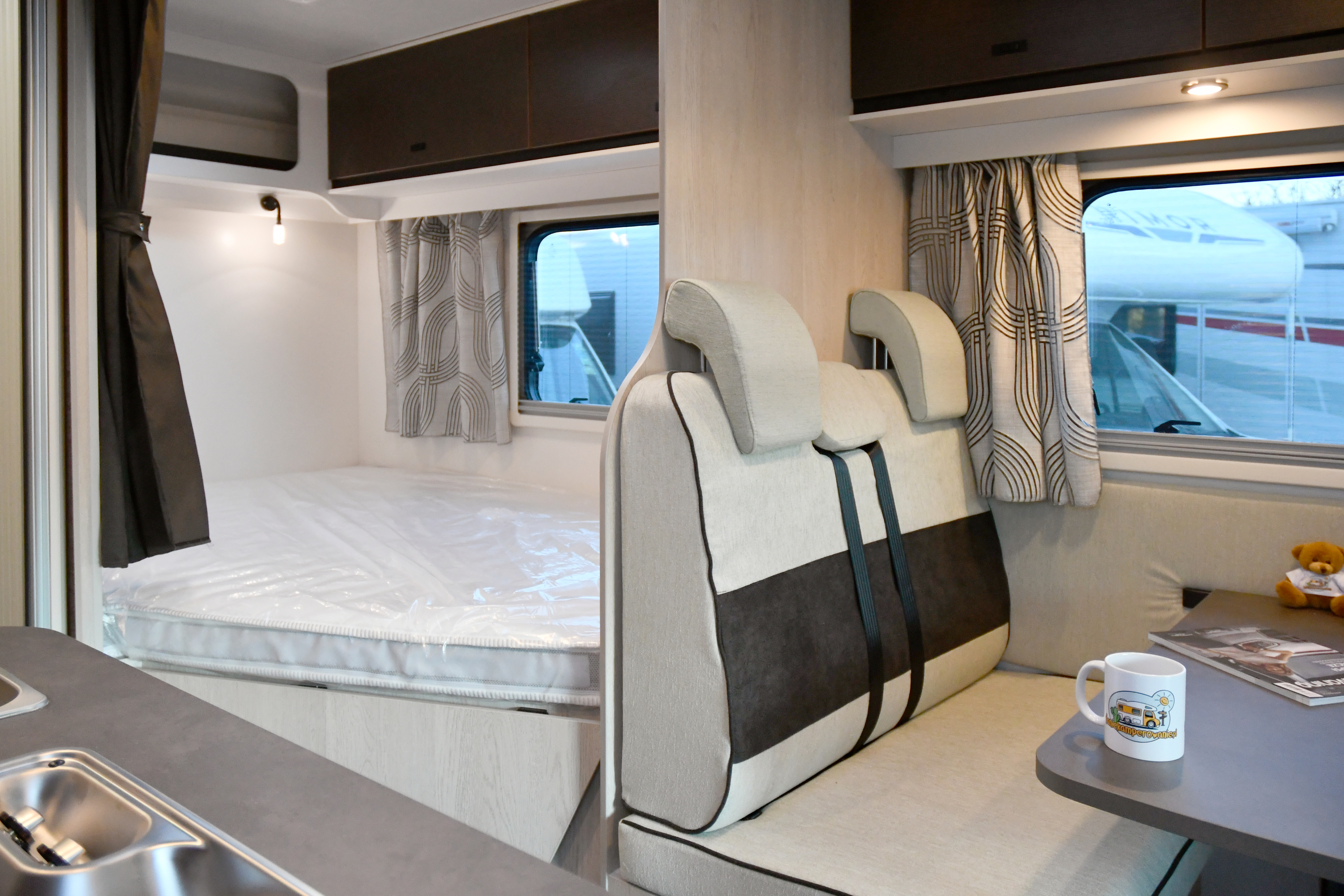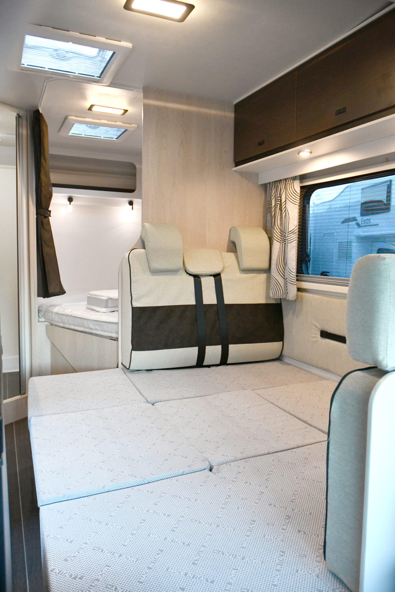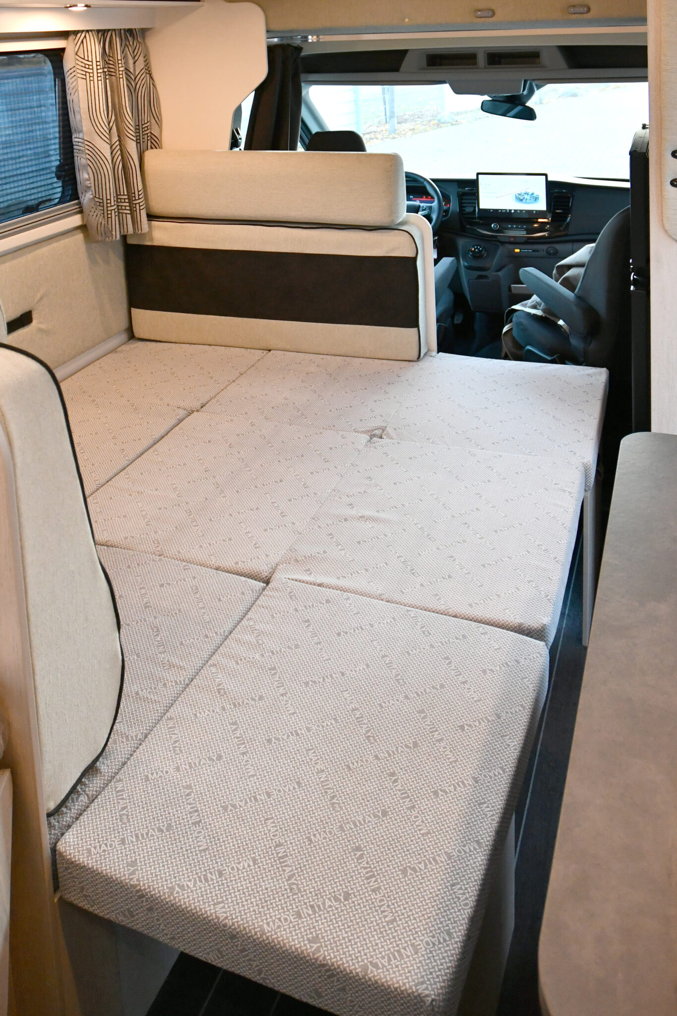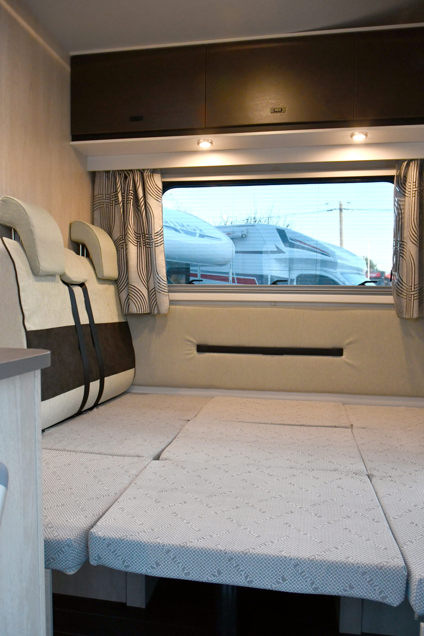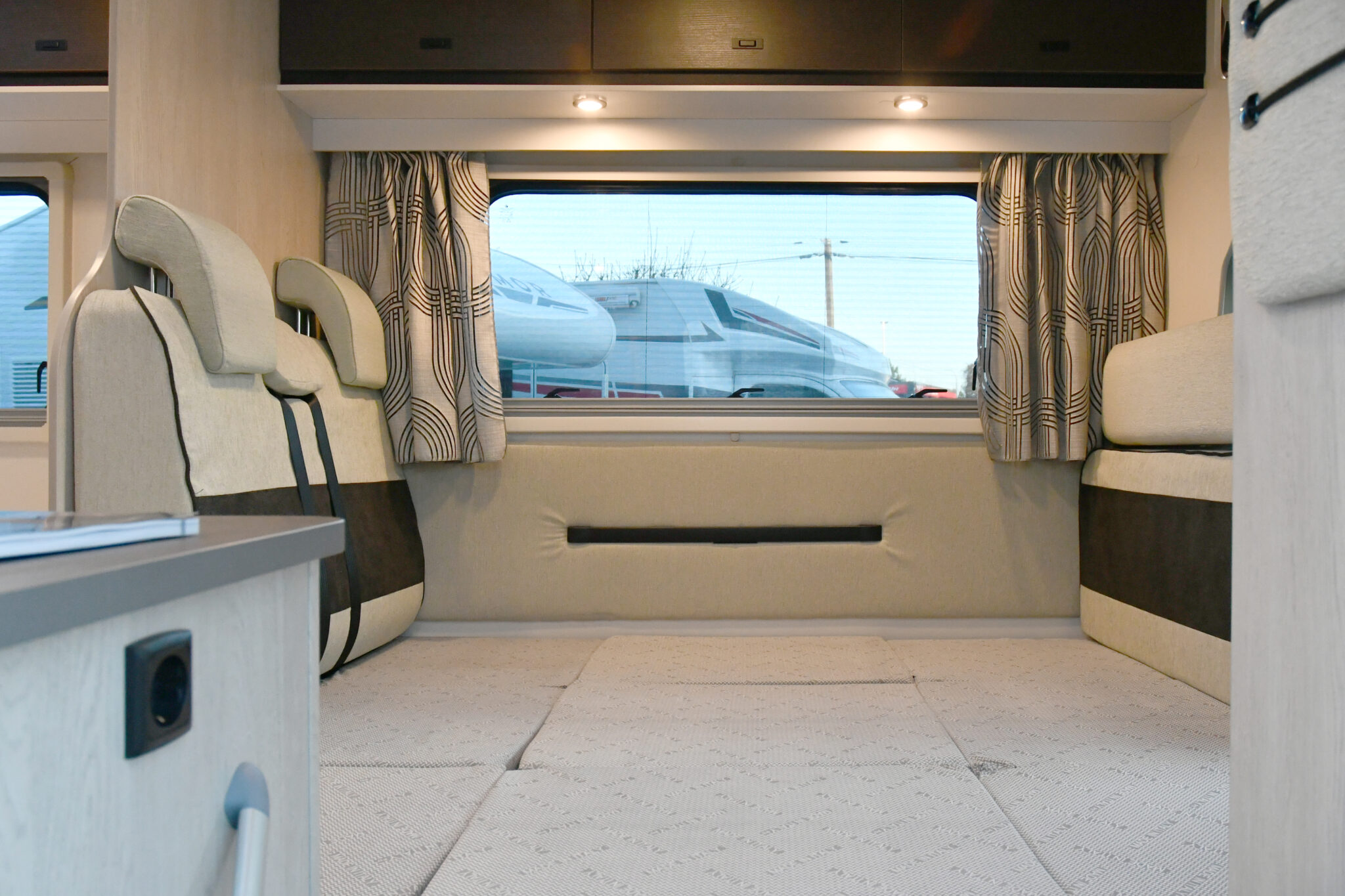 W tylnej, lewej części zabudowy znajduje się wygodne łóżko francuskie, które zapewnia łatwy dostęp do strefy sypialnej – bez konieczności korzystania z drabinki. To rozwiązanie szczególnie docenią osoby ceniące wygodę oraz seniorzy. Dodatkowo nad kabiną kierowcy umieszczono przestronną alkowę, oferującą komfortowe miejsce do spania dla kolejnych dwóch osób.