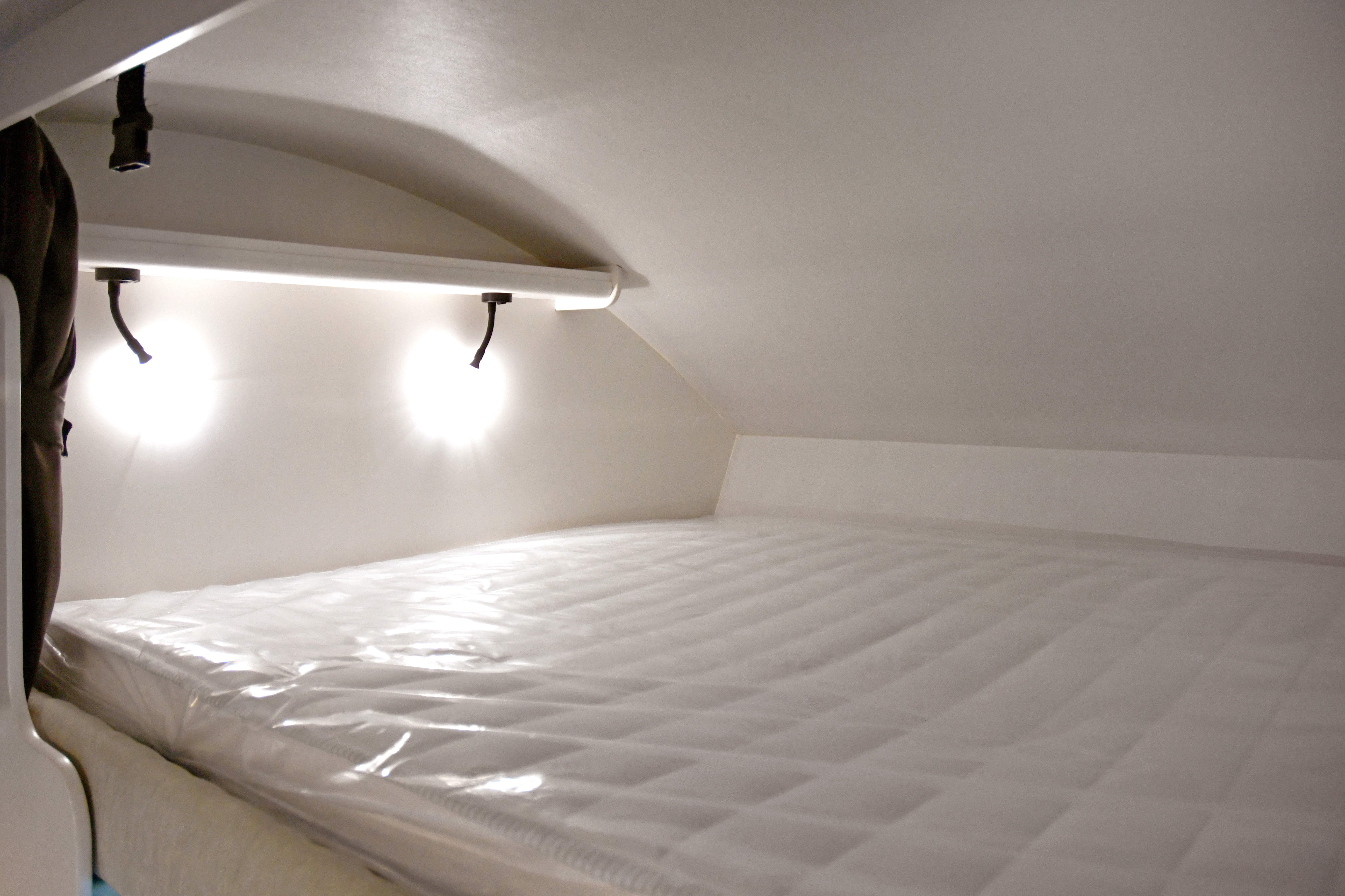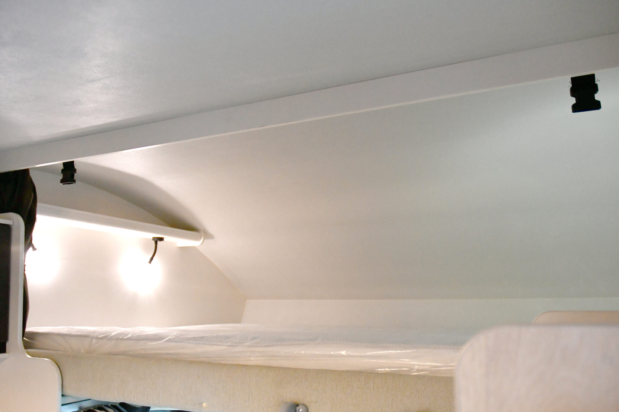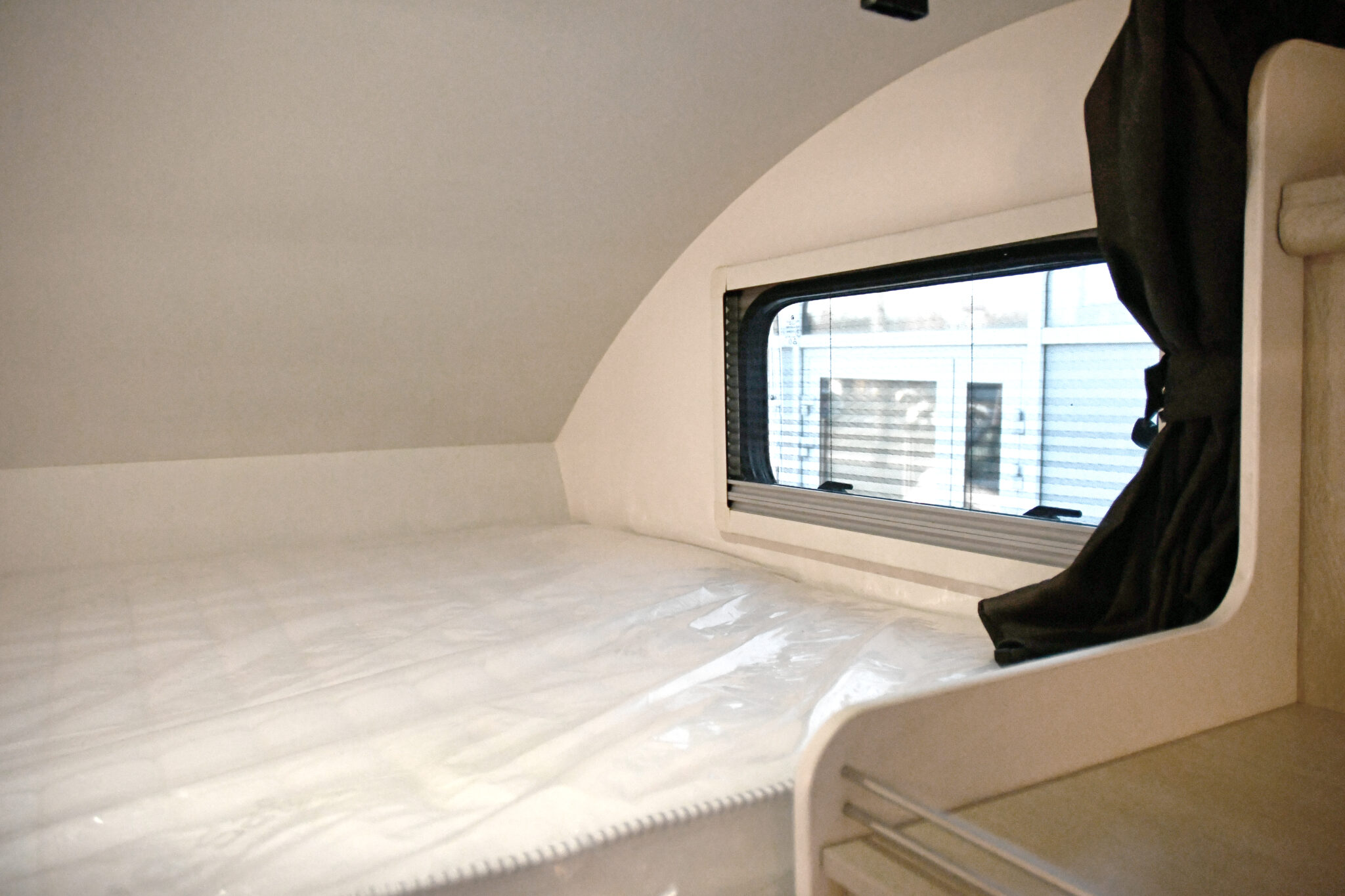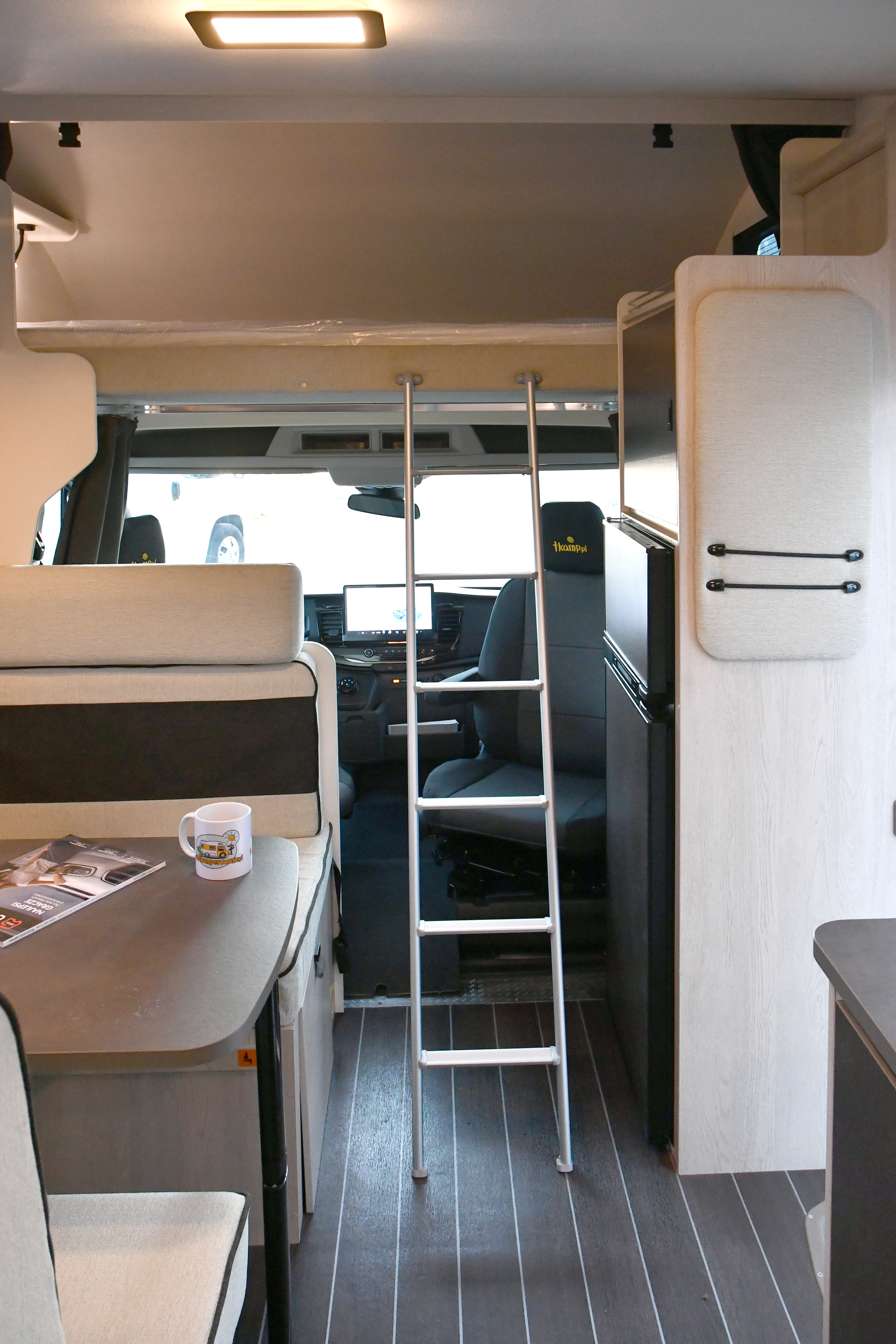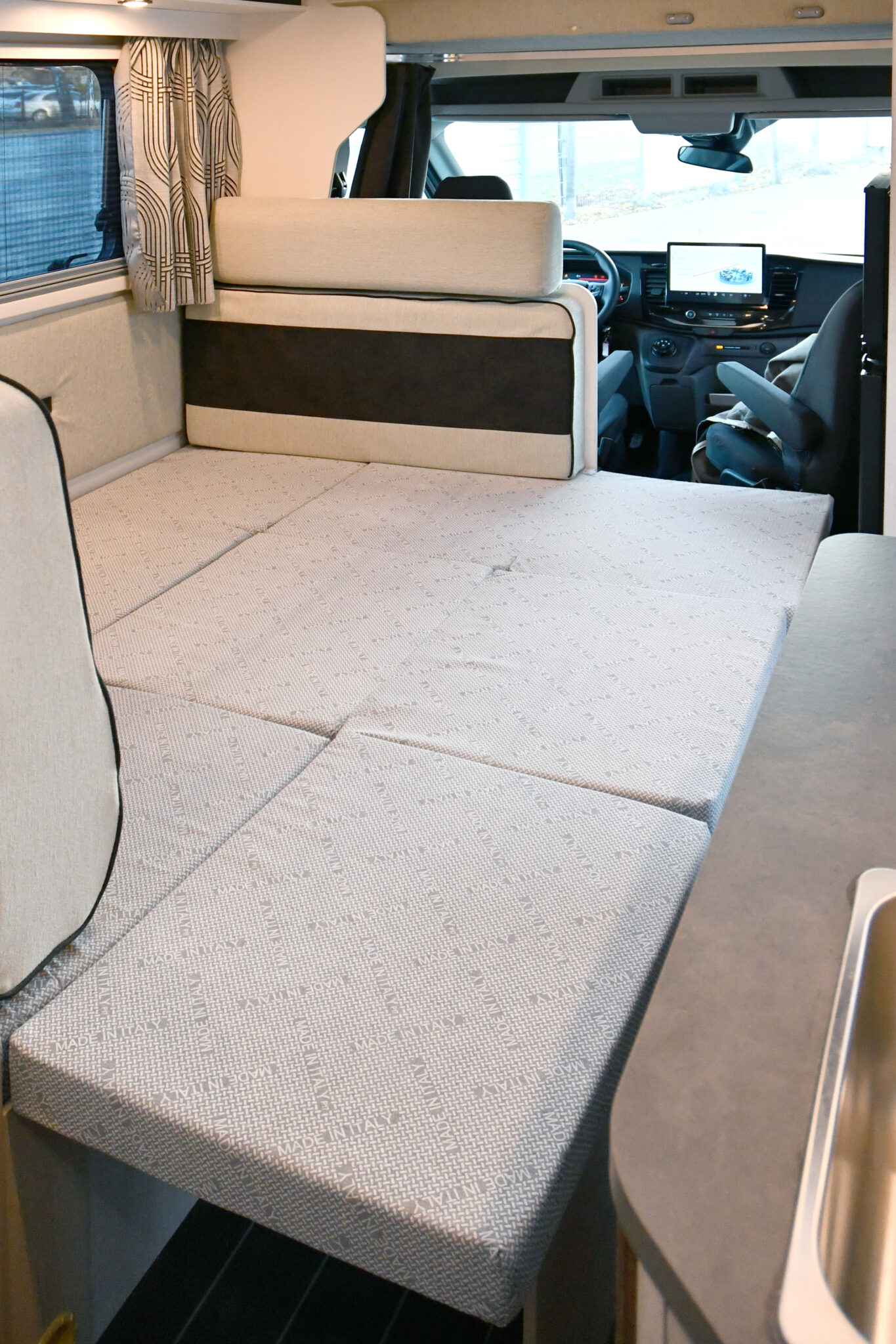 W tylnej, lewej części zabudowy znajduje się wygodne łóżko francuskie, które zapewnia łatwy dostęp do strefy sypialnej – bez konieczności korzystania z drabinki. To rozwiązanie szczególnie docenią osoby ceniące wygodę oraz seniorzy. Dodatkowo nad kabiną kierowcy umieszczono przestronną alkowę, oferującą komfortowe miejsce do spania dla kolejnych dwóch osób.