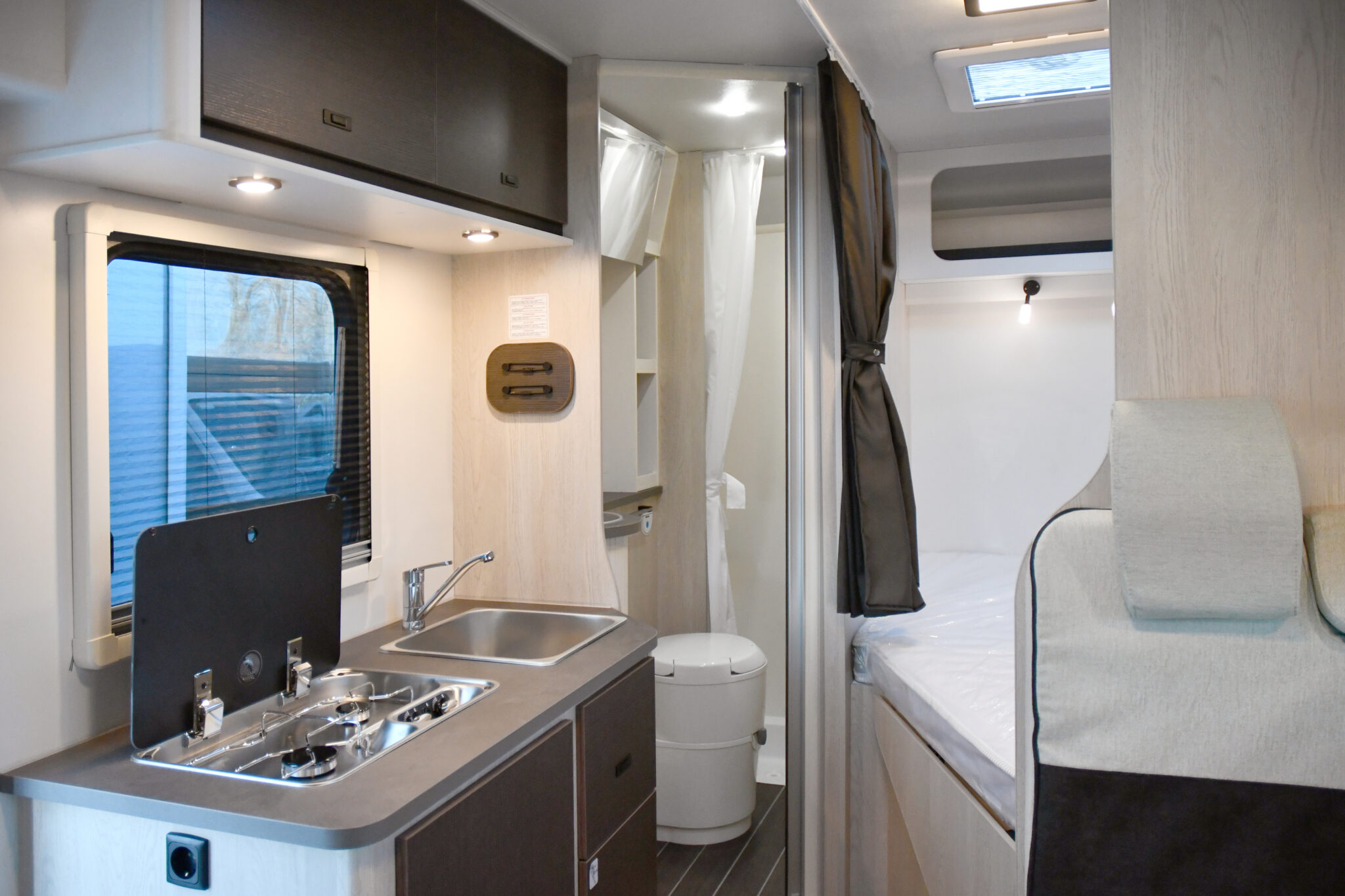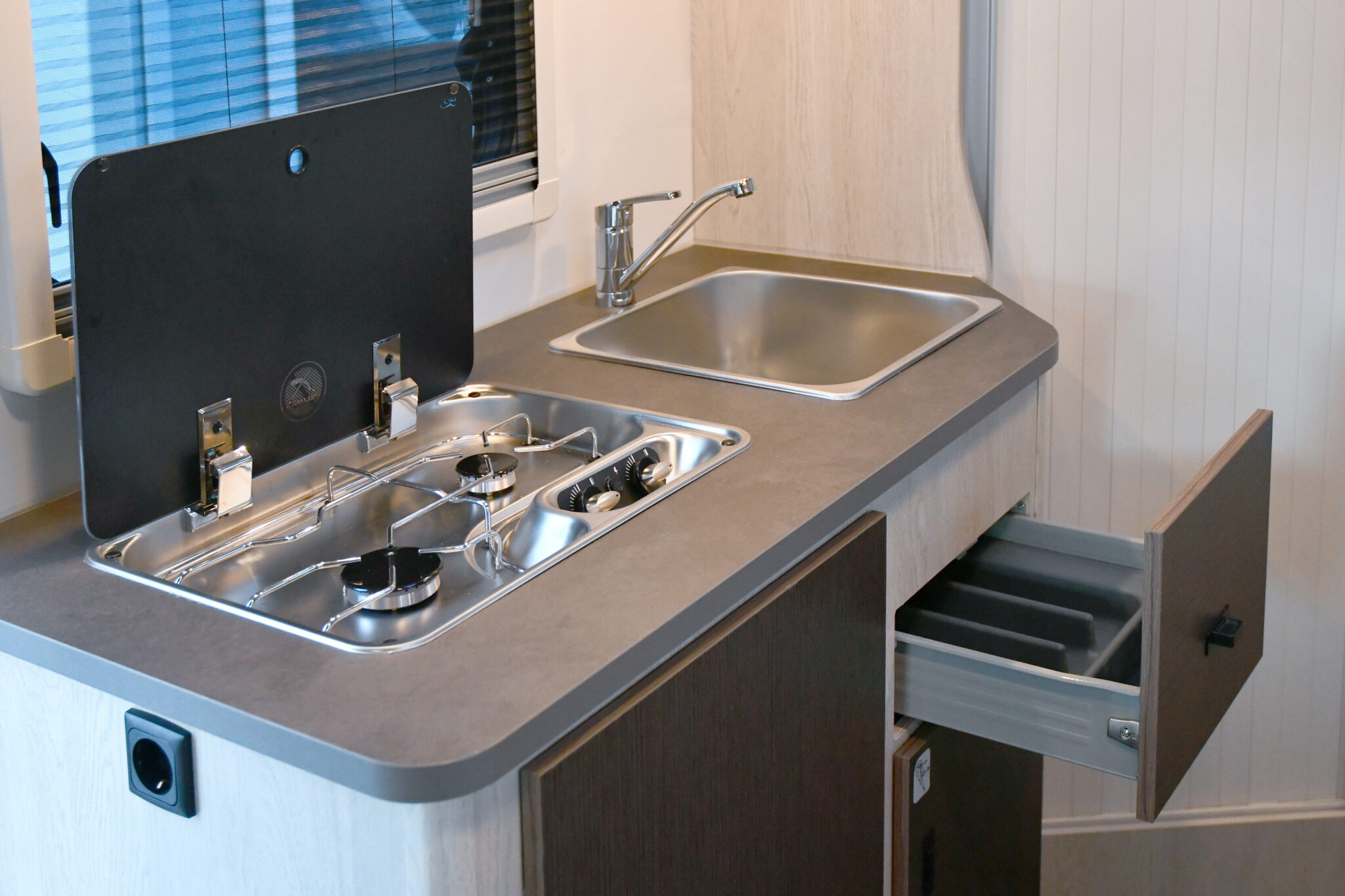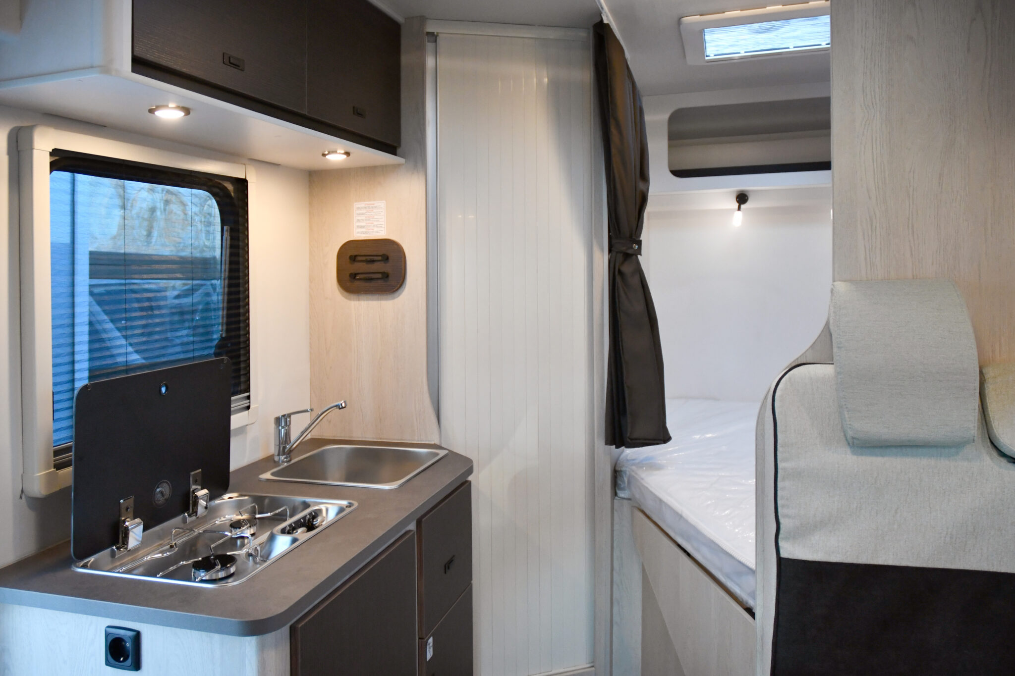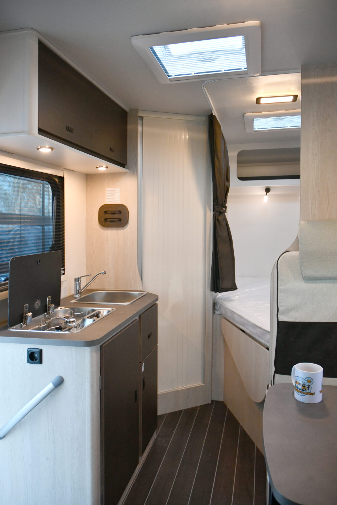 Aneks kuchenny został kompleksowo wyposażony – do dyspozycji użytkowników jest lodówka, zlewozmywak, dwupalnikowa kuchenka gazowa oraz praktyczny blat roboczy, który znacząco ułatwia przygotowywanie posiłków w trakcie podróży. Kamper oferuje również szafę z drążkiem na wieszaki, dedykowane miejsce na telewizor oraz liczne półki i schowki, zapewniające wygodne i bezpieczne przechowywanie bagażu oraz akcesoriów.