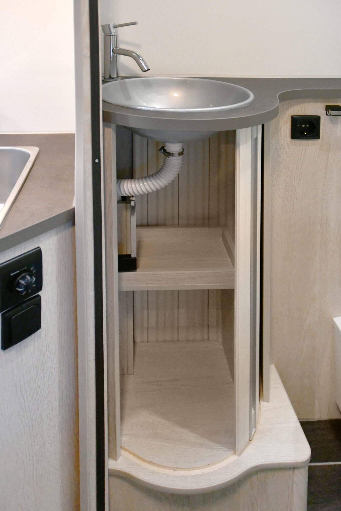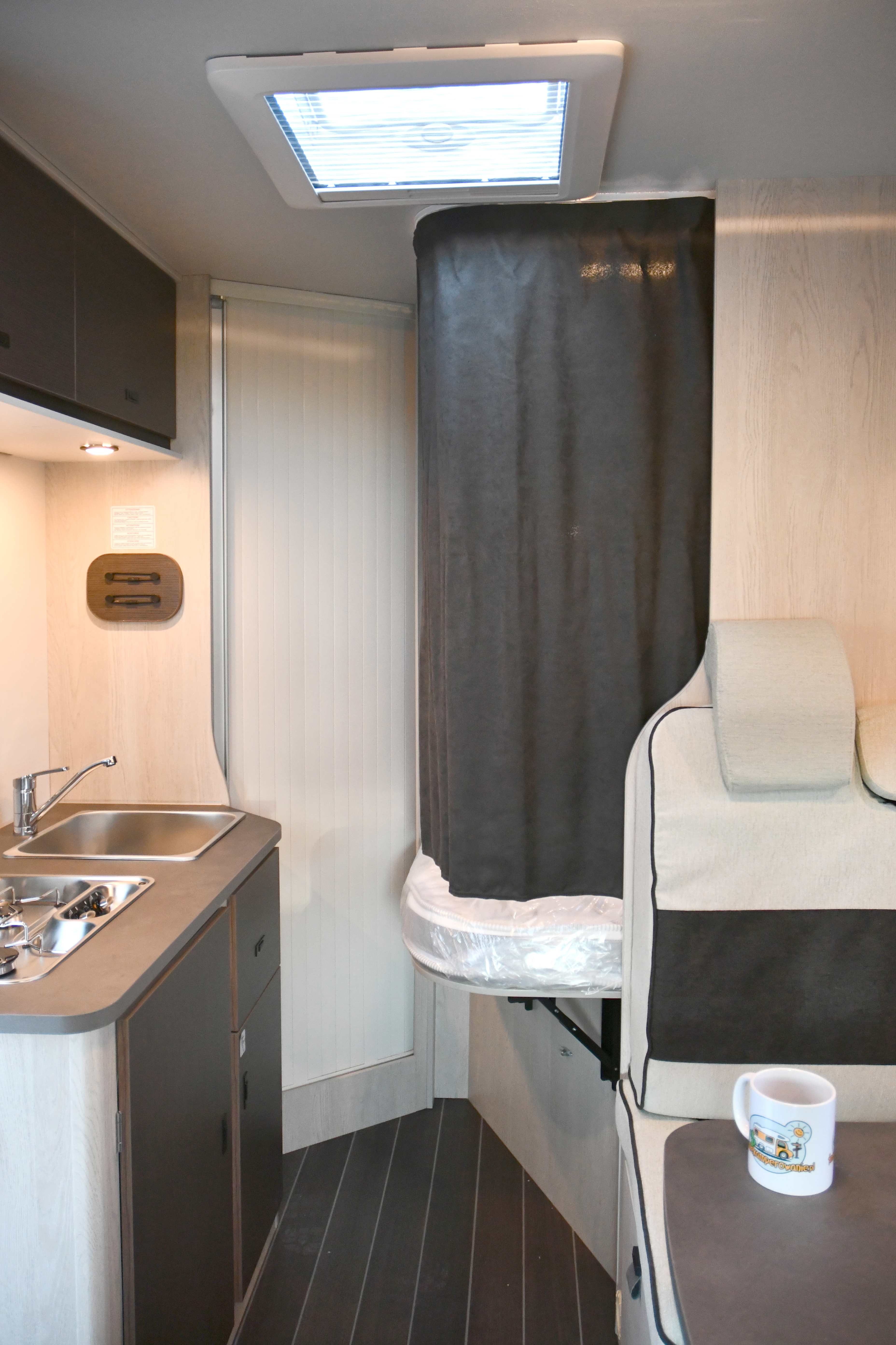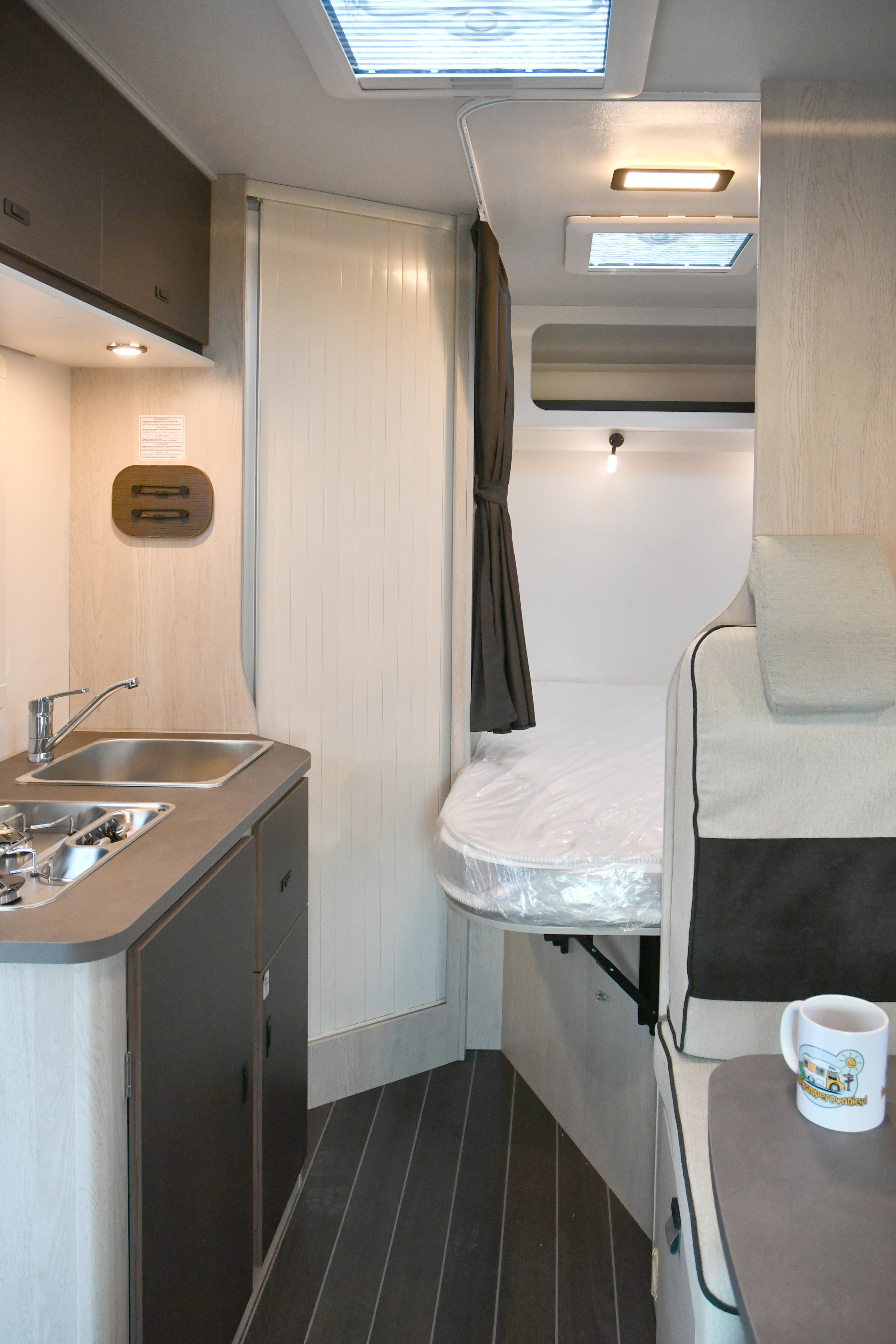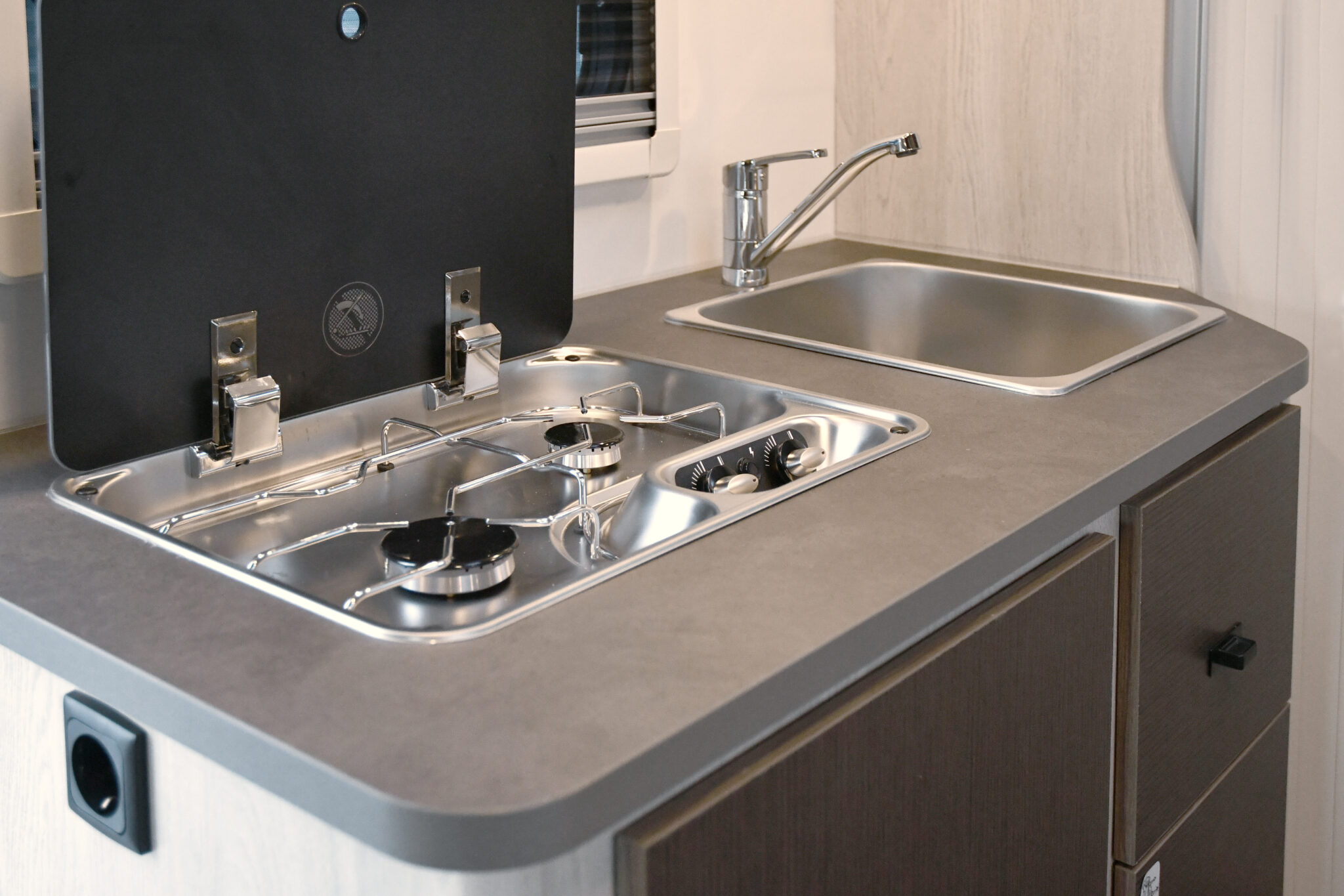 Aneks kuchenny został kompleksowo wyposażony – do dyspozycji użytkowników jest lodówka, zlewozmywak, dwupalnikowa kuchenka gazowa oraz praktyczny blat roboczy, który znacząco ułatwia przygotowywanie posiłków w trakcie podróży. Kamper oferuje również szafę z drążkiem na wieszaki, dedykowane miejsce na telewizor oraz liczne półki i schowki, zapewniające wygodne i bezpieczne przechowywanie bagażu oraz akcesoriów.