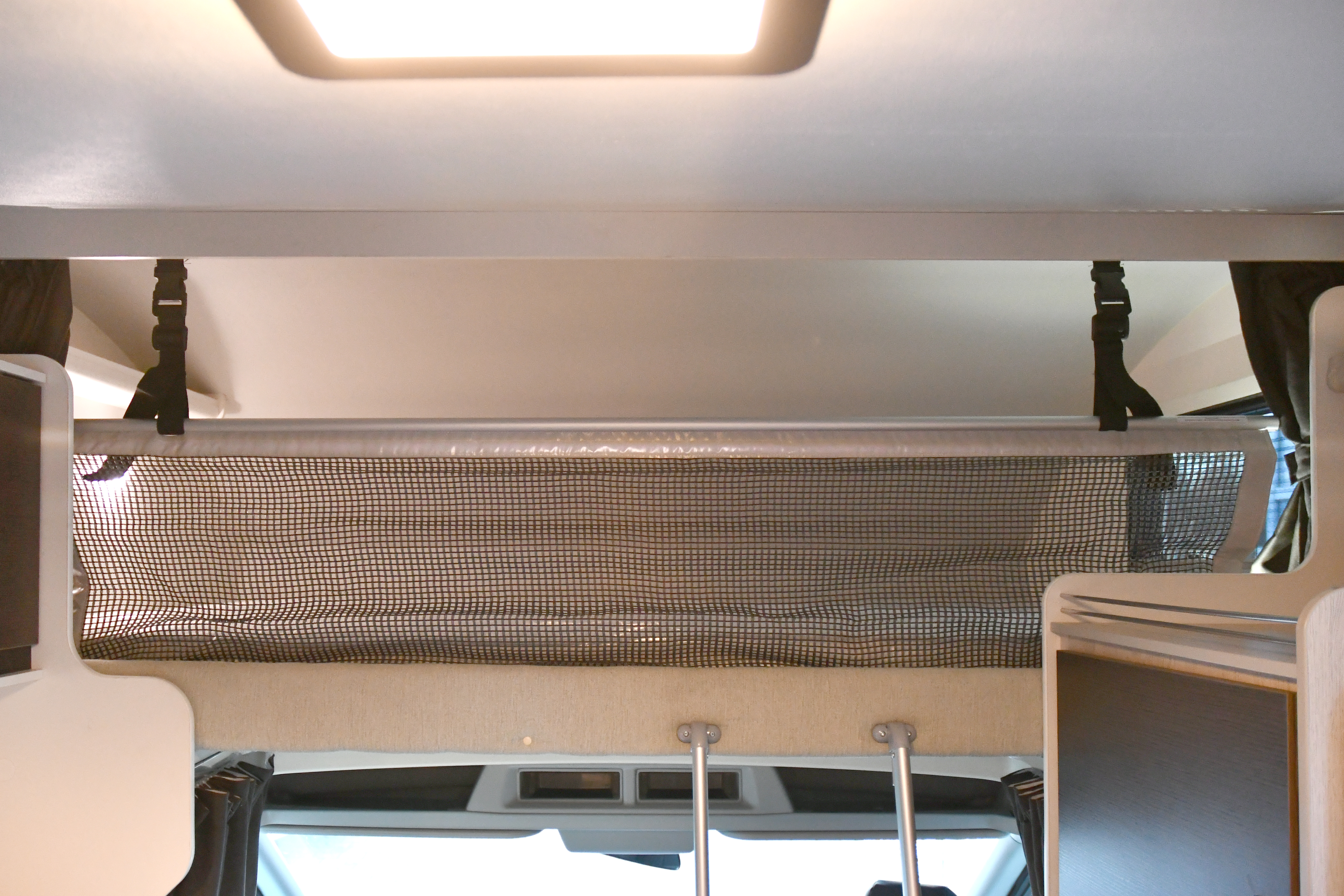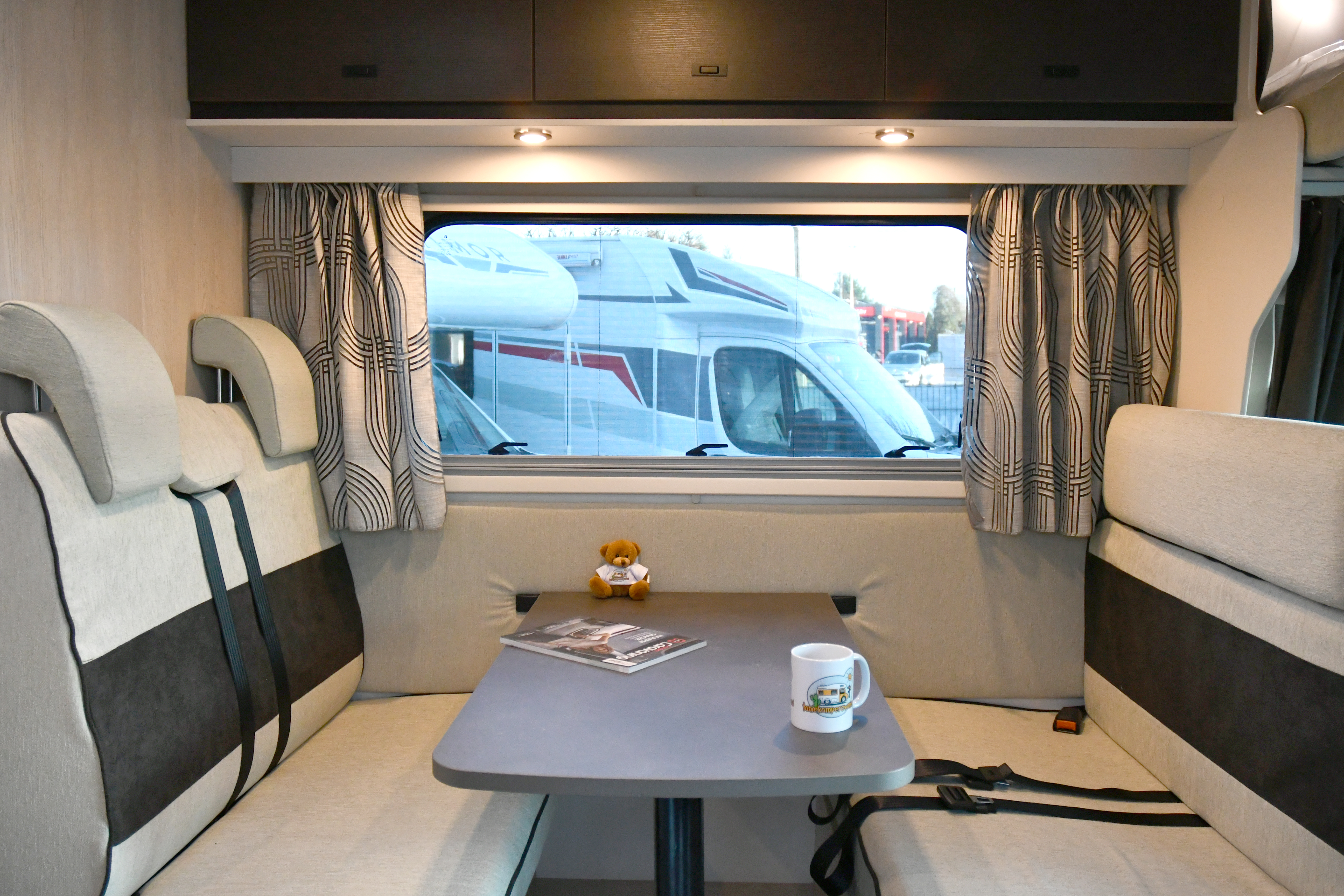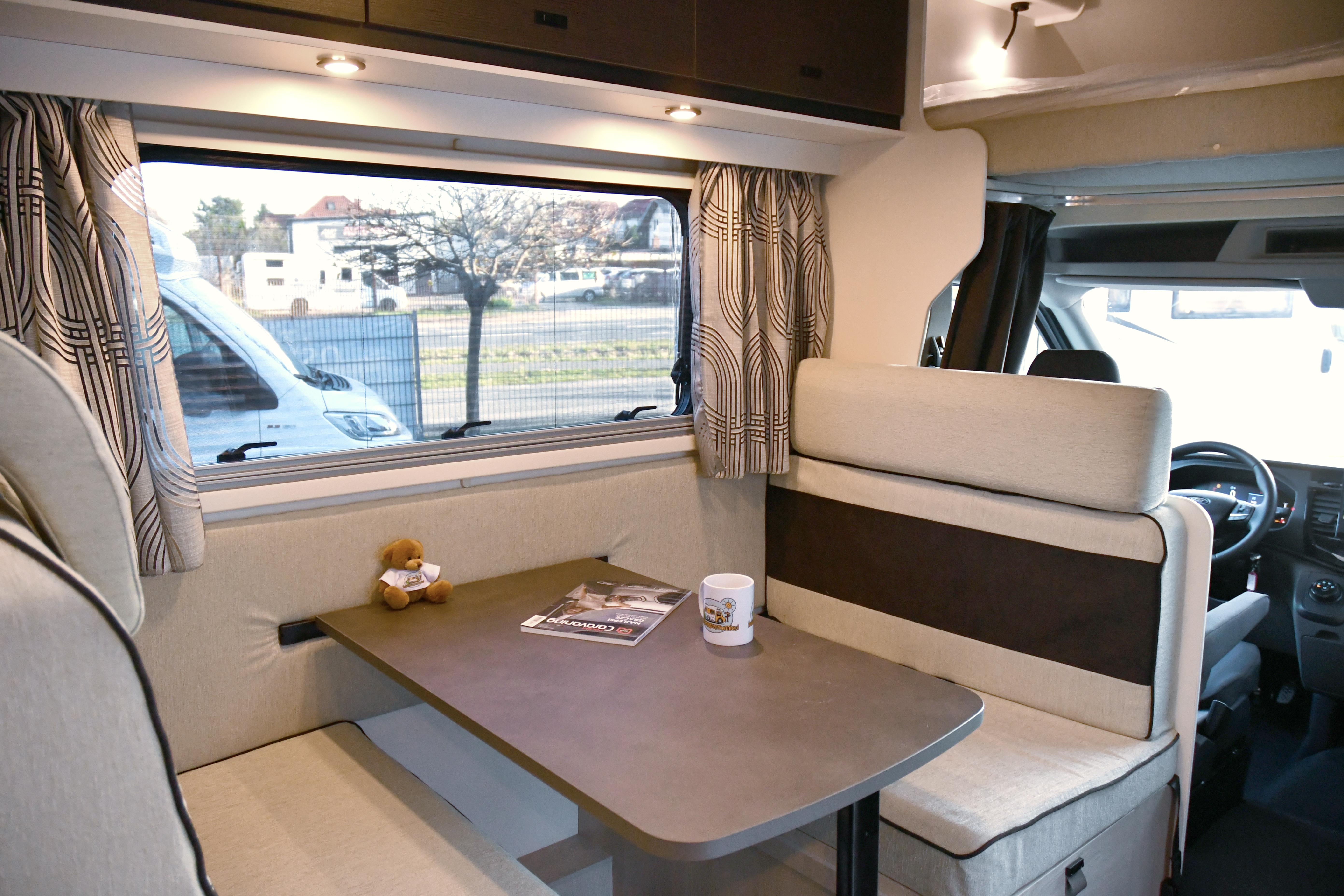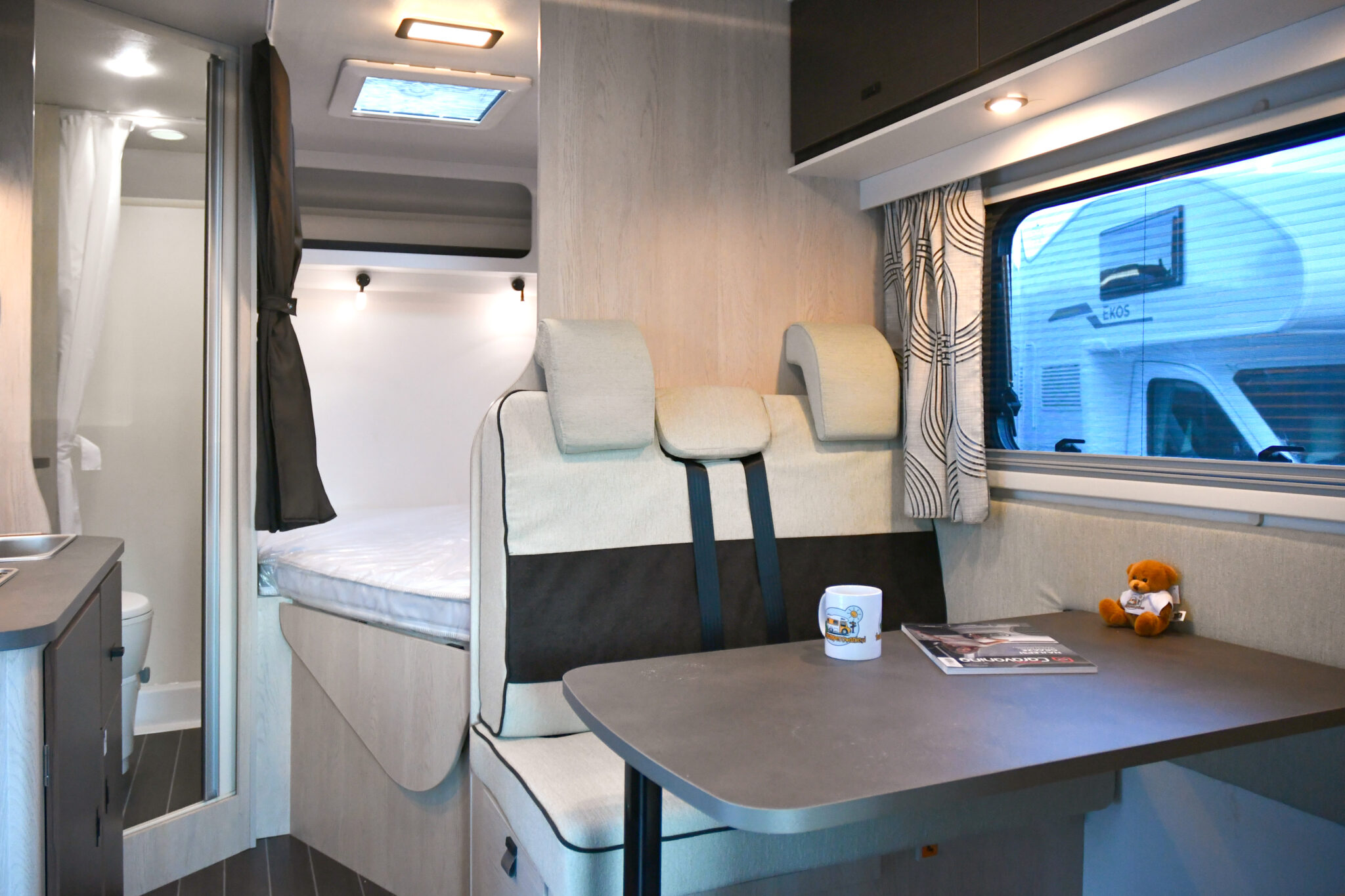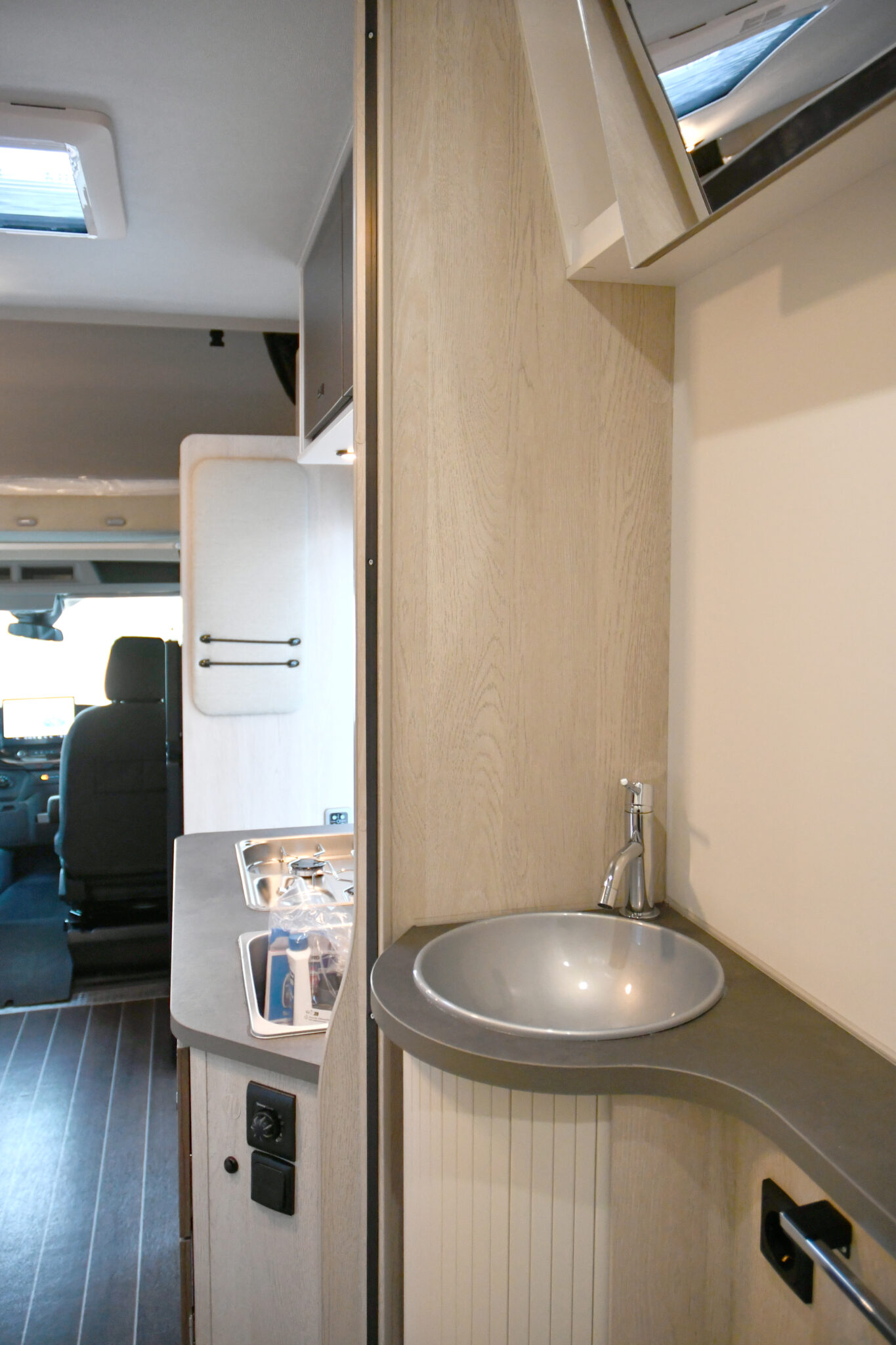 Aneks kuchenny został kompleksowo wyposażony – do dyspozycji użytkowników jest lodówka, zlewozmywak, dwupalnikowa kuchenka gazowa oraz praktyczny blat roboczy, który znacząco ułatwia przygotowywanie posiłków w trakcie podróży. Kamper oferuje również szafę z drążkiem na wieszaki, dedykowane miejsce na telewizor oraz liczne półki i schowki, zapewniające wygodne i bezpieczne przechowywanie bagażu oraz akcesoriów.
