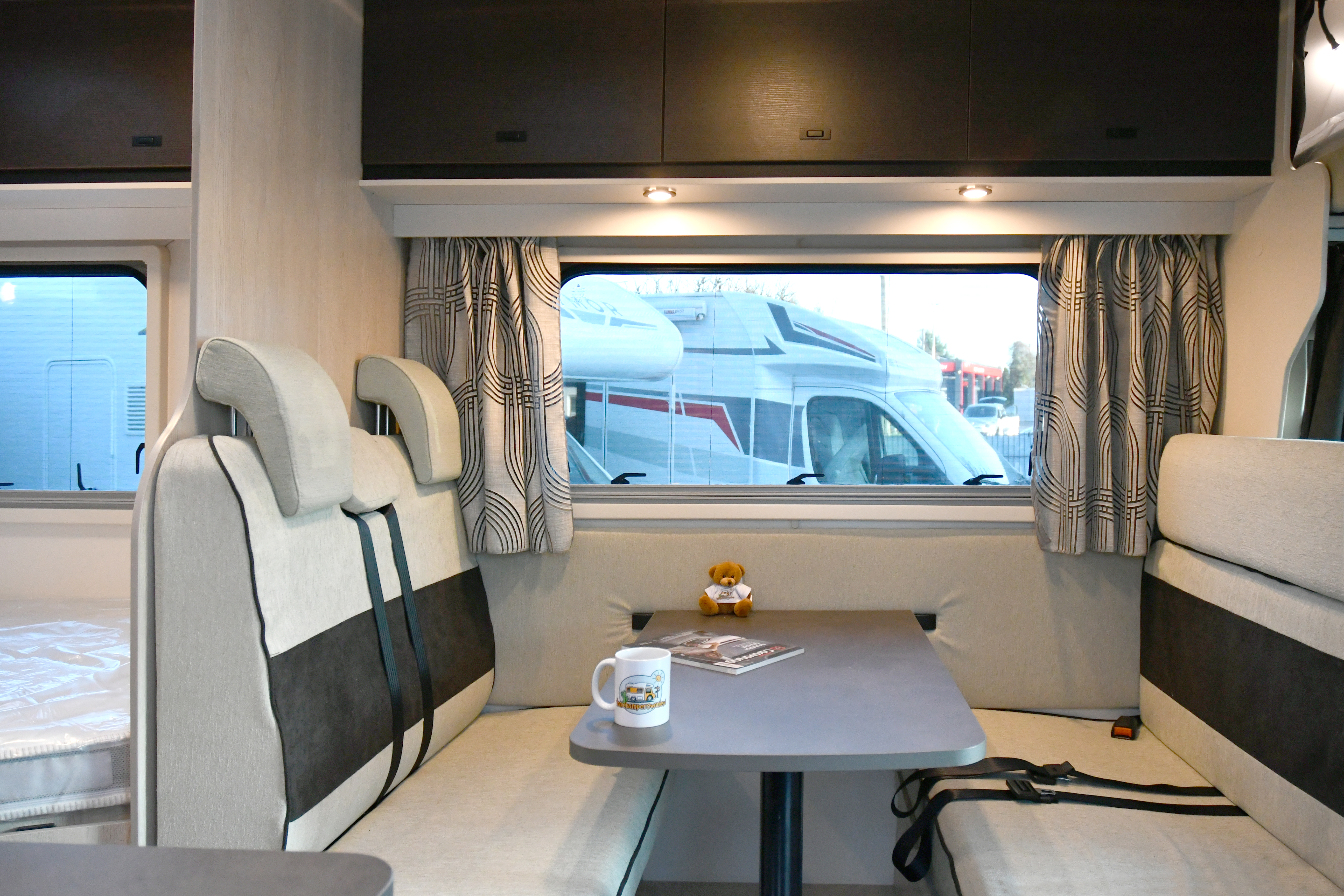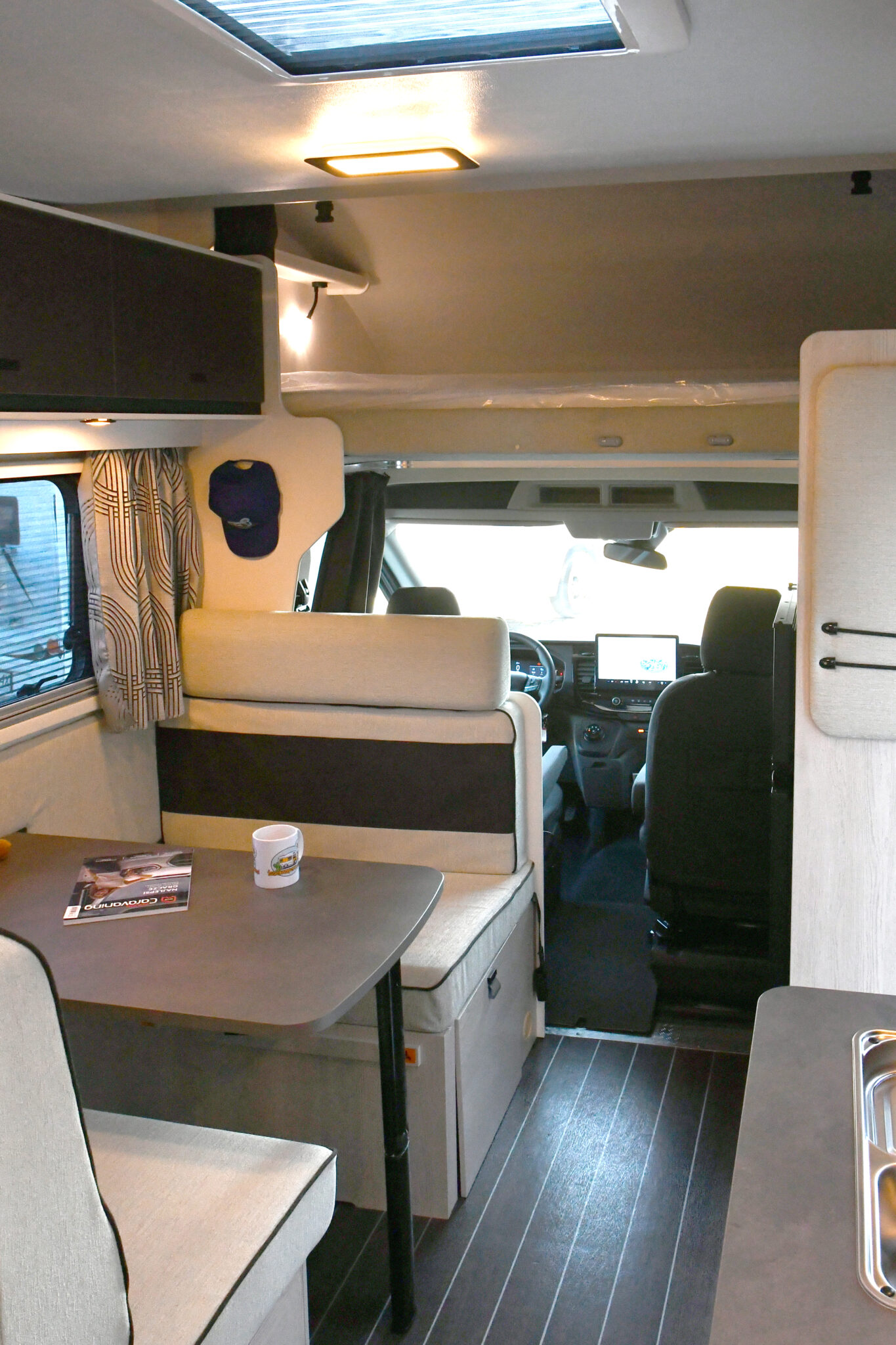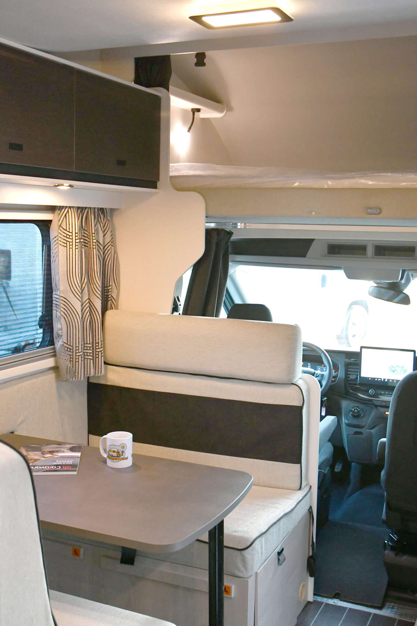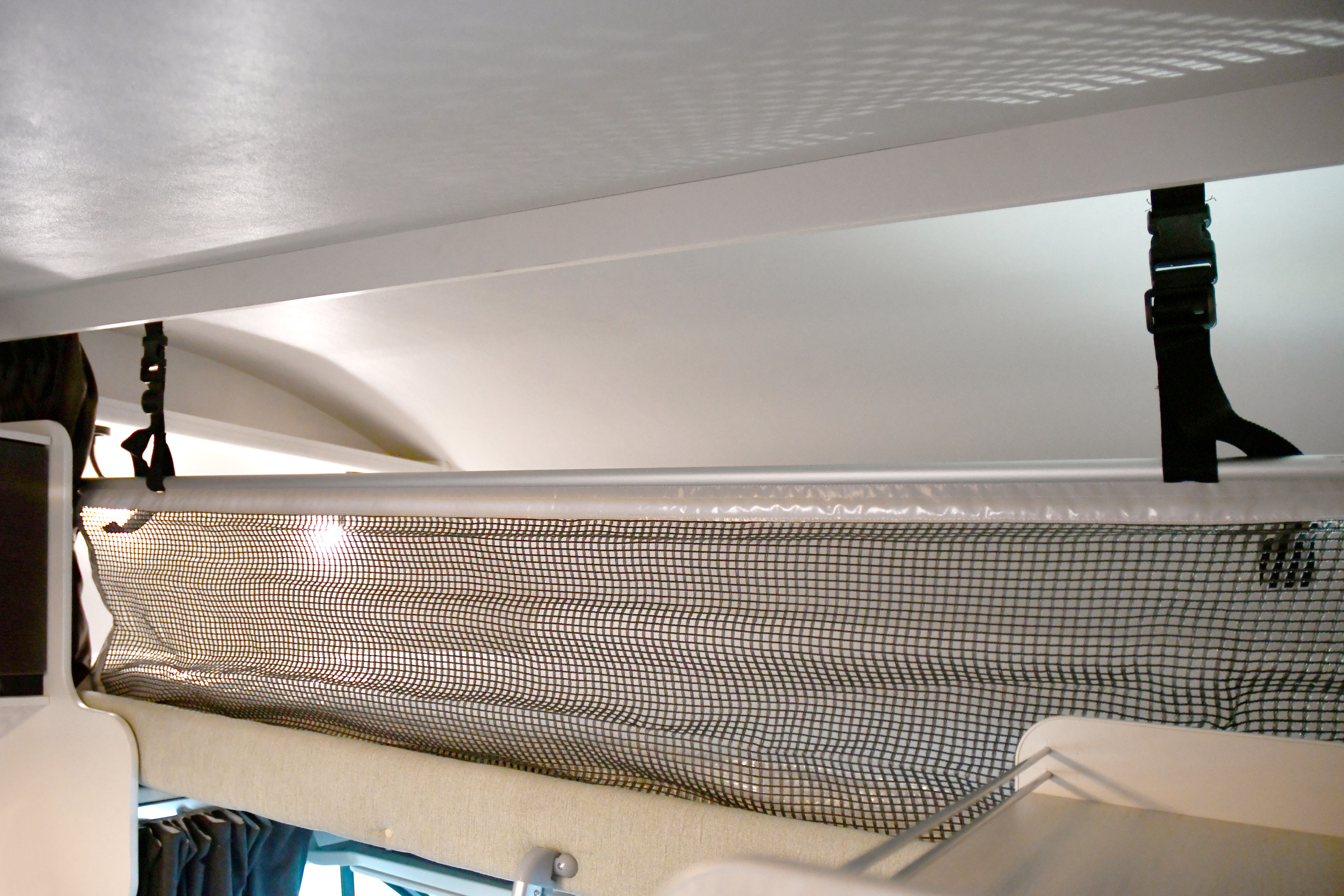 Aneks kuchenny został kompleksowo wyposażony – do dyspozycji użytkowników jest lodówka, zlewozmywak, dwupalnikowa kuchenka gazowa oraz praktyczny blat roboczy, który znacząco ułatwia przygotowywanie posiłków w trakcie podróży. Kamper oferuje również szafę z drążkiem na wieszaki, dedykowane miejsce na telewizor oraz liczne półki i schowki, zapewniające wygodne i bezpieczne przechowywanie bagażu oraz akcesoriów.