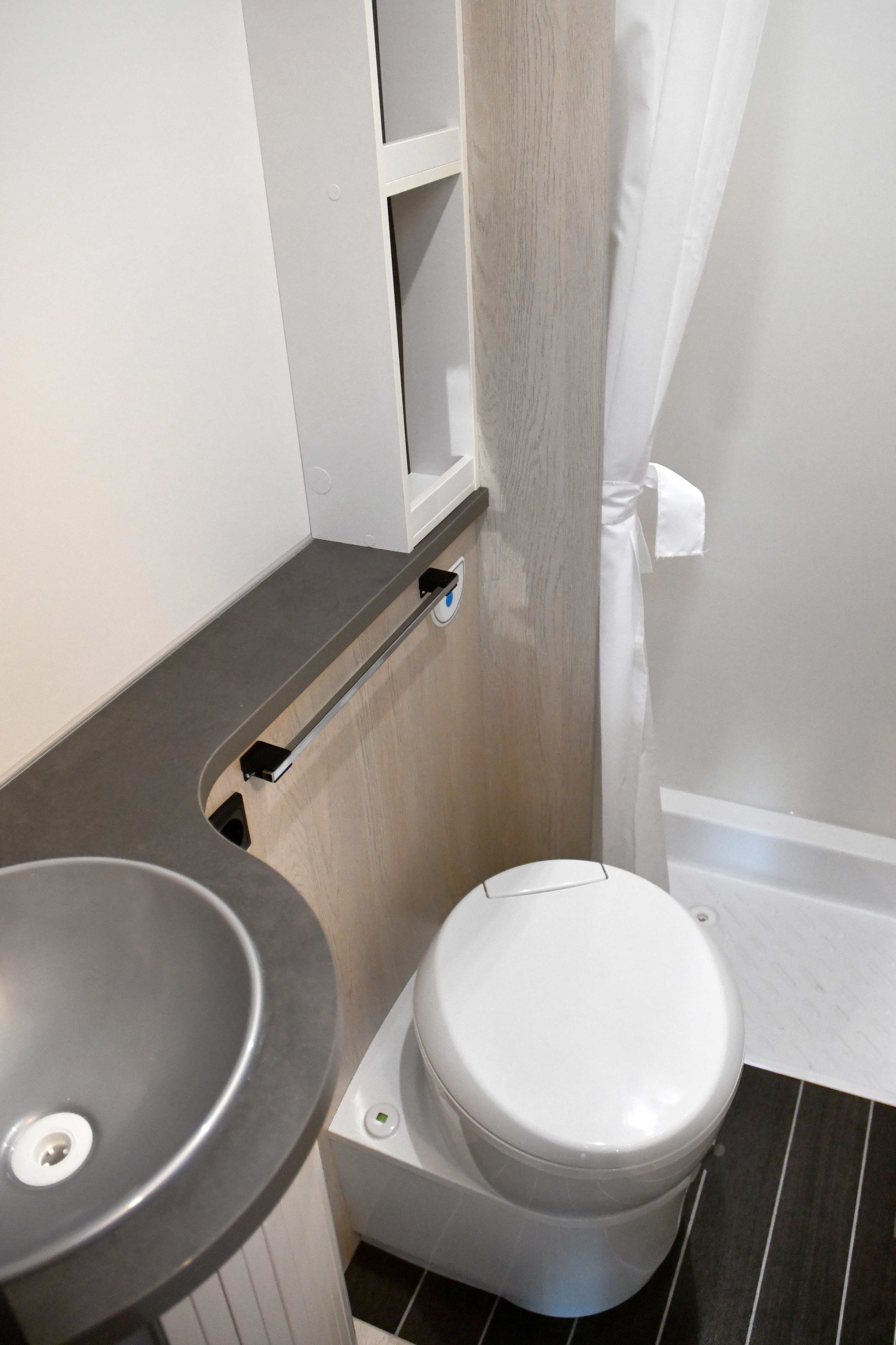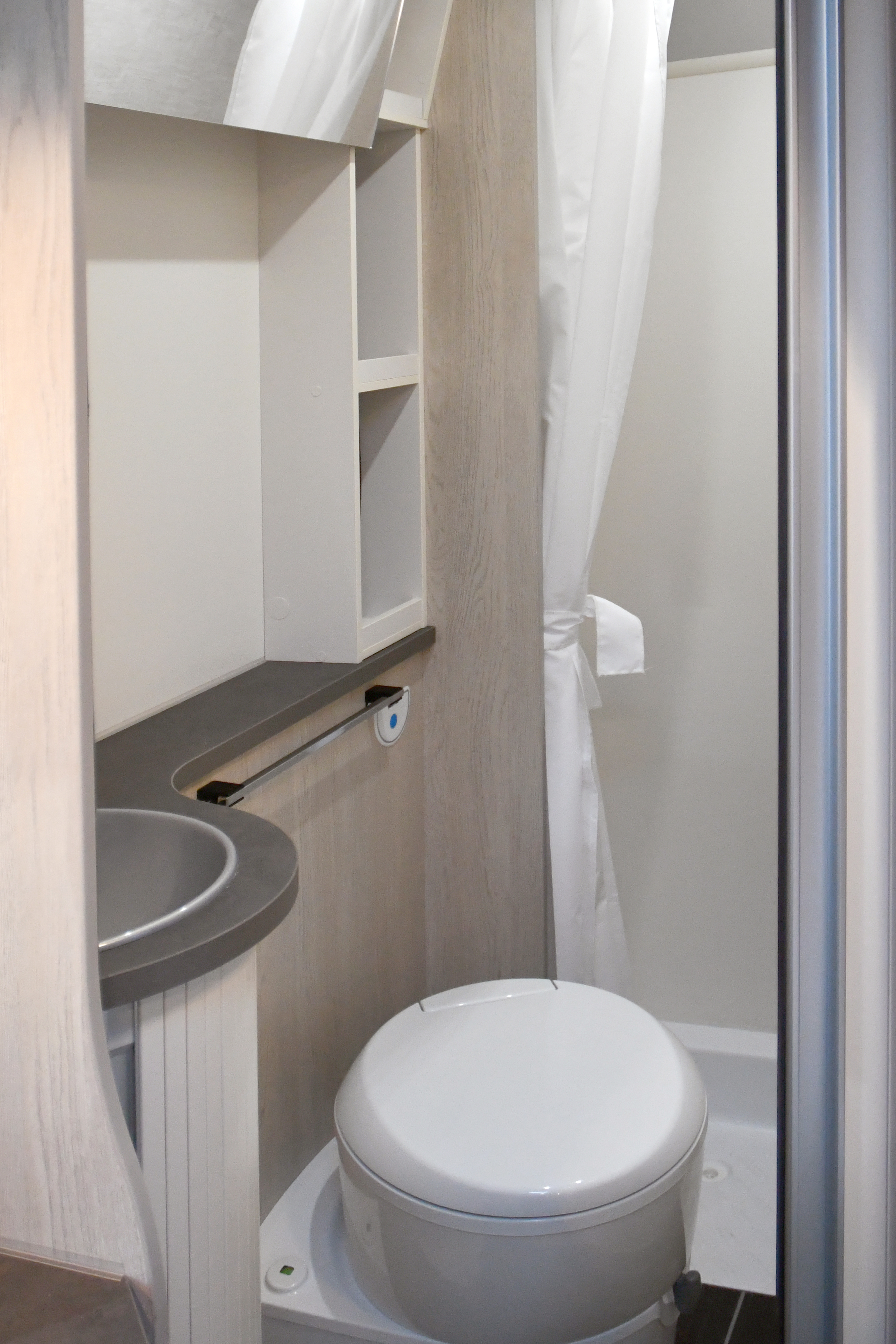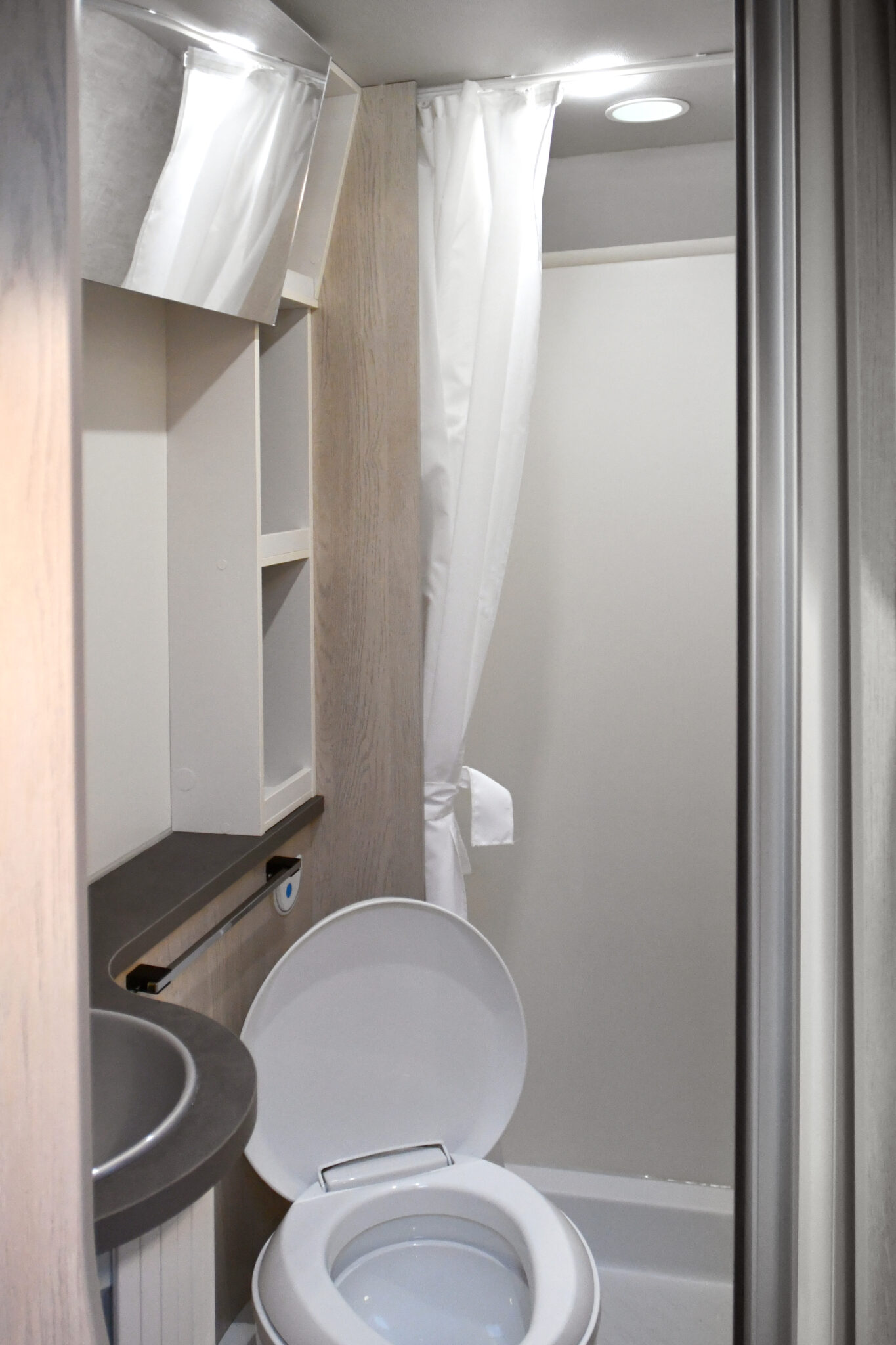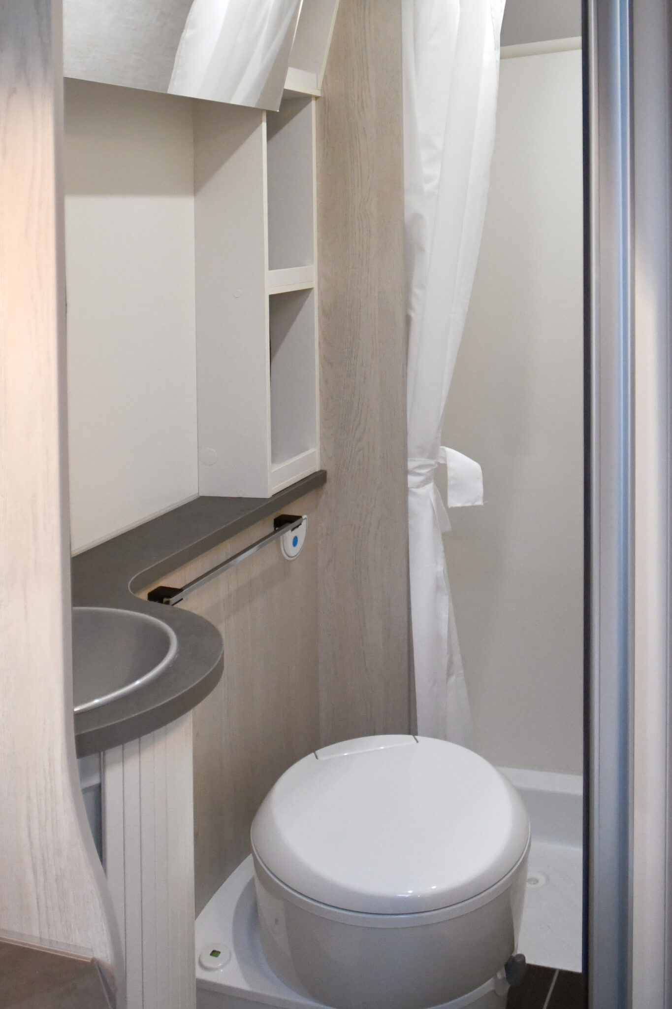 Na szczególną uwagę zasługuje komfortowa łazienka z oddzielnym prysznicem – rozwiązanie rzadko spotykane w kamperach tej klasy wielkości, które znacząco podnosi standard codziennego użytkowania.