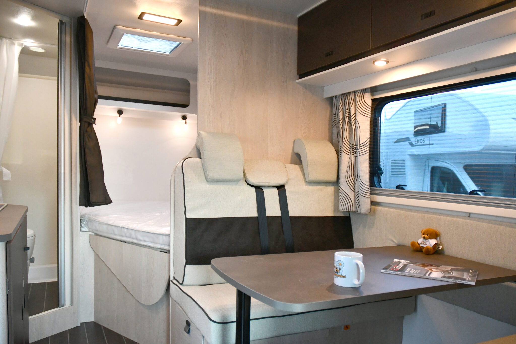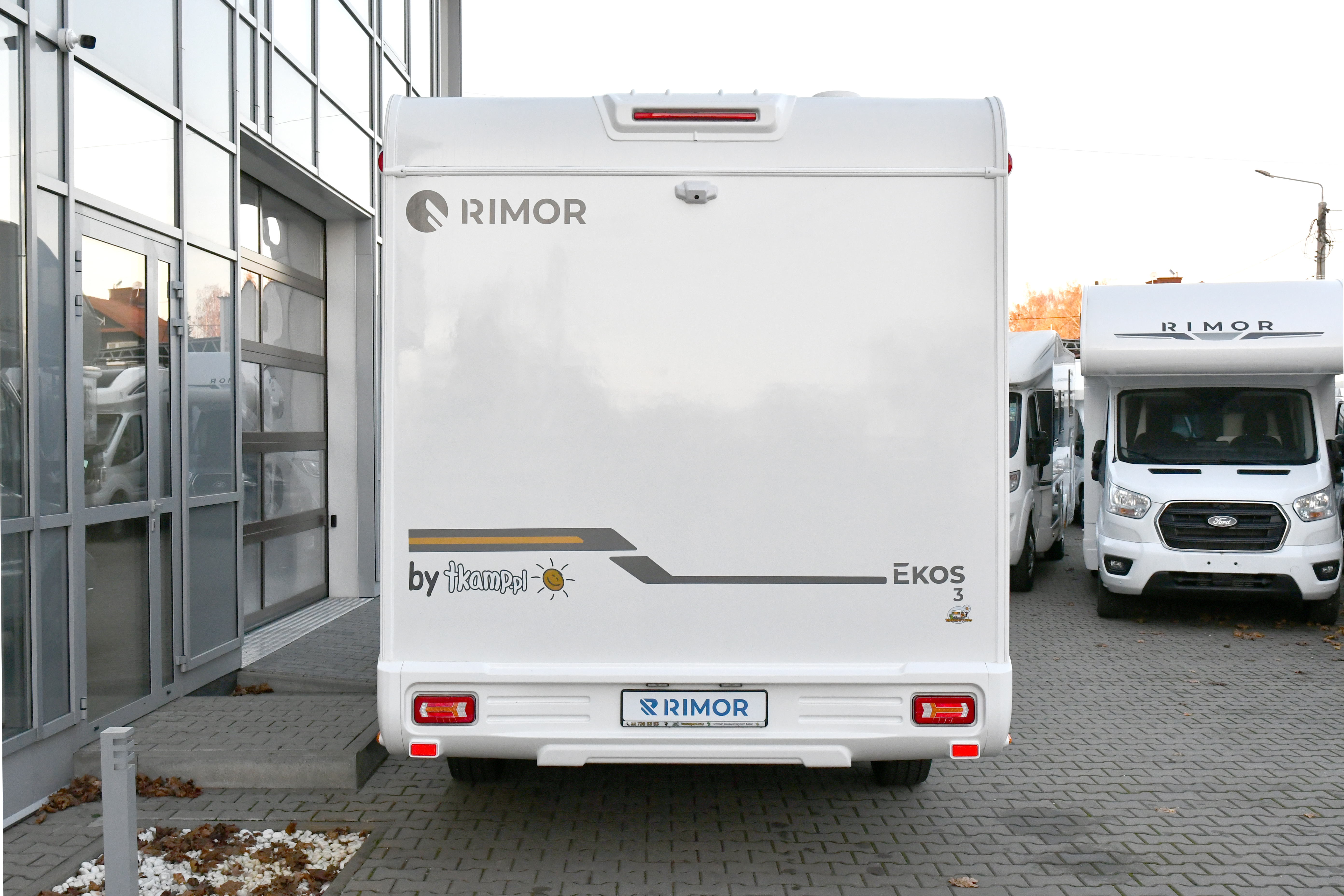 EKOS 3 to kompaktowy kamper z alkową o długości 6455 mm, zaprojektowany z myślą o maksymalnym komforcie podróżowania dla większej liczby osób – bez kompromisów w zakresie zwrotności i łatwości prowadzenia. Krótkie nadwozie w połączeniu z przemyślaną zabudową sprawia, że model ten doskonale sprawdza się zarówno w trasie, jak i podczas manewrowania w miejskich przestrzeniach.